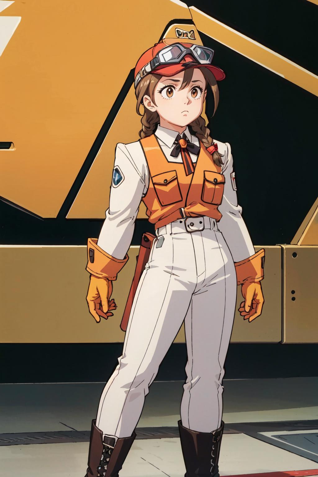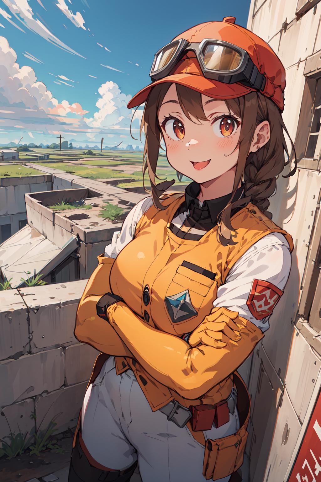 Orange Vest,Brown Hair,Red Hat,Visor Cap,Goggles on Head,White Long Sleeve Shirt,Pants,Boots
