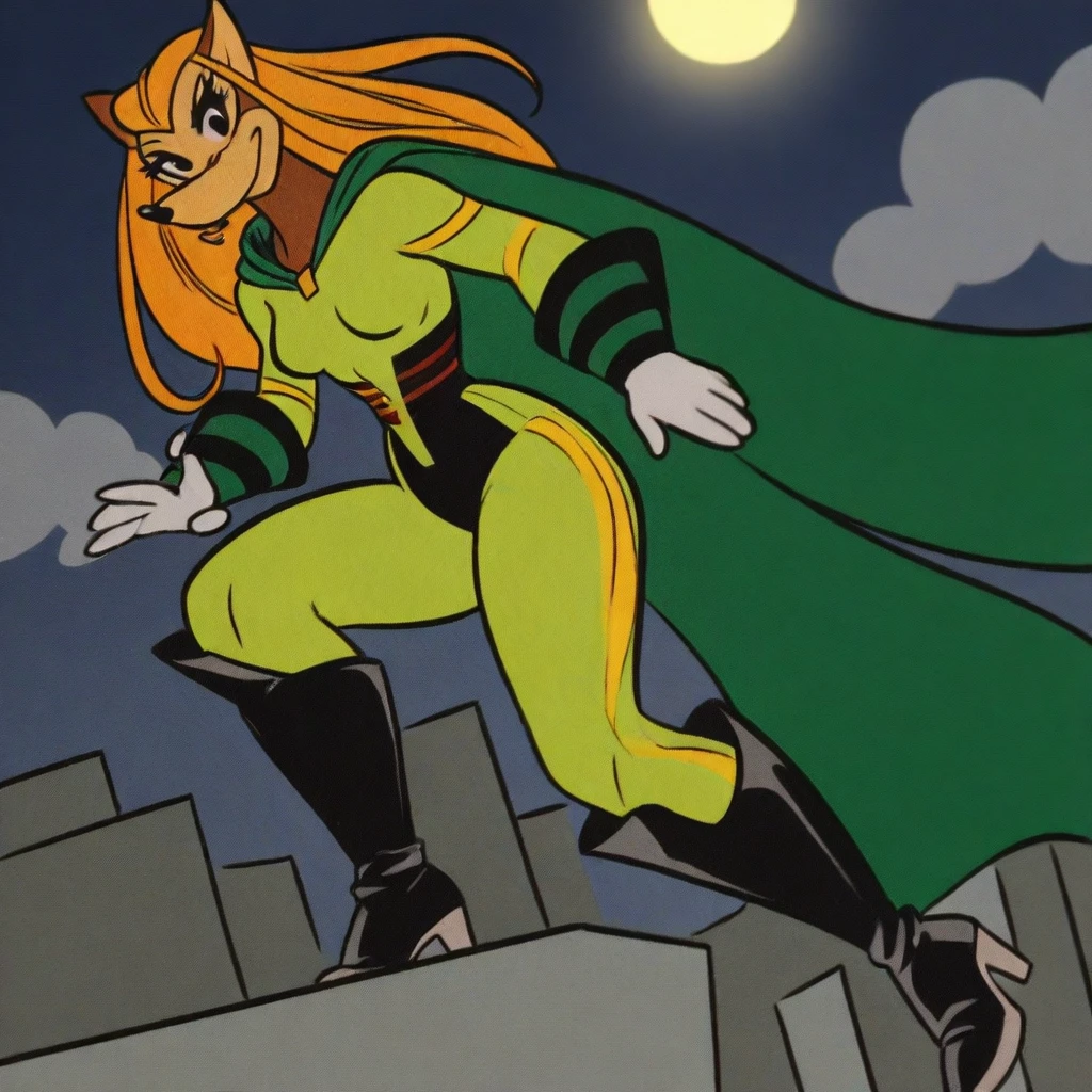 super hero clothes, bodysuit, light green bodysuit, dark green cape, arm armor, black high heels boots, white gloves,