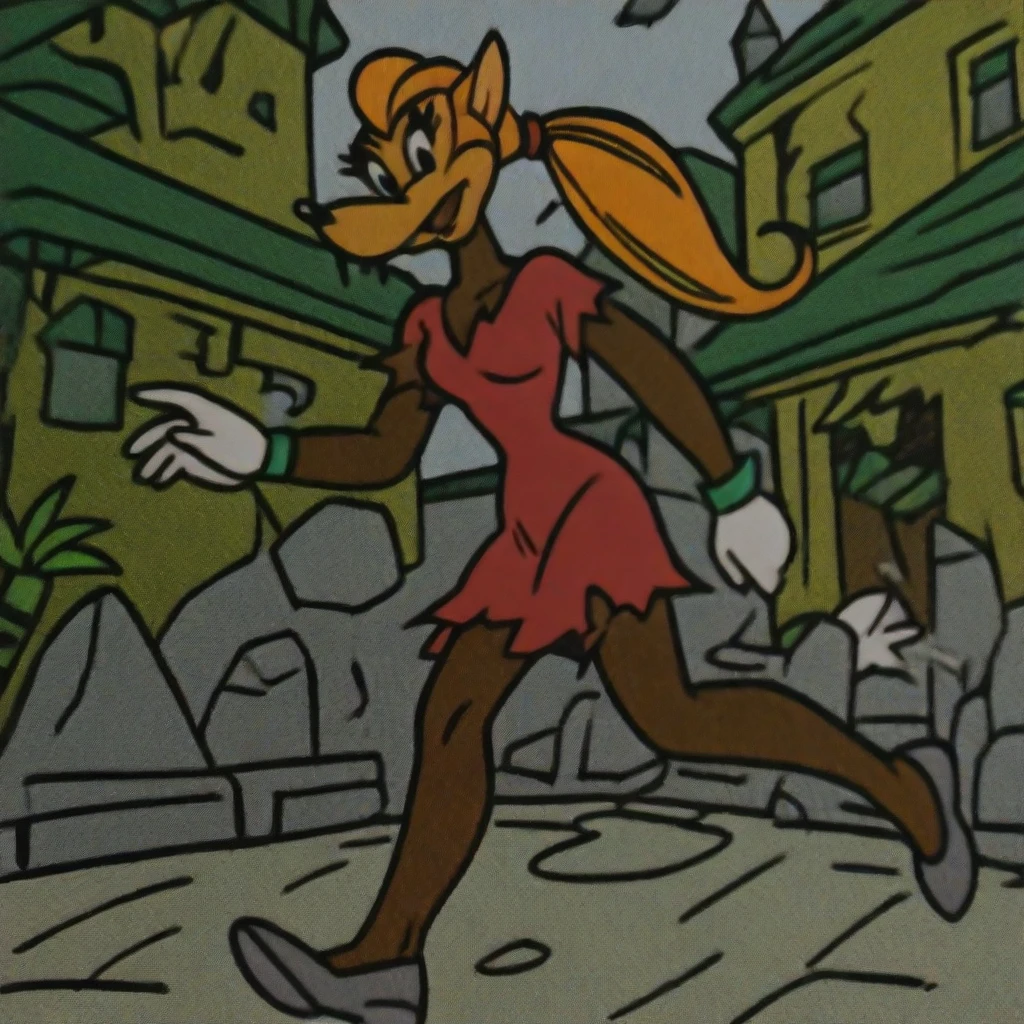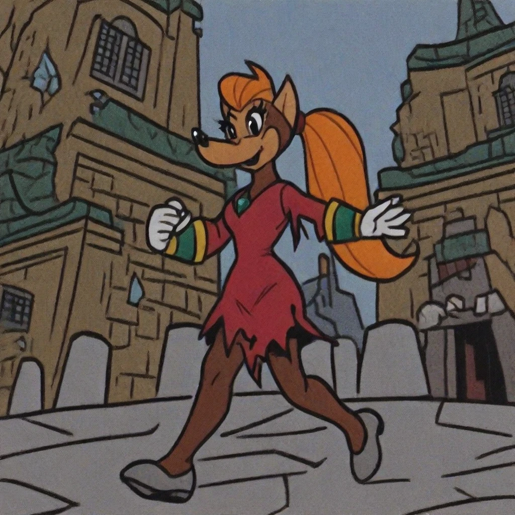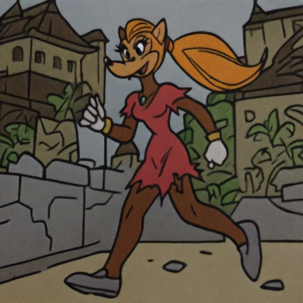 ireyon, solo, fox, furry female, fox ears, snout, orange hair, long hair, pony tail, black eyes, red short dress, torn dress, bare legs, white gloves, gray old shoes, gold armlets,