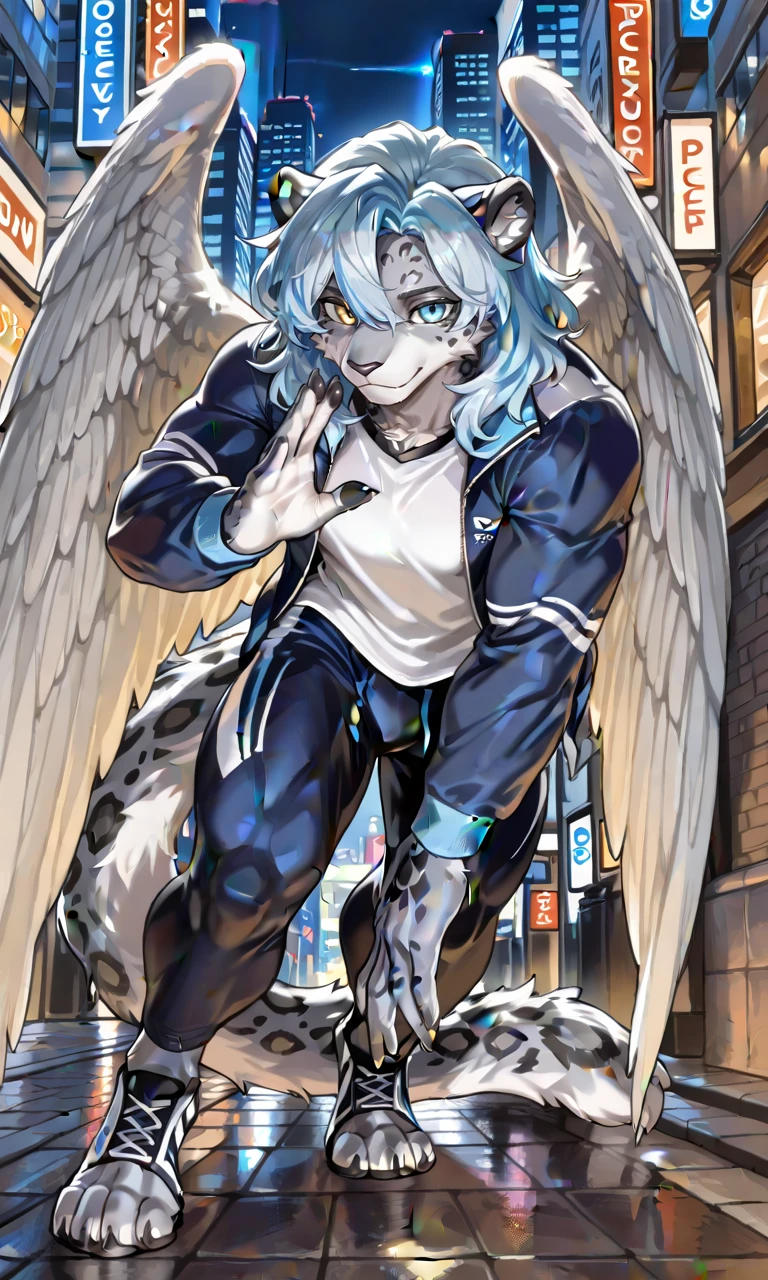 The trigger words are as follows: furry male, leopard, silver gray fur, royal blue hair, golden eyes, feathered wings (angel wings), very muscular