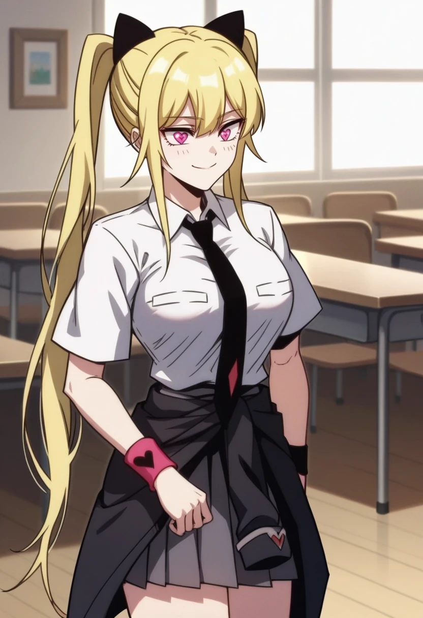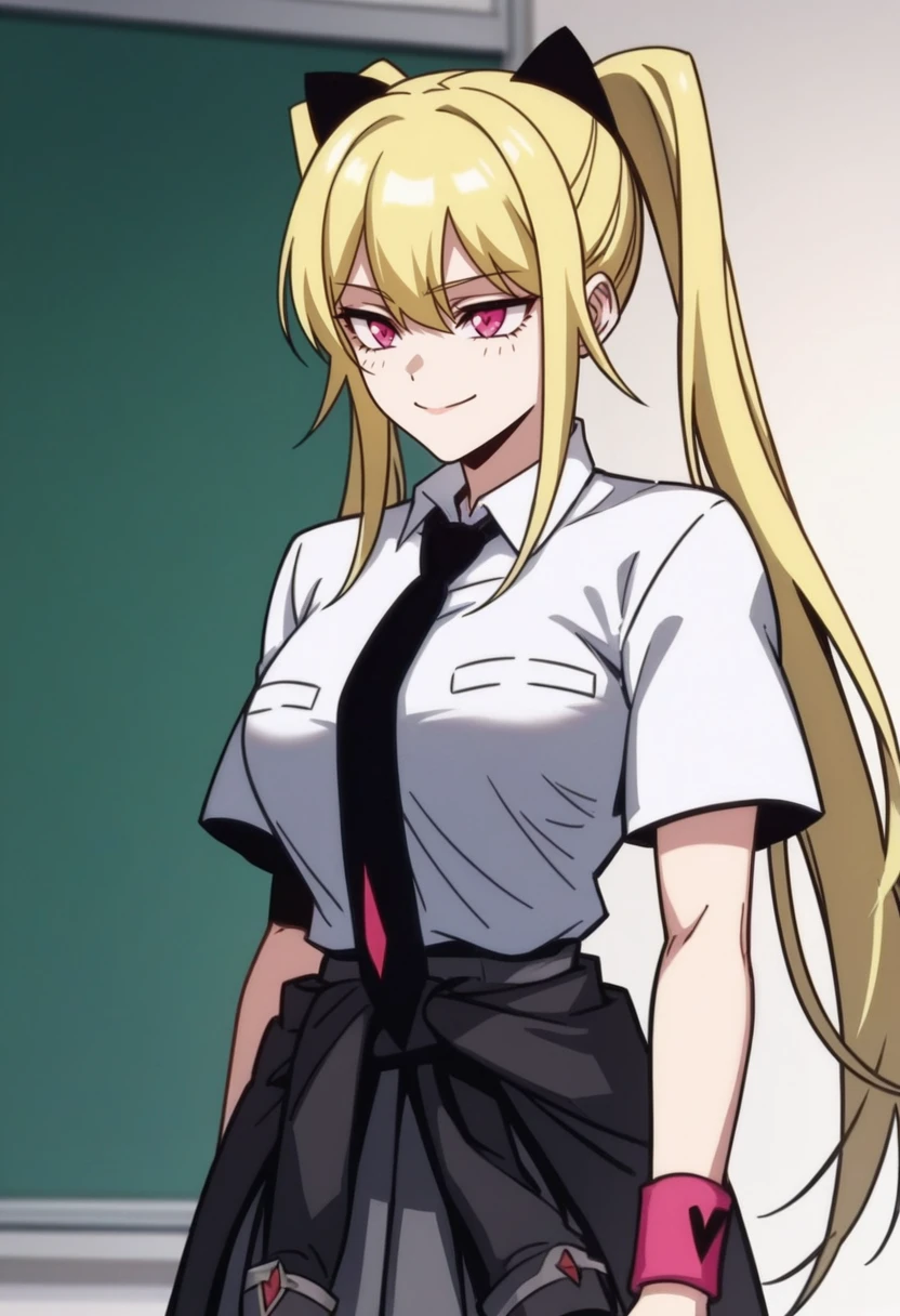 Rachel, 1girl, pink eyes, blonde hair, twintails, hair ornament,
