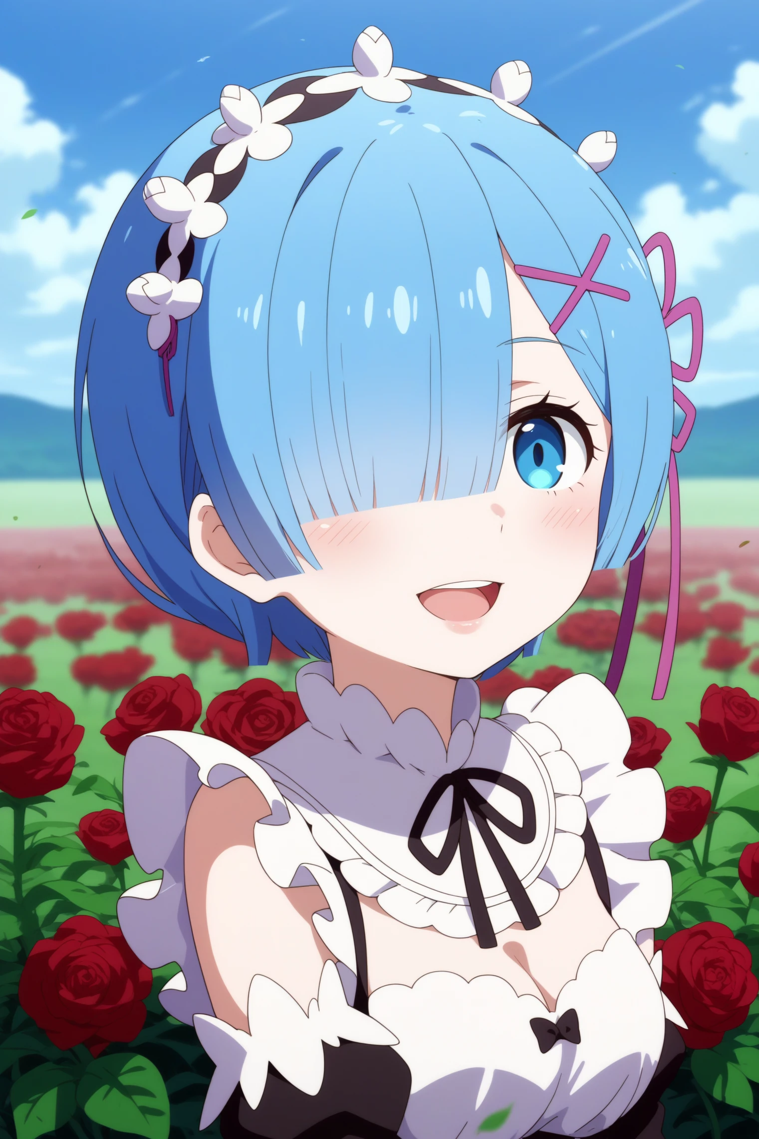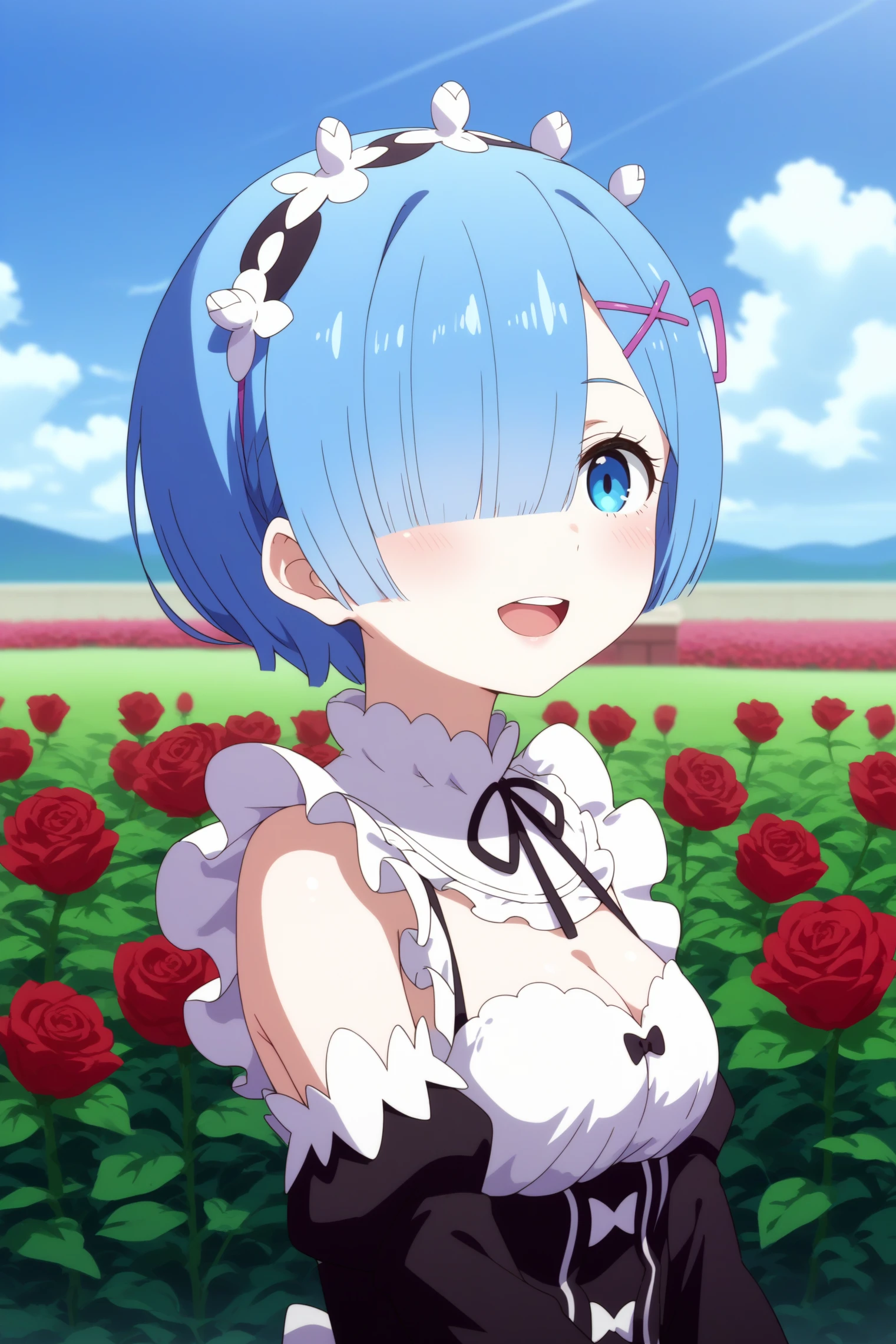 Triggers : 1girl,solo,rem,roswaal mansion maid uniform,short hair,maid,hair over one eye,one eye visible,hair ornament,detached sleeves,x hair ornament,ribbon,aid headdress