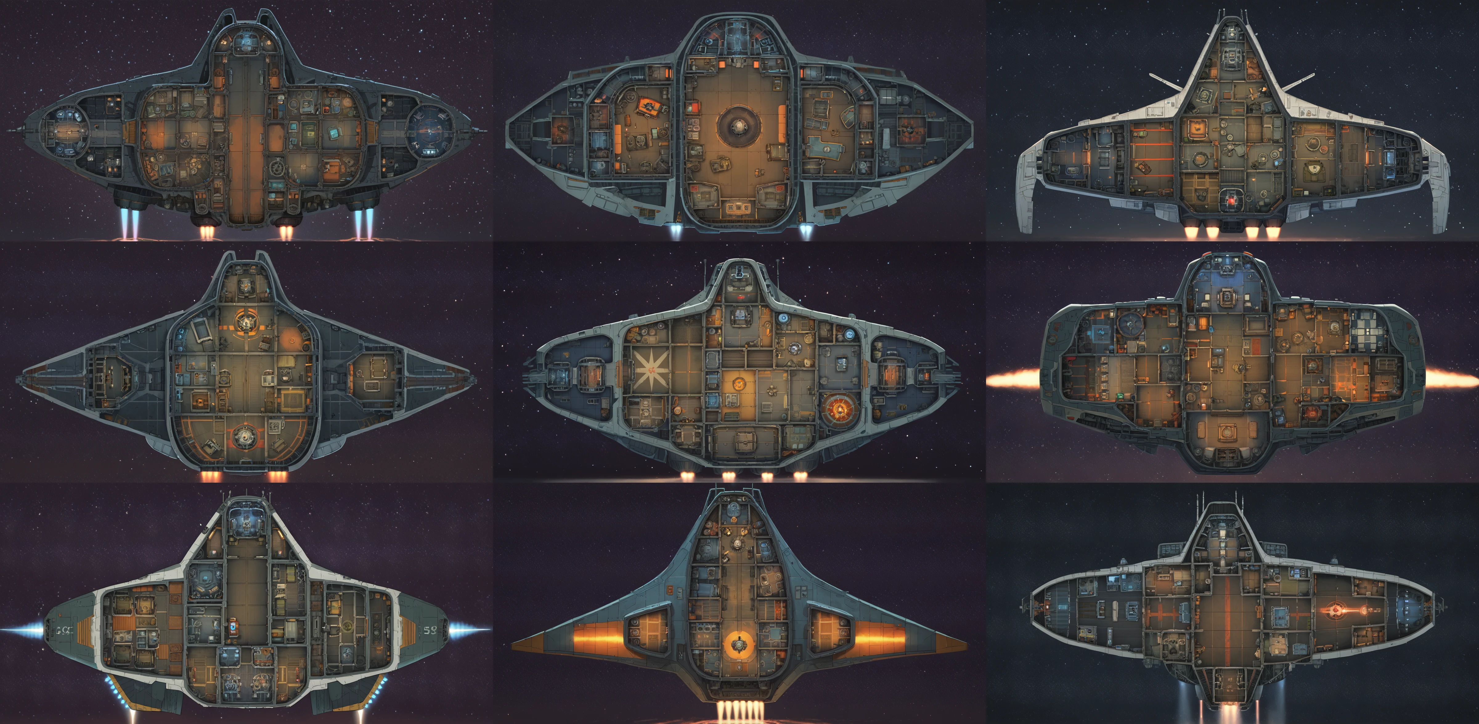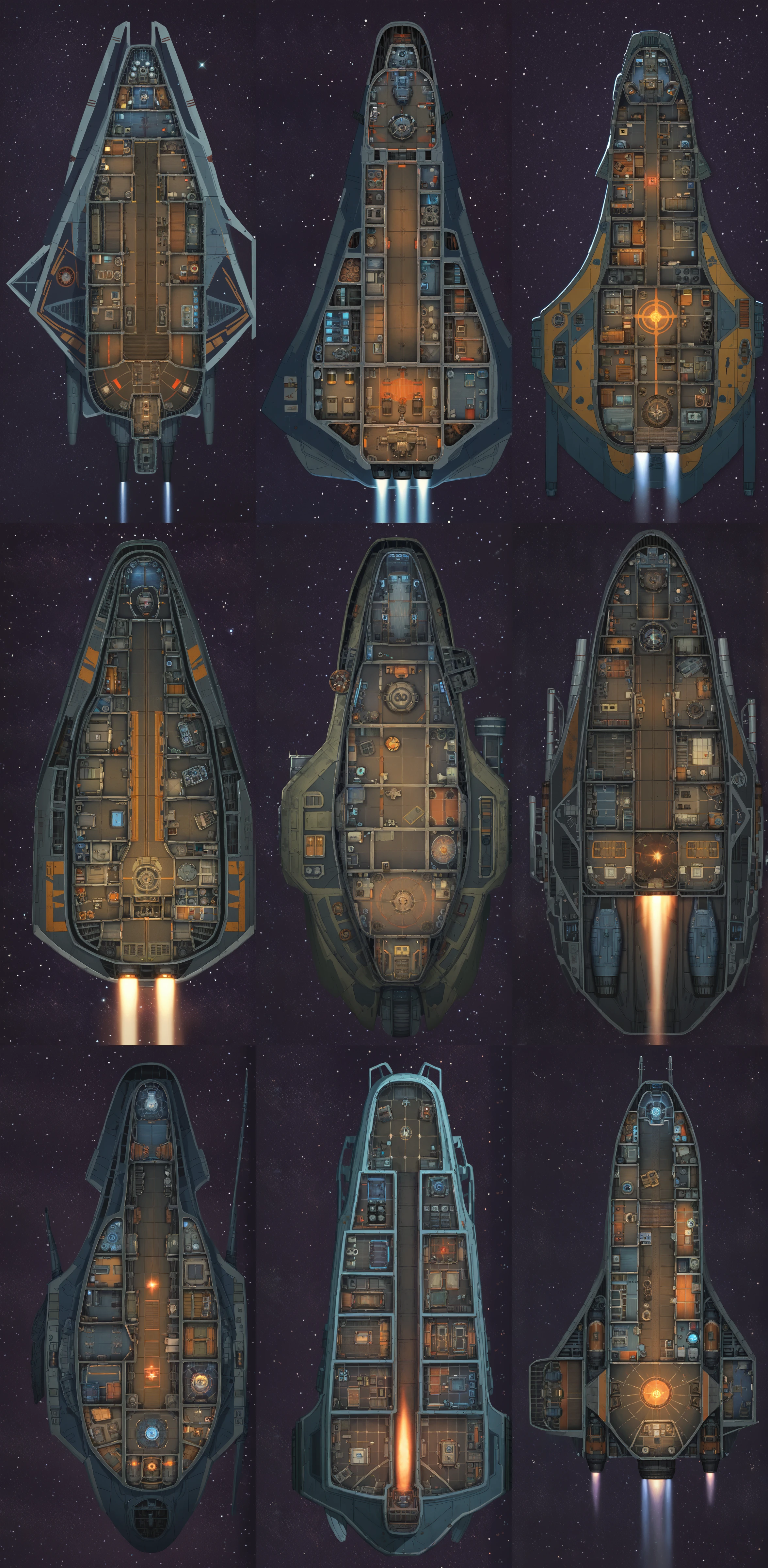 This is an attempt to bring Tomas Aguilar's Starfinder spaceship LoRA into Pony. Unfortunately the maps look good in thumbnail view but on close inspection they are pretty poor. I've had the best results using Model: breakfastBeforeMidnight_v10 (Model hash: a22acac7cb), which doesn't produce too much unnecessary clutter and seems to stick pretty close to a grid alignment.