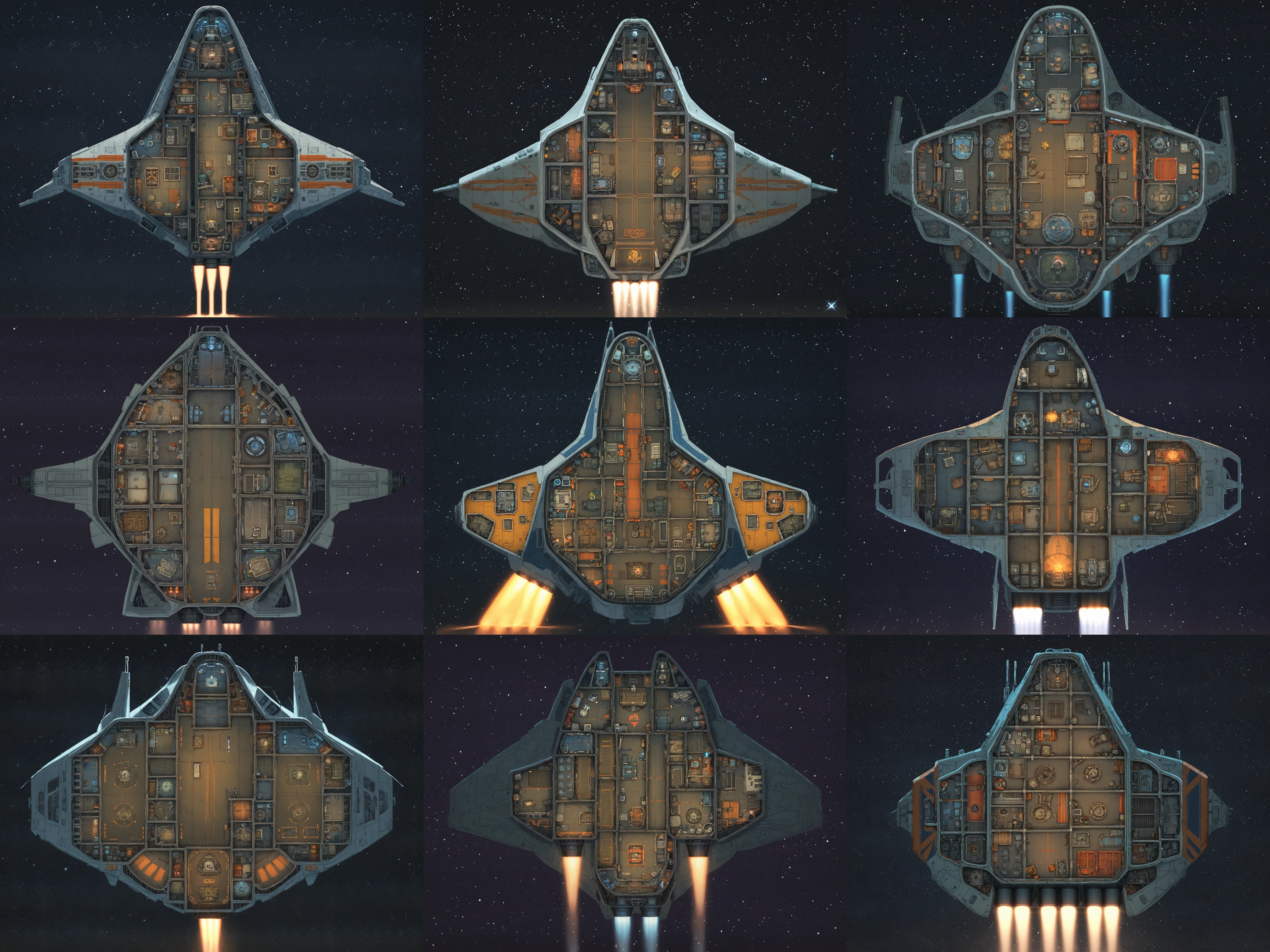 Prompt: score_9, score_8, score_7, score_6, <lora:Starship:1>, st4rsh1p, starry background, starship, deckplan, battlemap, thruster, asymmetrical