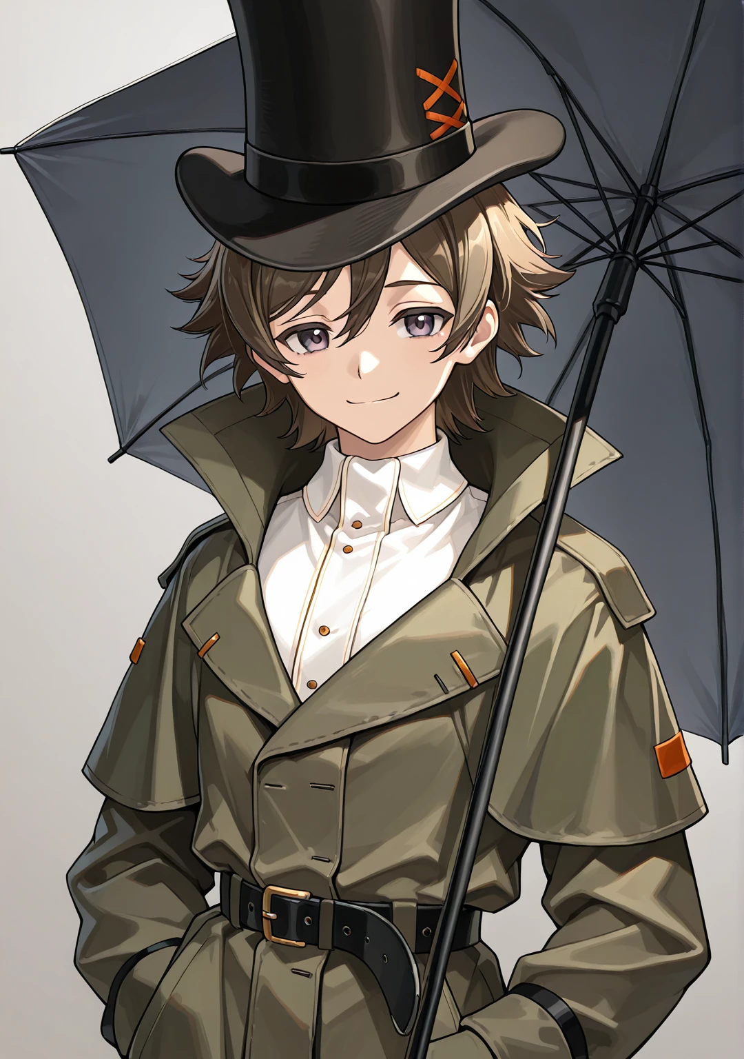 oliver fog, brown eyes, brown hair, default, coat, multicolored_hair, top hat, umbrella,