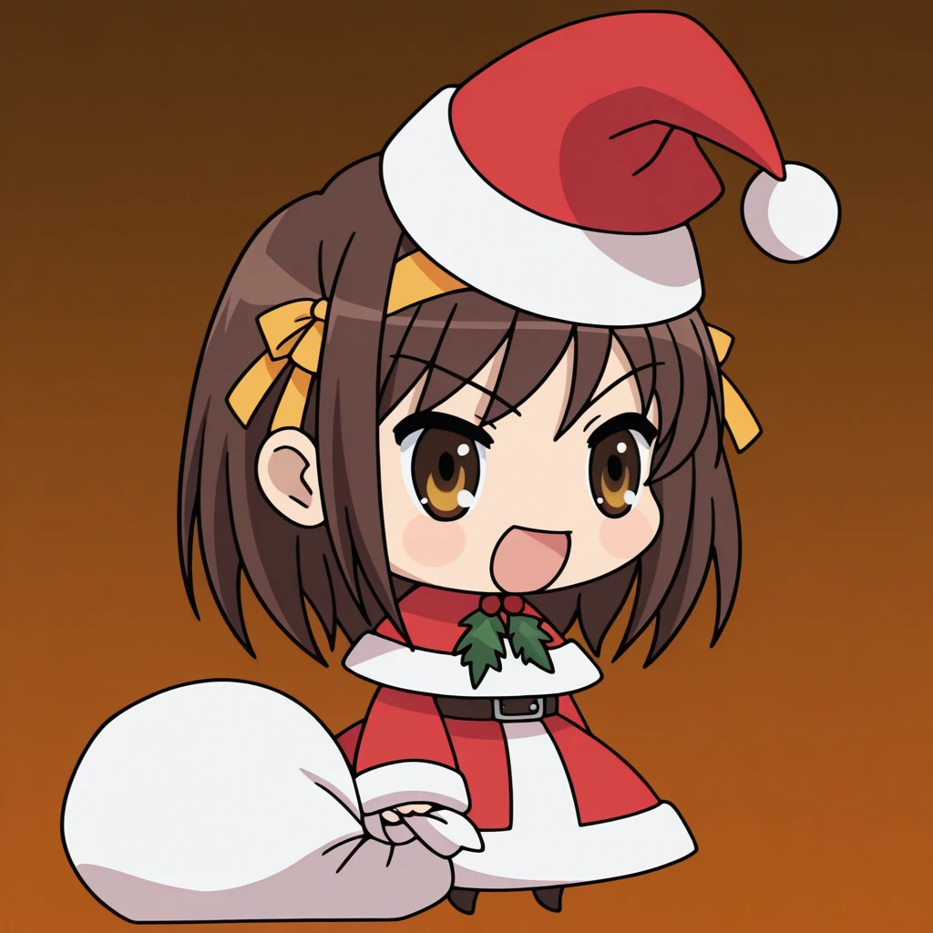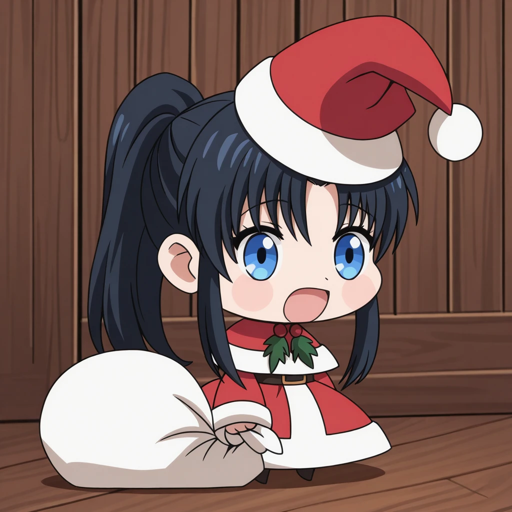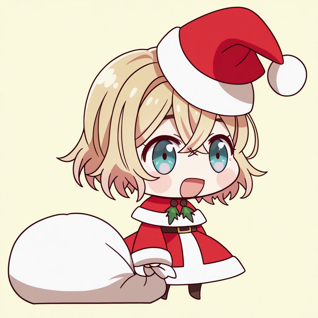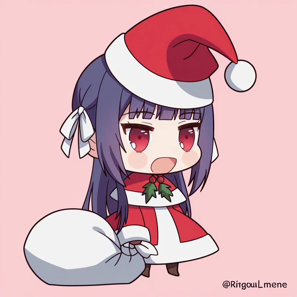 <lora:padoru-illustriousxl-lora-nochekaiser:1>, padoru, padoru (meme), holding sack, sack, santa hat, meme, christmas, open mouth, chibi, red capelet, santa dress, capelet, fur-trimmed headwear,
