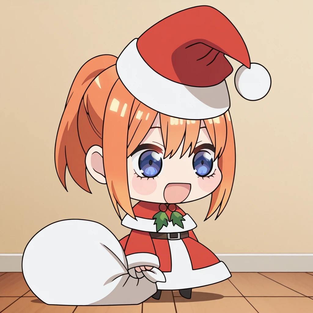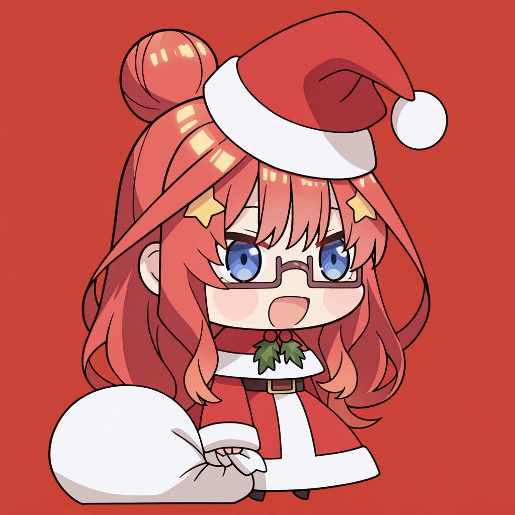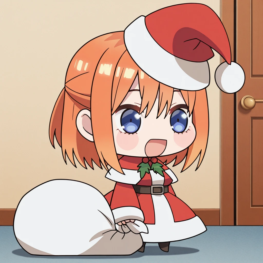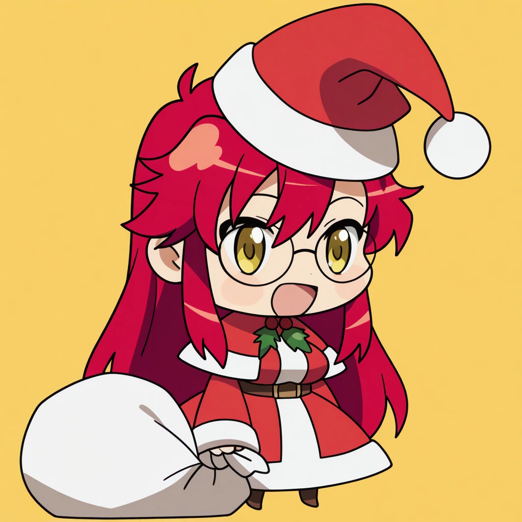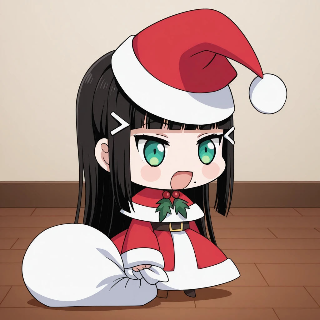 <lora:padoru-illustriousxl-lora-nochekaiser:1>, padoru, padoru (meme), holding sack, sack, santa hat, meme, christmas, open mouth, chibi, red capelet, santa dress, capelet, fur-trimmed headwear,