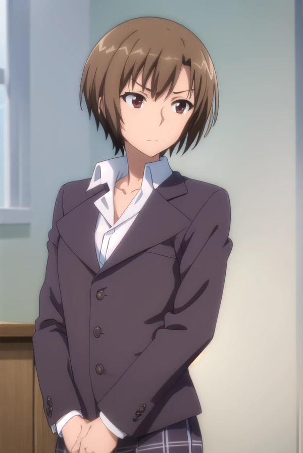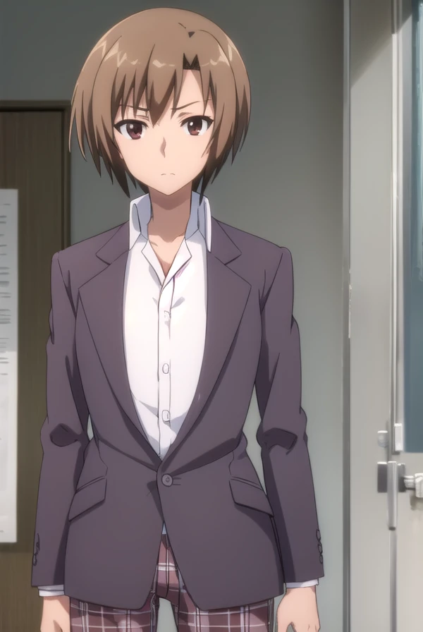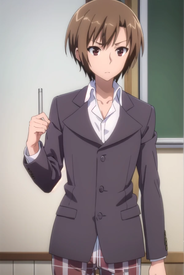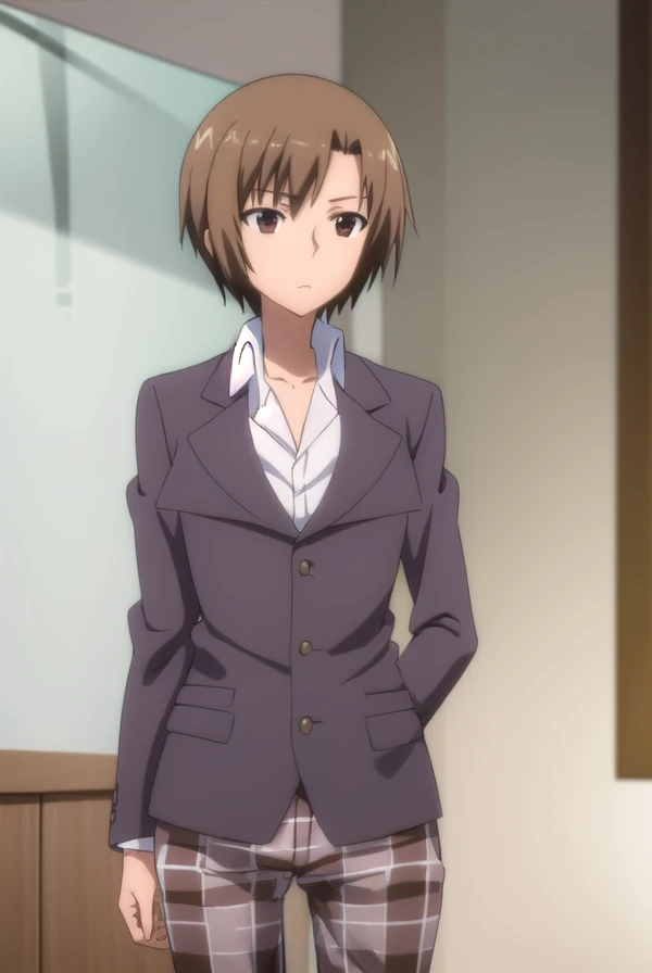 long sleeves, school uniform, jacket, pants, plaid, plaid pants, shirt, white shirt, collared shirt, brown jacket,