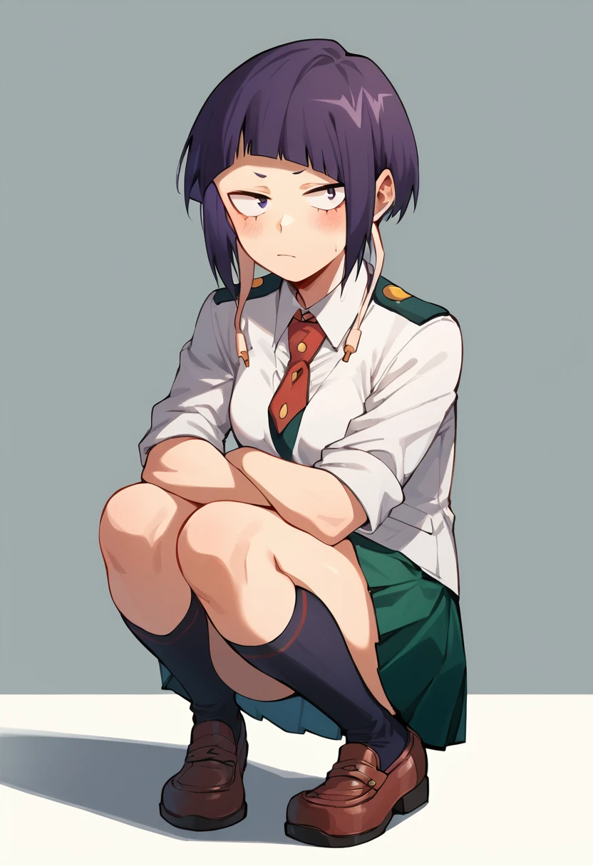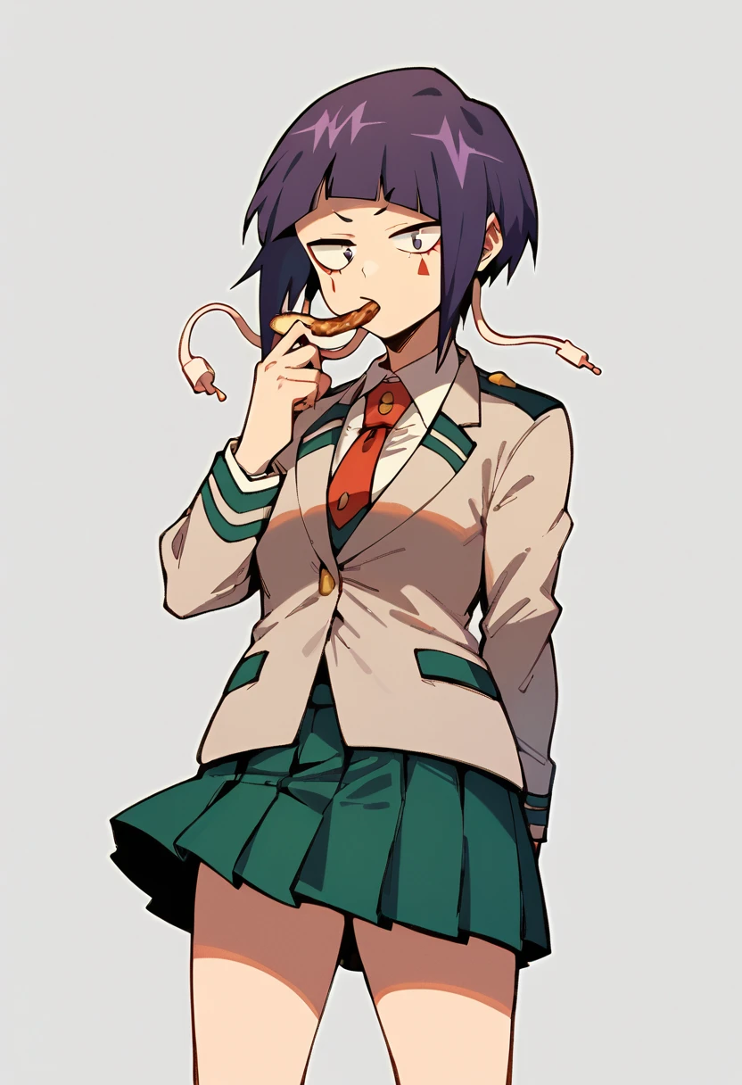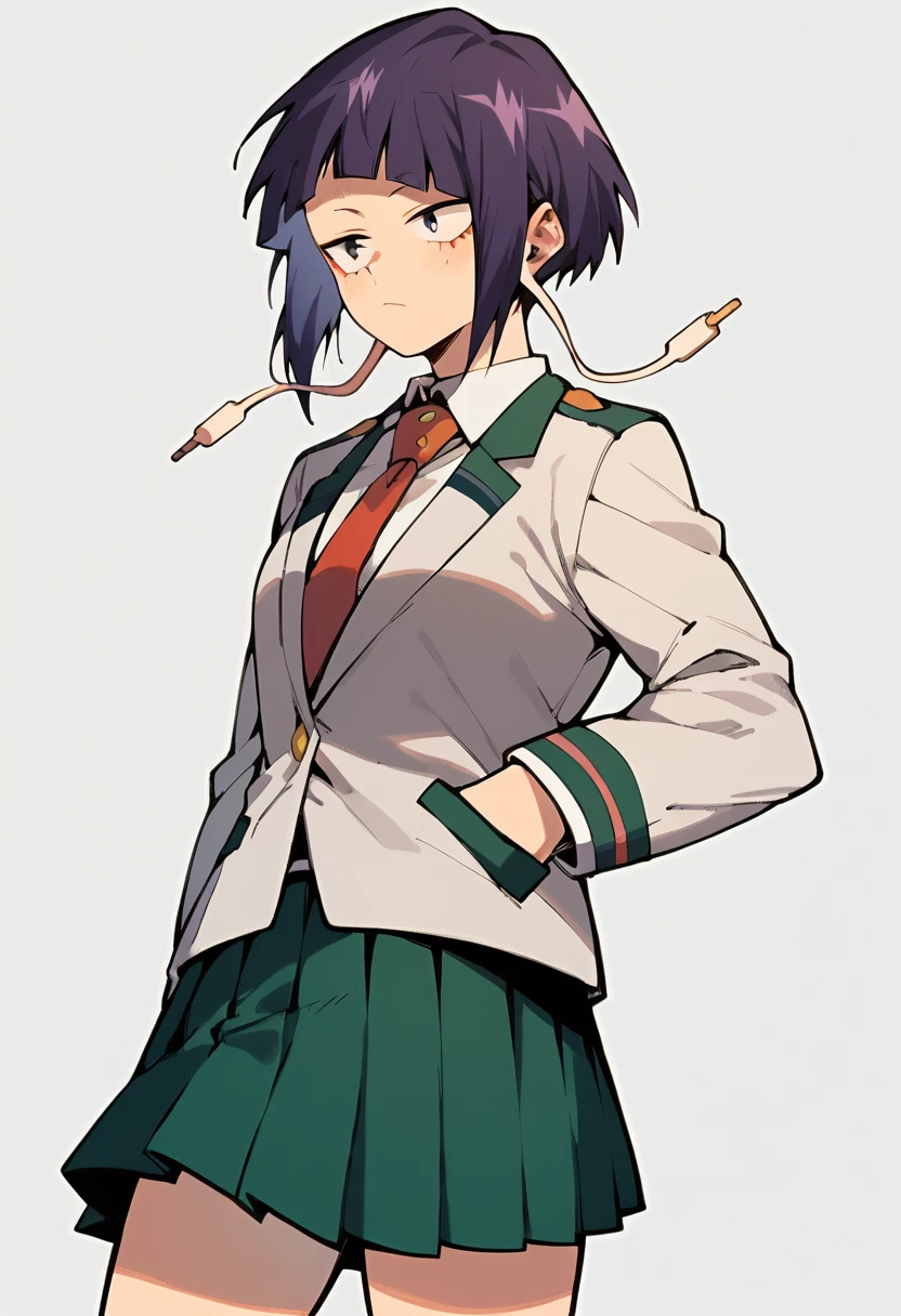 School Outfit: KyokaJirouPony, jirou kyouka, short hair, purple hair, blunt bangs, purple eyes, 1girl, solo, school uniform, jacket, pleated skirt, necktie, red necktie, green skirt, u.a. school uniform,