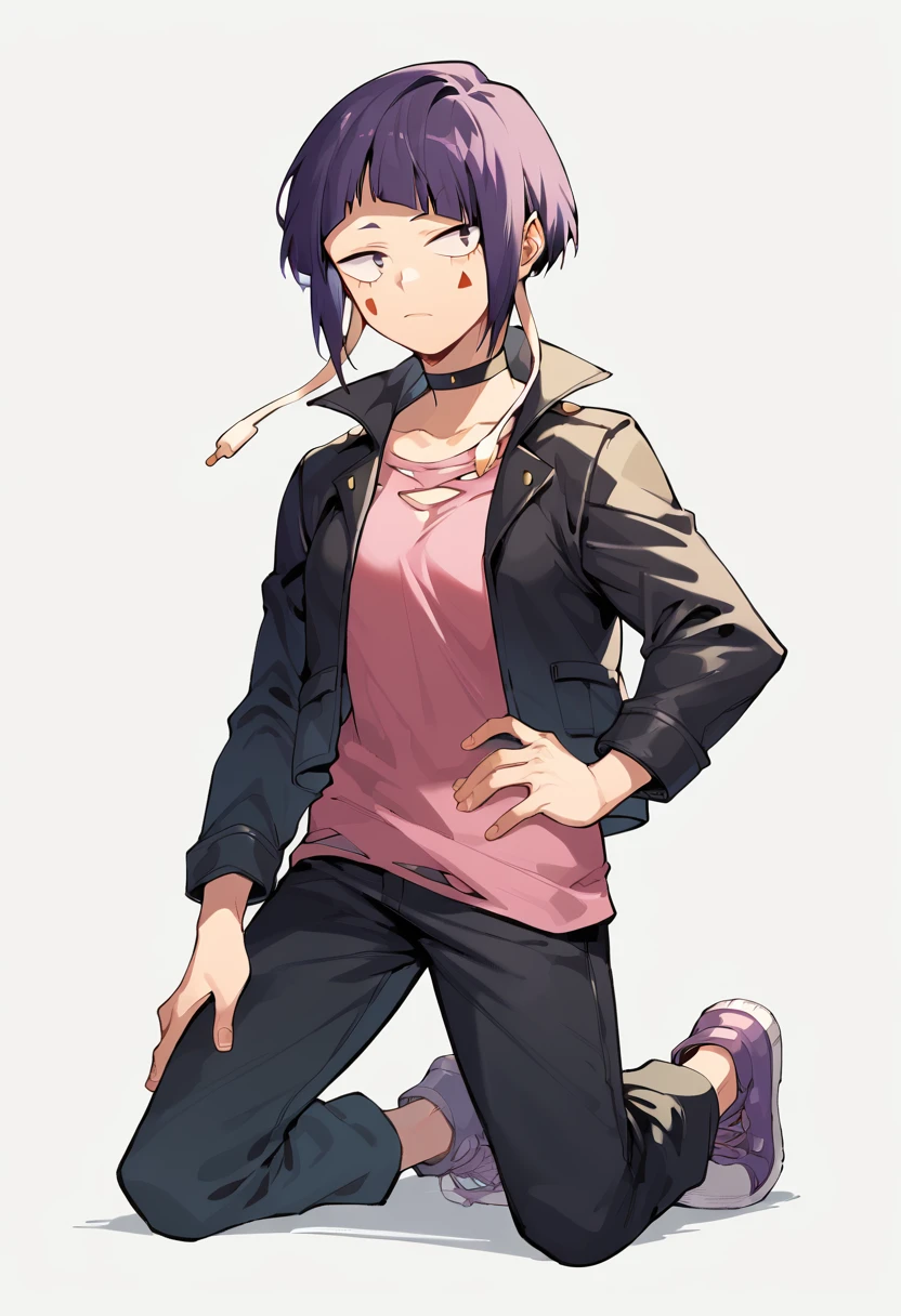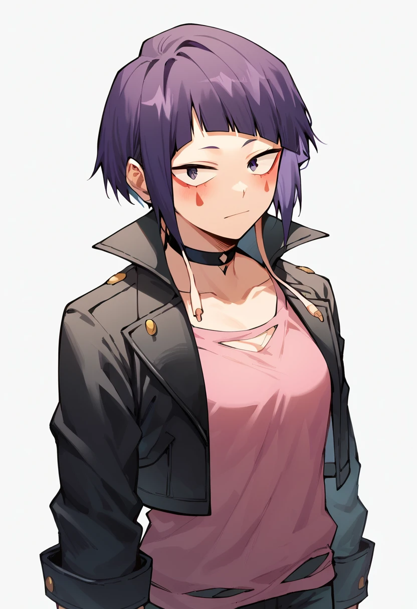 Hero Outfit: KyokaJirouPony, jirou kyouka, short hair, purple hair, blunt bangs, purple eyes, 1girl, solo, open jacket, black jacket, black choker, facial mark, black pants, pink shirt,