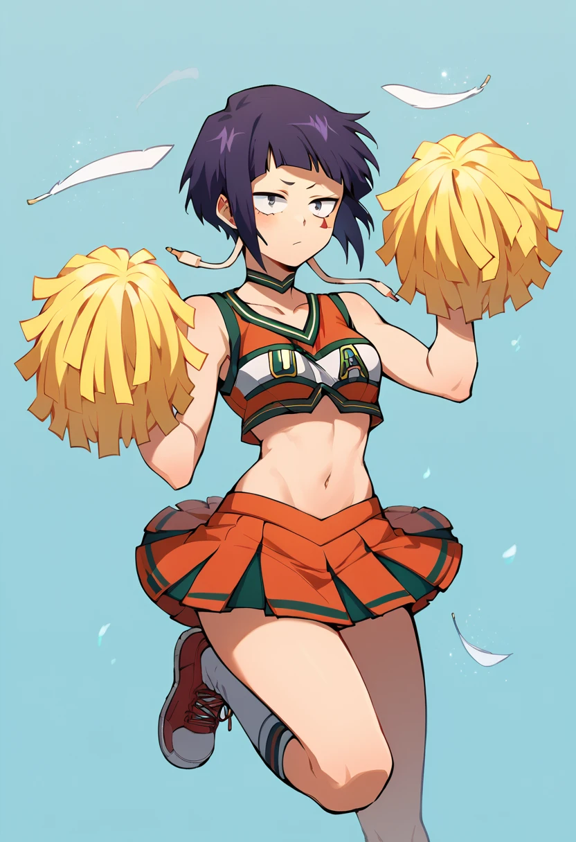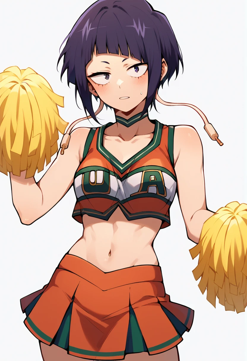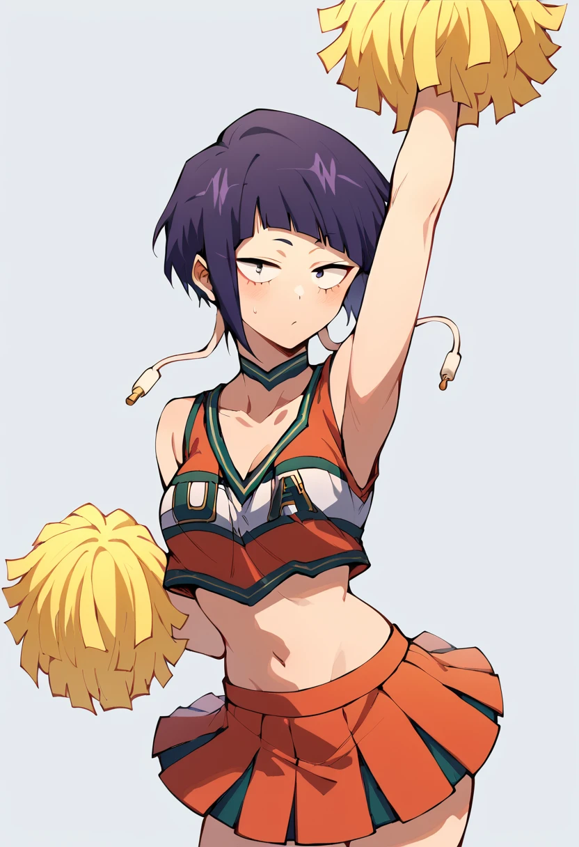 Cheerleader Outfit: KyokaJirouPony, jirou kyouka, short hair, purple hair, blunt bangs, purple eyes, 1girl, solo, navel, bare shoulders, collarbone, choker, midriff, crop top, cheerleader, pom pom (cheerleading),