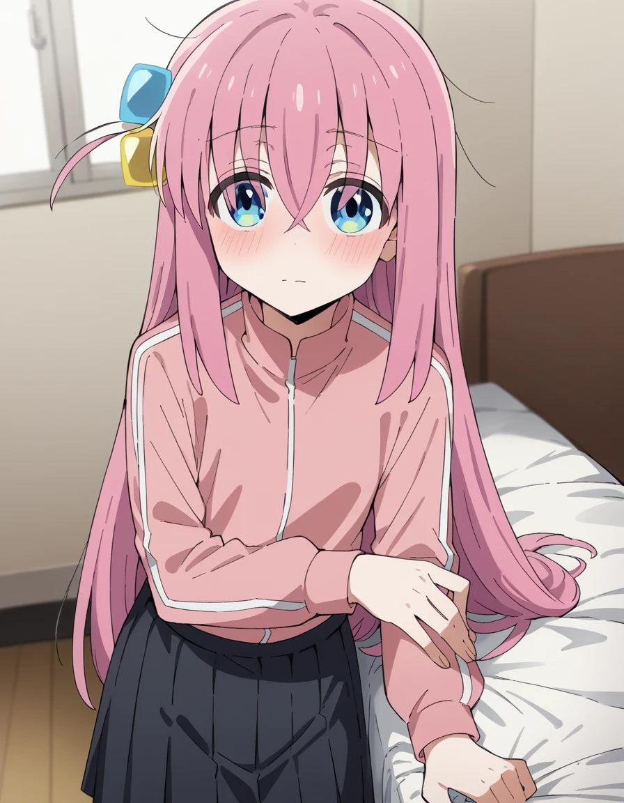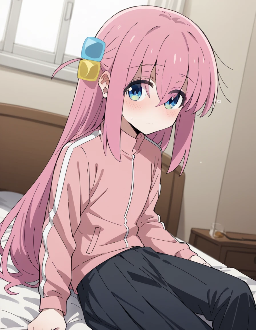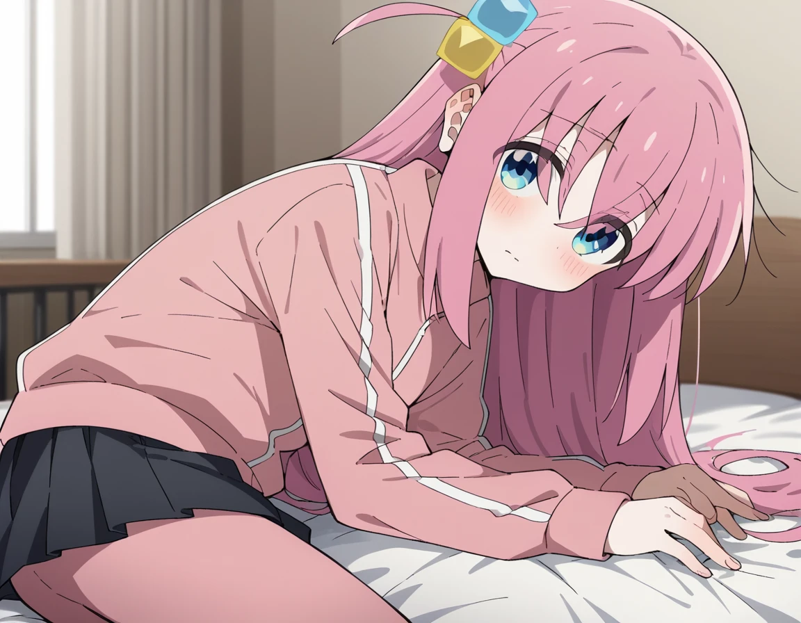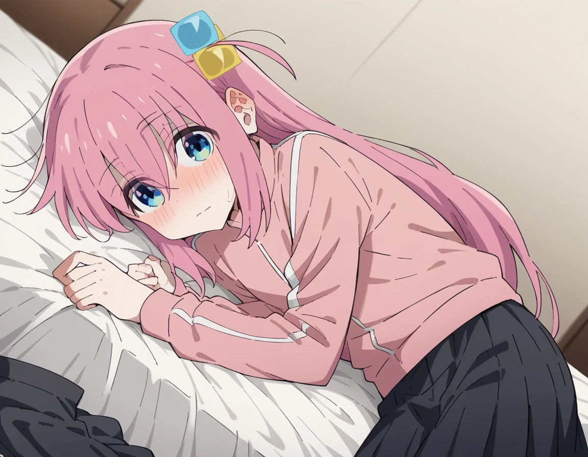 hitori gotou, blue eyes, cube hair ornament, hair between eyes, hair ornament, pink hair, one side up, long hair,