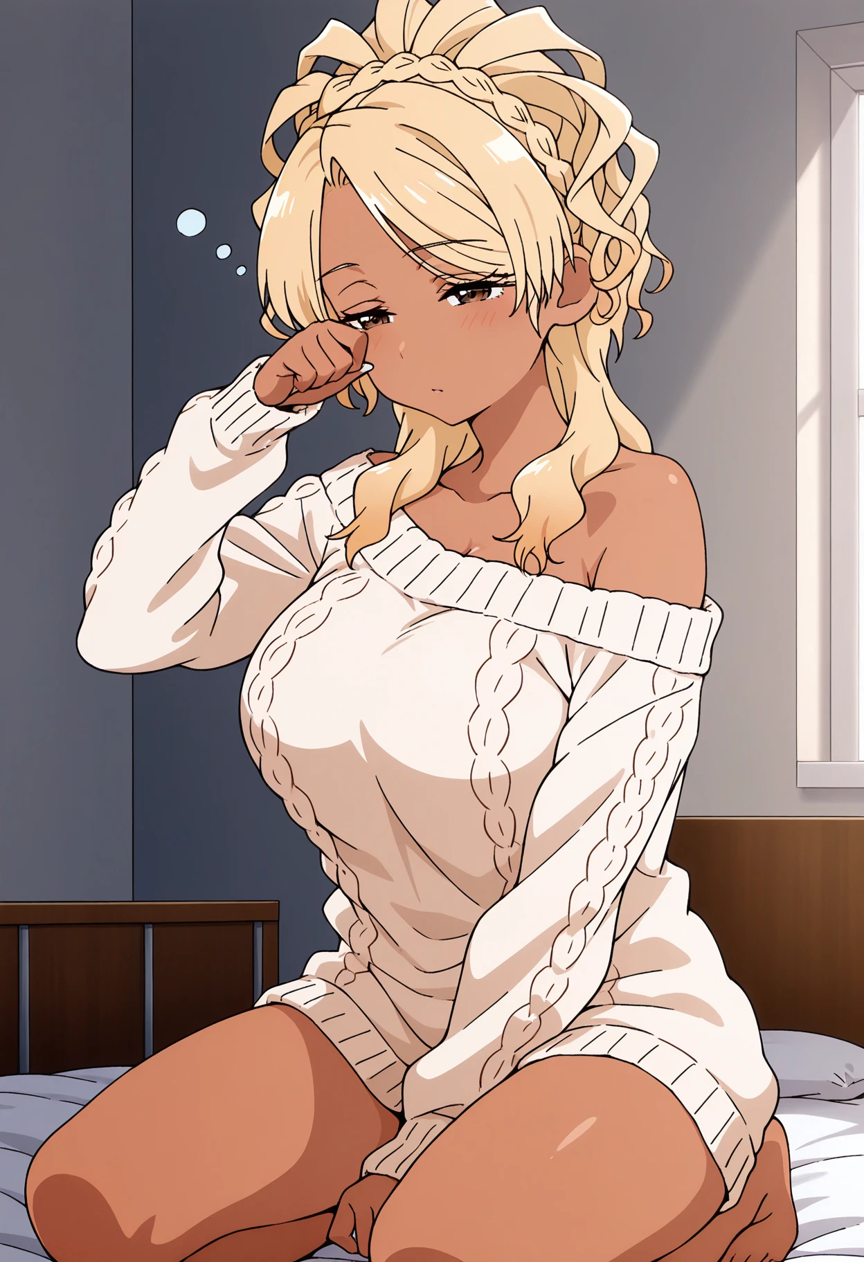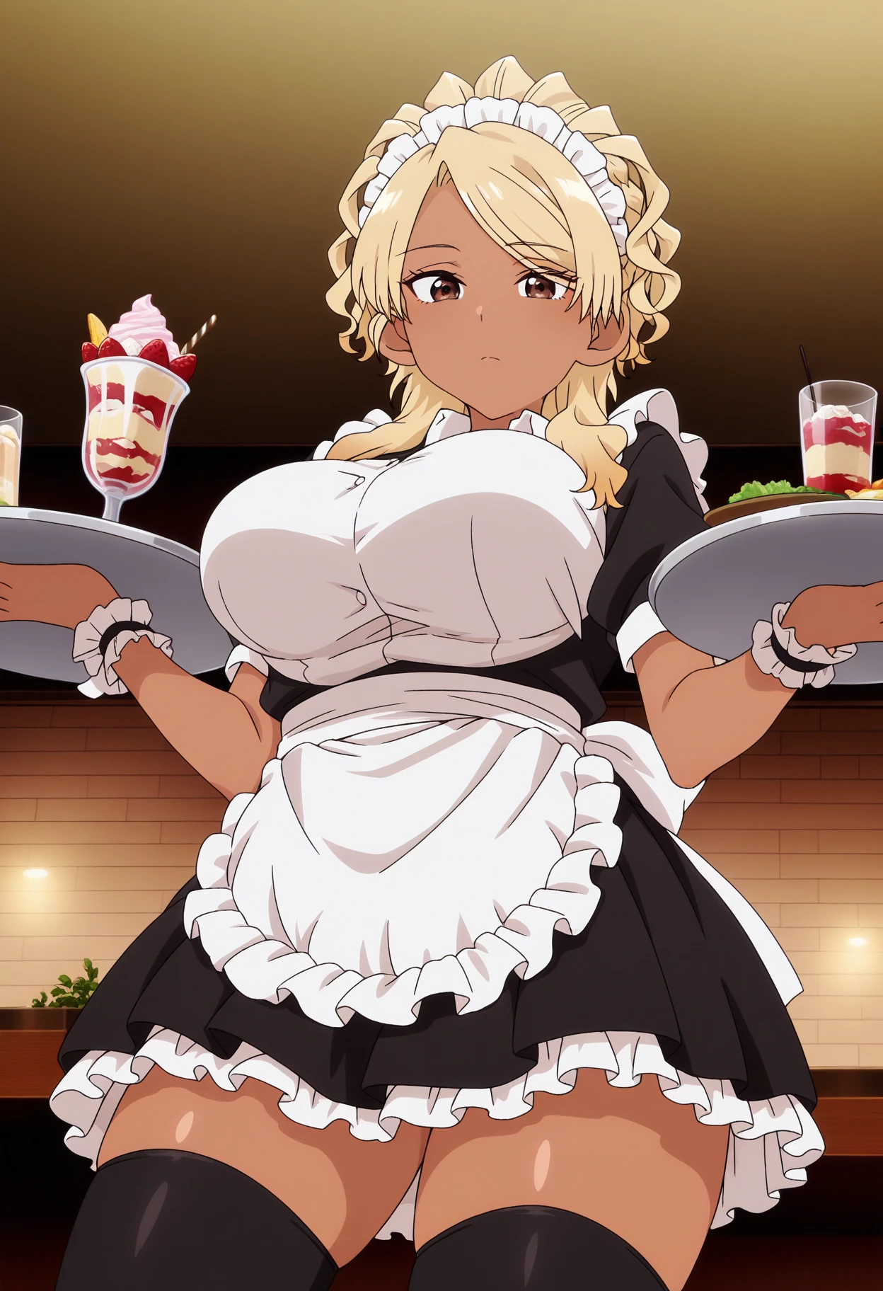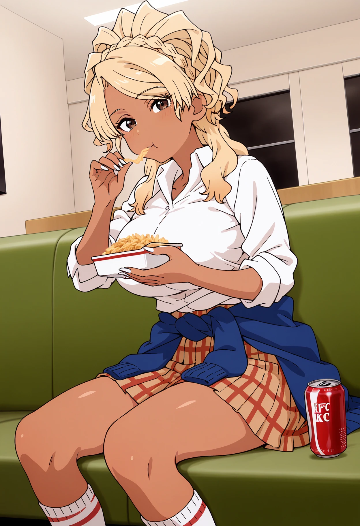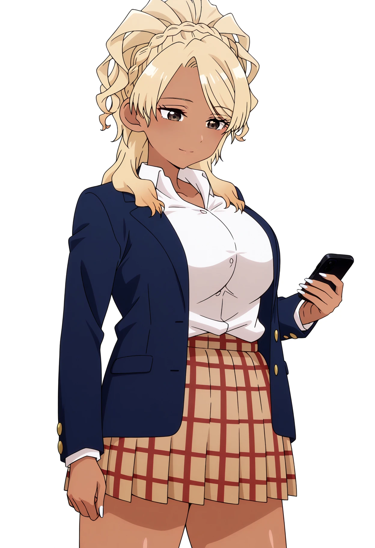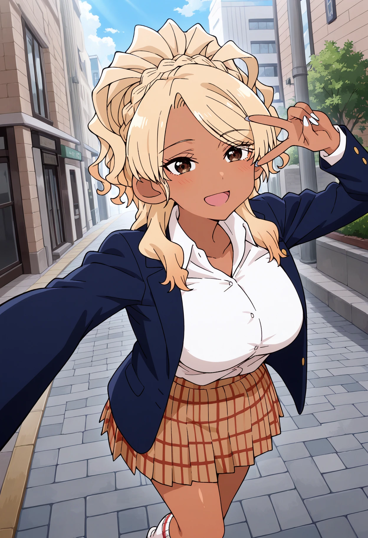 yamamotowz, solo, blonde hair, brown eyes, blonde hair, crown braid, large breasts, gyaru, dark skin, dark-skinned female, blue blazer, white shirt, collared shirt, plaid skirt, pleated skirt, white nails, white socks