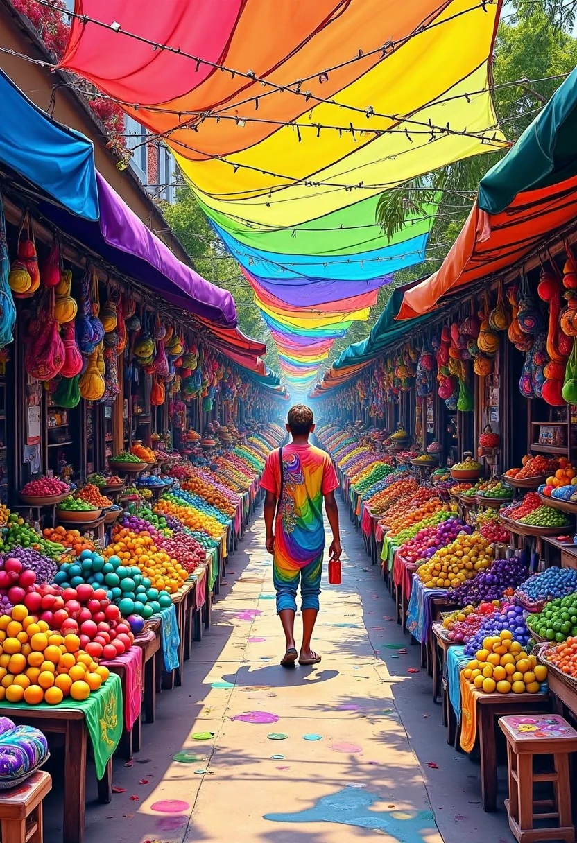 Colorful and vibrant color schemes, sketch a bustling market, with stalls of colorful fruits, rainbow - colored fabrics, and vendors in bright clothing.