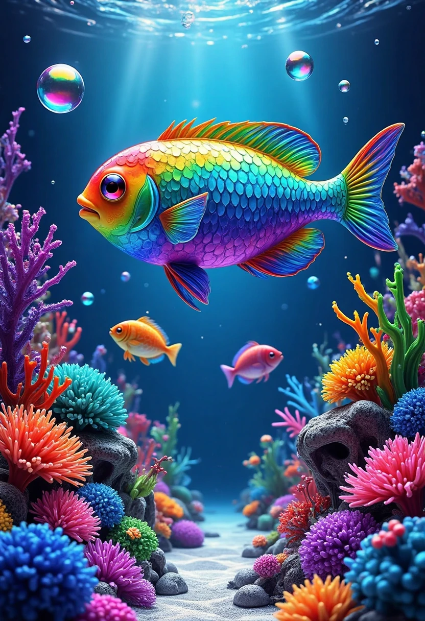 Colorful and vibrant color schemes, craft an underwater world, where fish have rainbow scales, coral glows in vivid shades, and bubbles are iridescent.