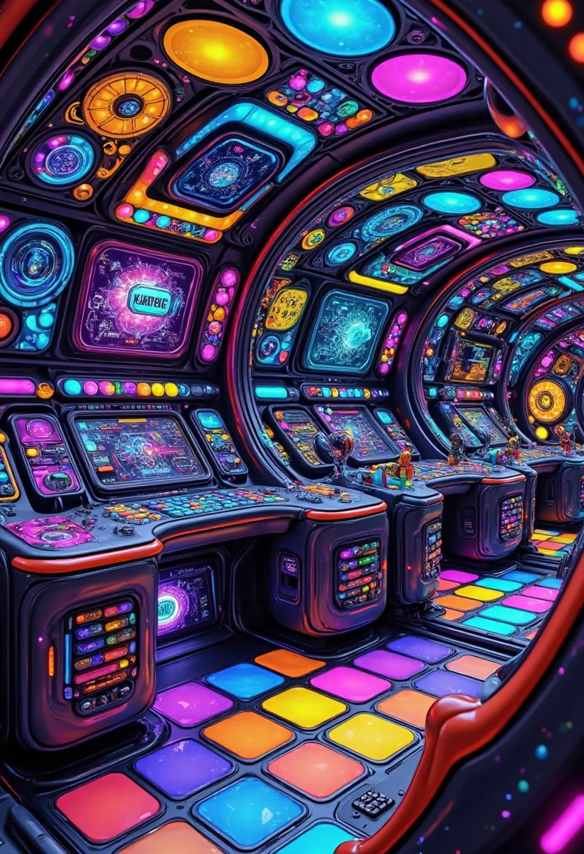 Colorful and vibrant color schemes, imagine a retro - futuristic spaceship interior, filled with neon panels, colorful control buttons, and holographic displays.