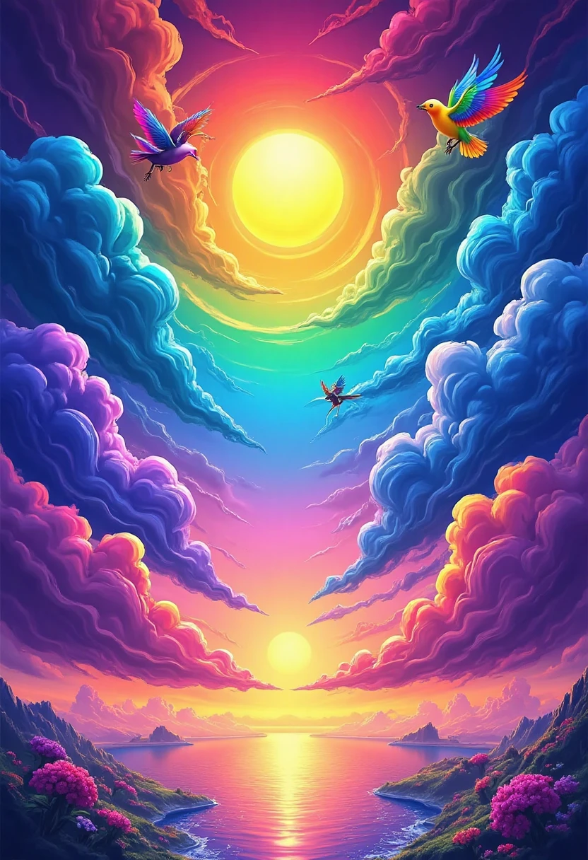 Colorful and vibrant color schemes, paint a dreamy sky at dawn, with rainbow - hued clouds, a sun with a colorful corona, and birds with multicolored feathers.