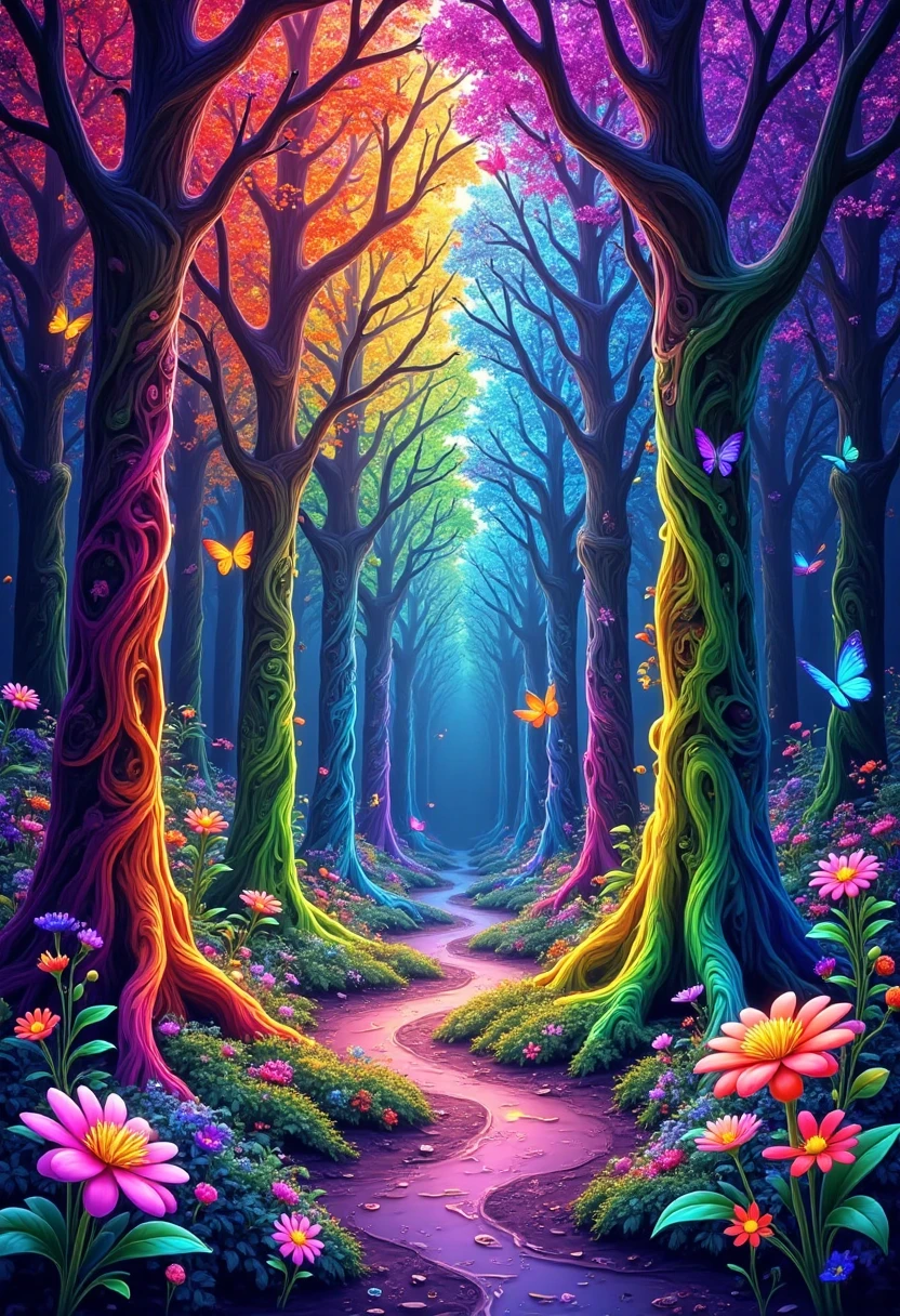 Colorful and vibrant color schemes, design a magical forest where trees have rainbow bark, flowers glow in every color, and butterflies with iridescent wings flit about.