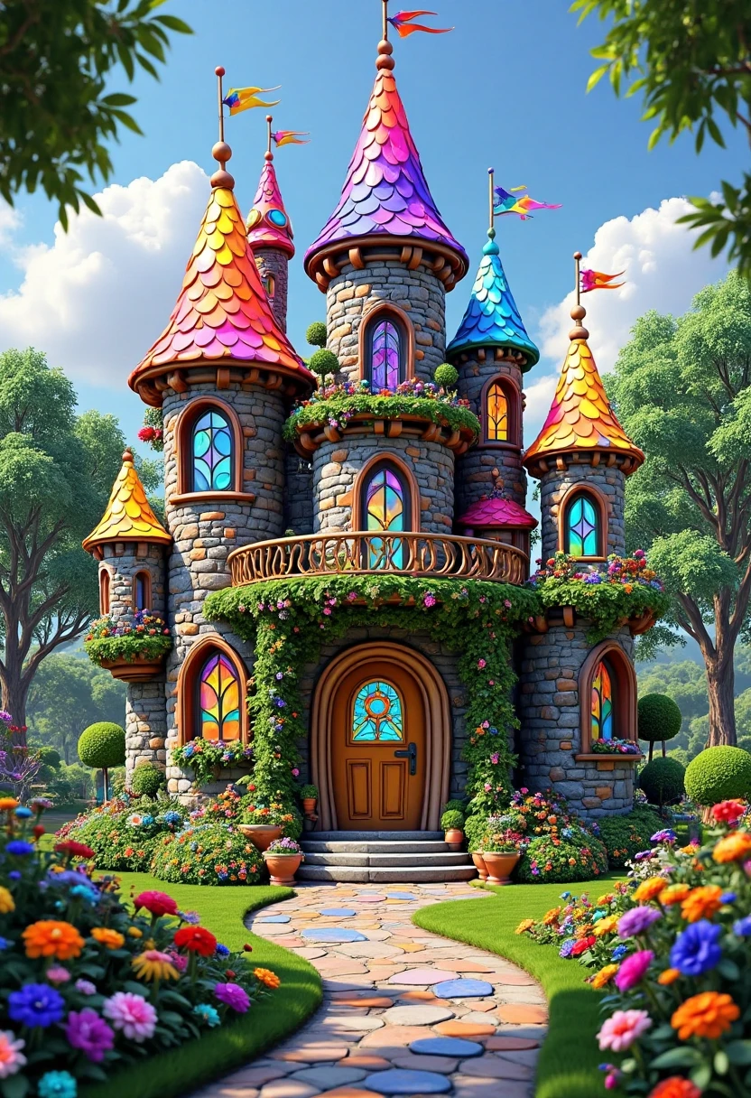 Colorful and vibrant color schemes, build a fantasy castle, with rainbow - tiled roofs, colorful stained - glass windows, and gardens full of vivid blooms.