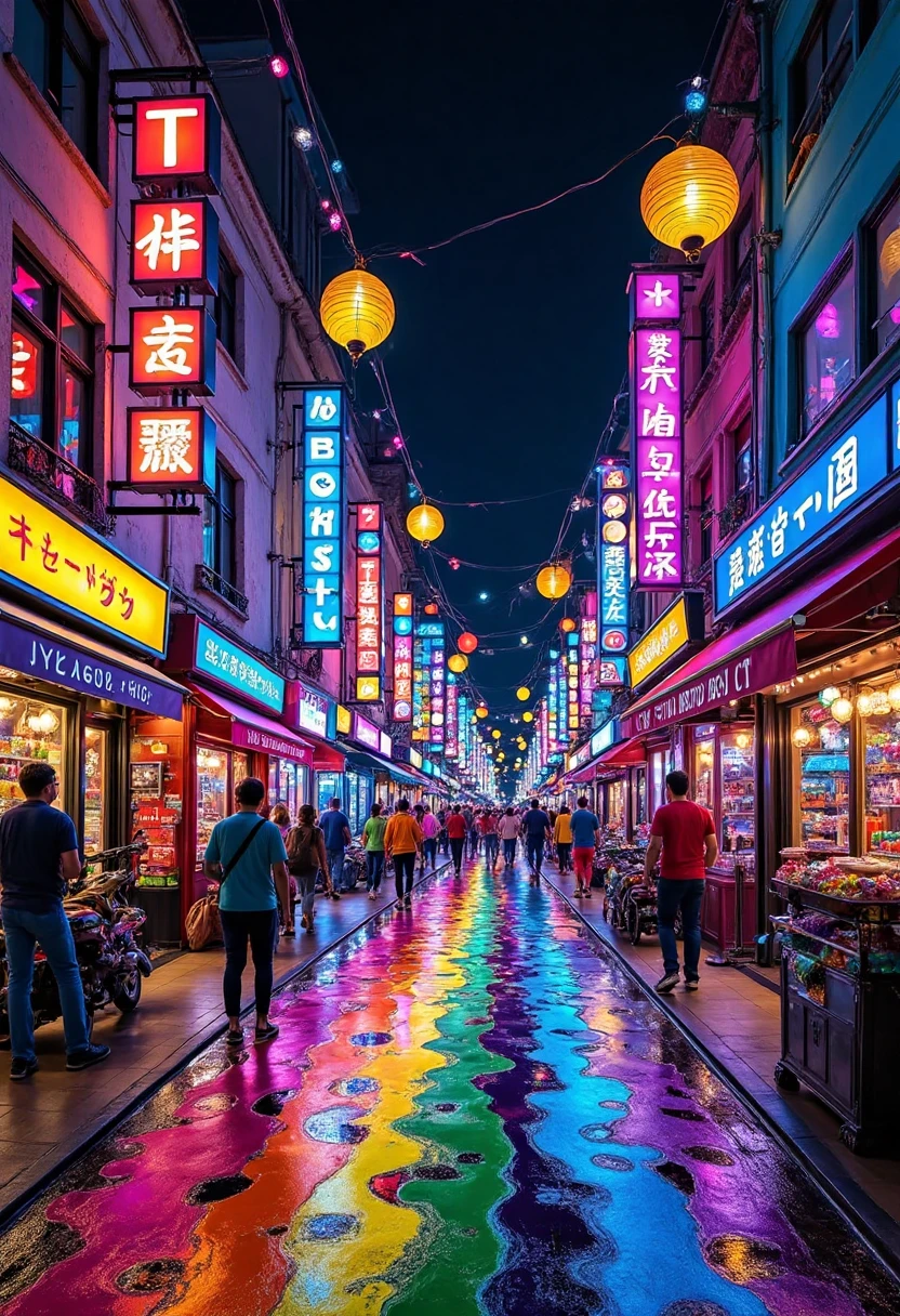 Colorful and vibrant color schemes, create a neon - lit city street at night, with glowing signs, rainbow - hued puddles reflecting lights, and bustling crowds in vivid attire.