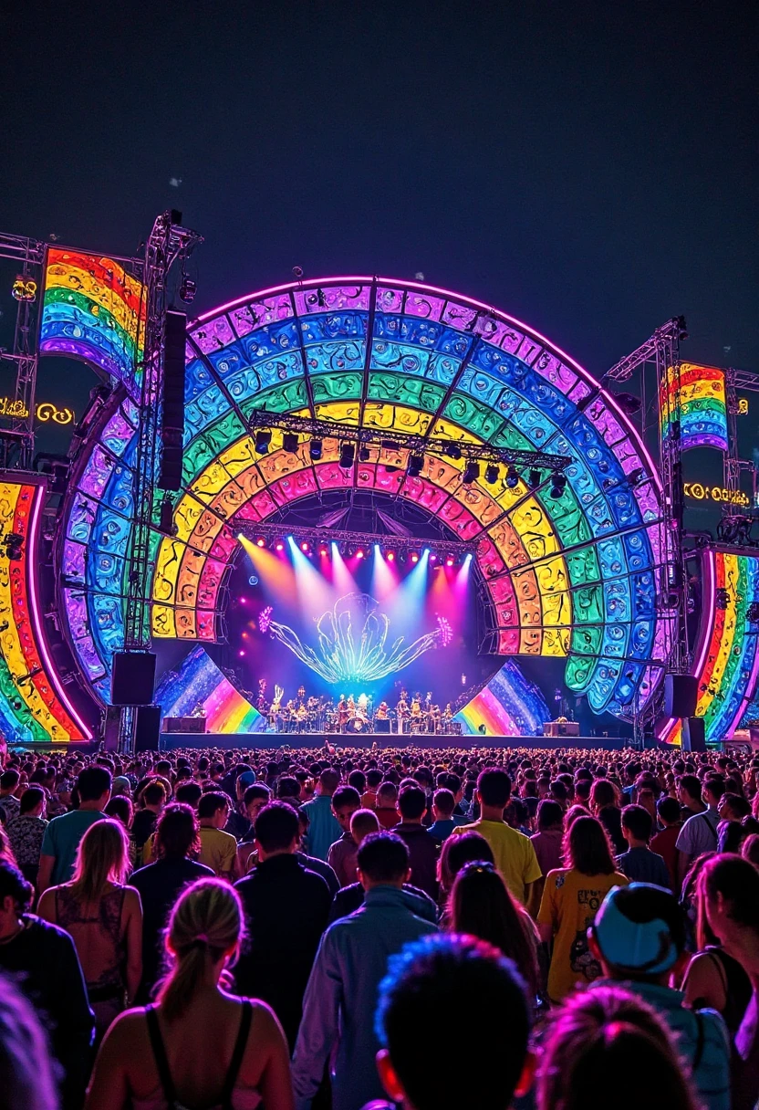 Colorful and vibrant color schemes, illustrate a music festival, with rainbow - colored stages, neon - lit instruments, and crowds in vivid festival wear.