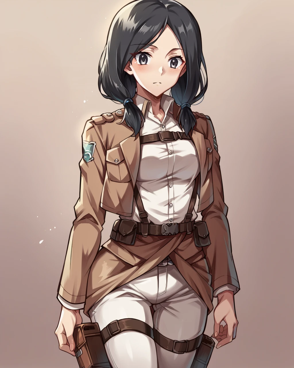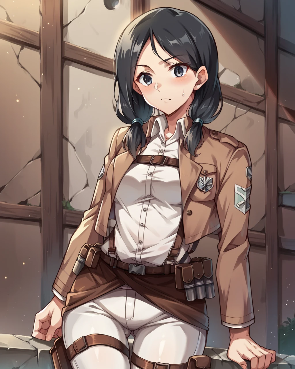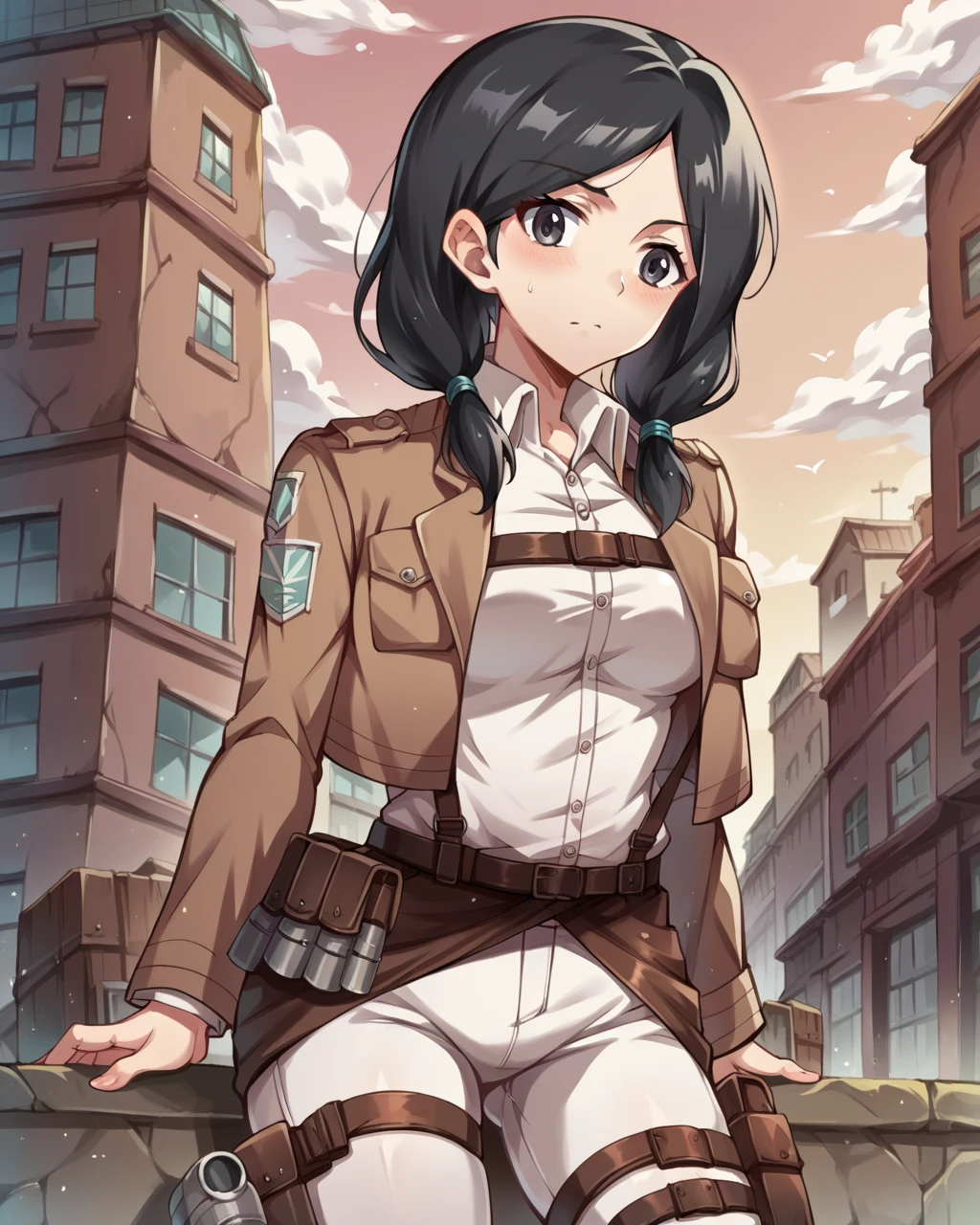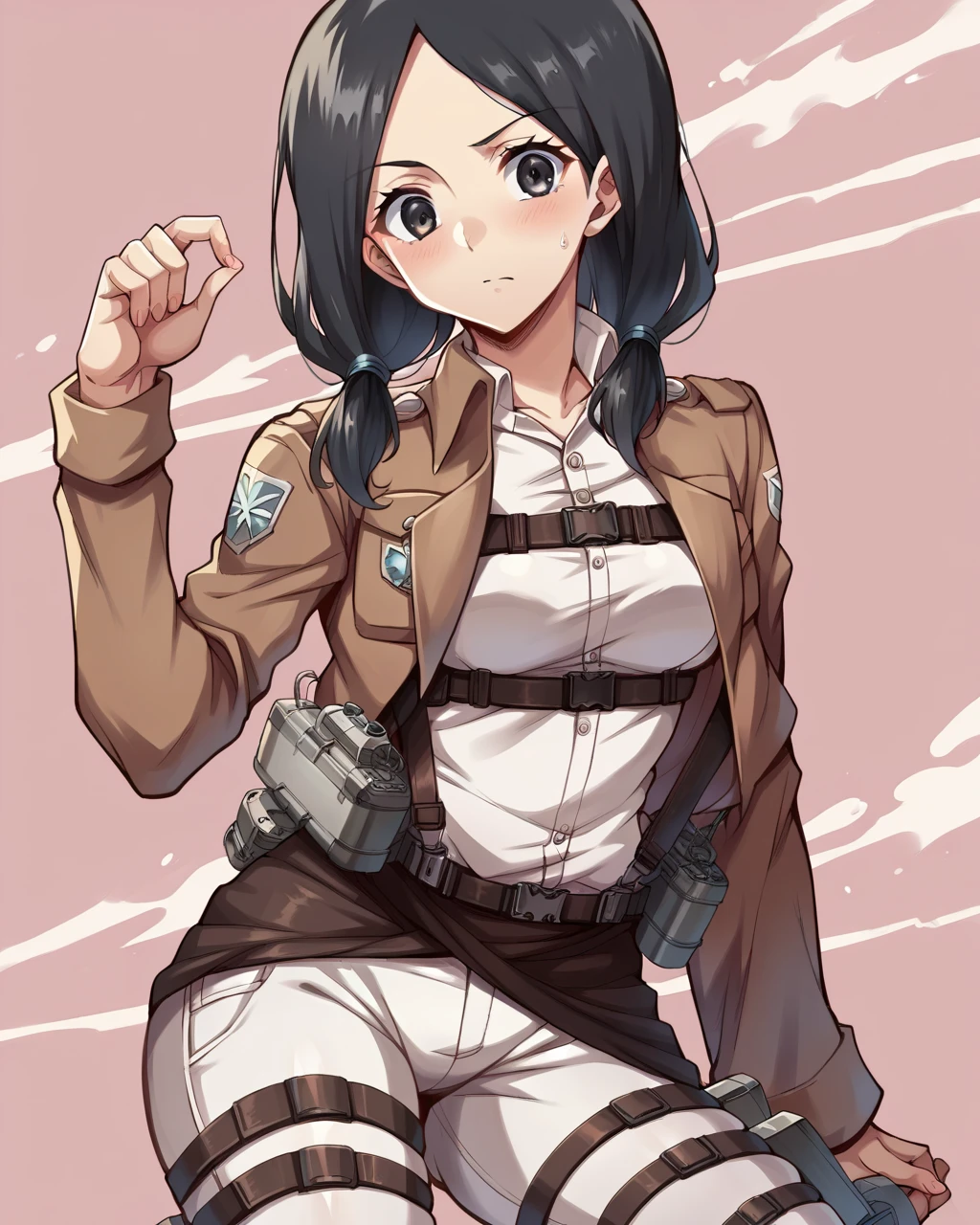 mina carolina, 1girl, solo, black hair, black eyes, low twintails, short hair,paradis military uniform,training corps \(emblem\),thigh strap,White pants,brown jacket,