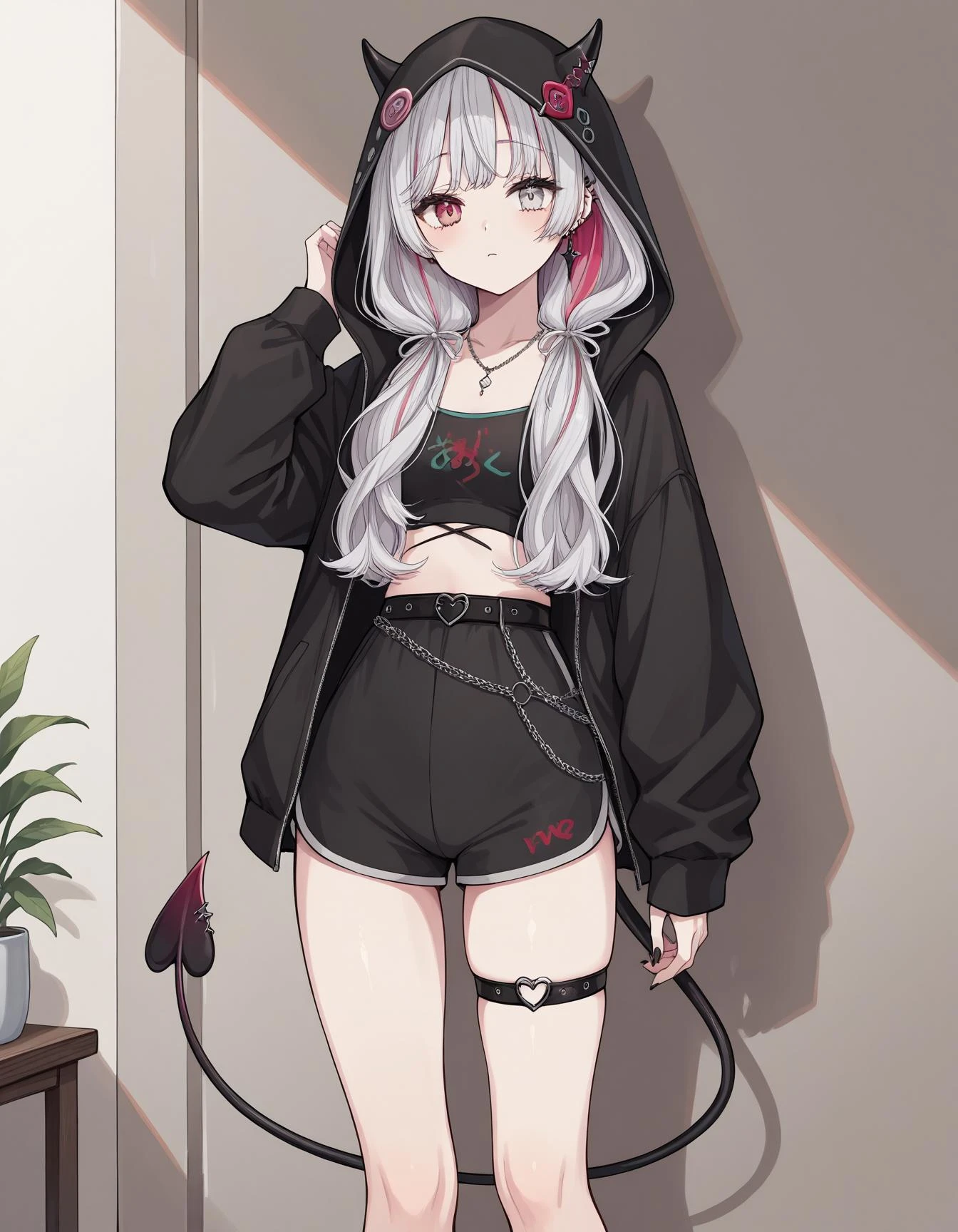nijinozomicos,croptop,writing croptop,midriff,stomach,black belt,heart buckle,black shorts,dolphin shorts,high-waist shorts,chain,thigh band,necklace,demon tail,black tail,black hoodie,long sleeves,hood up,horn hood,see-through heart,