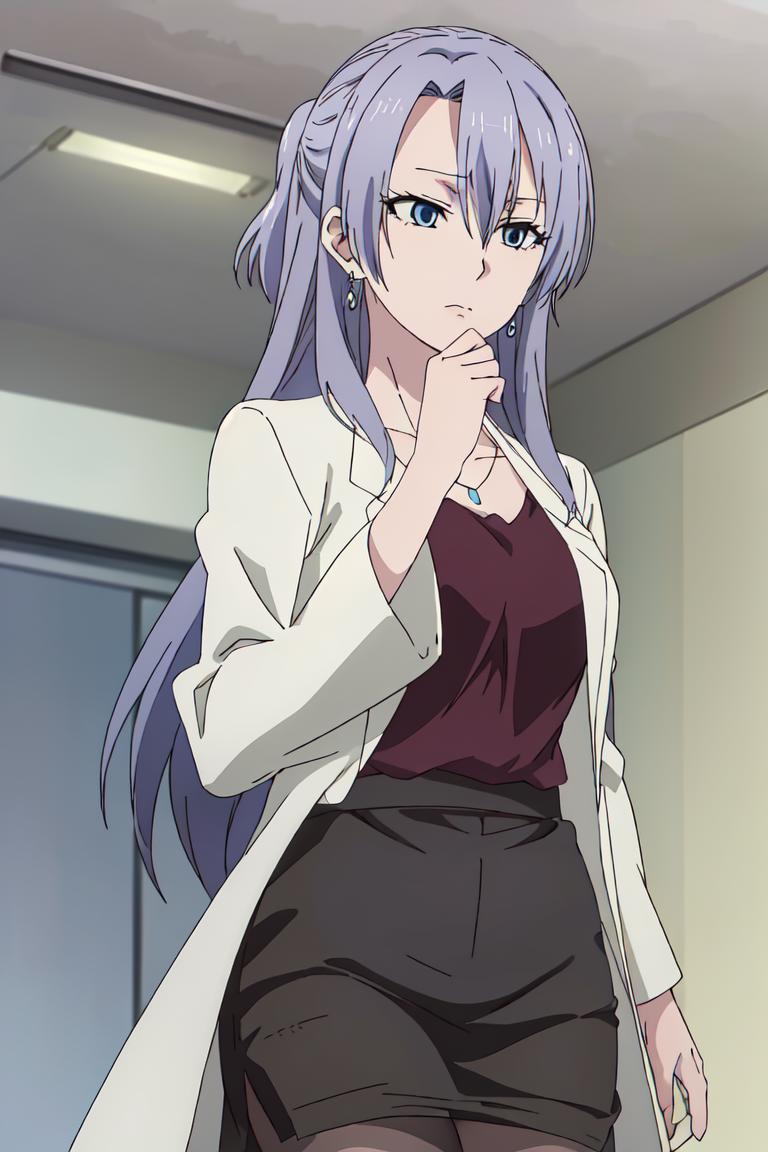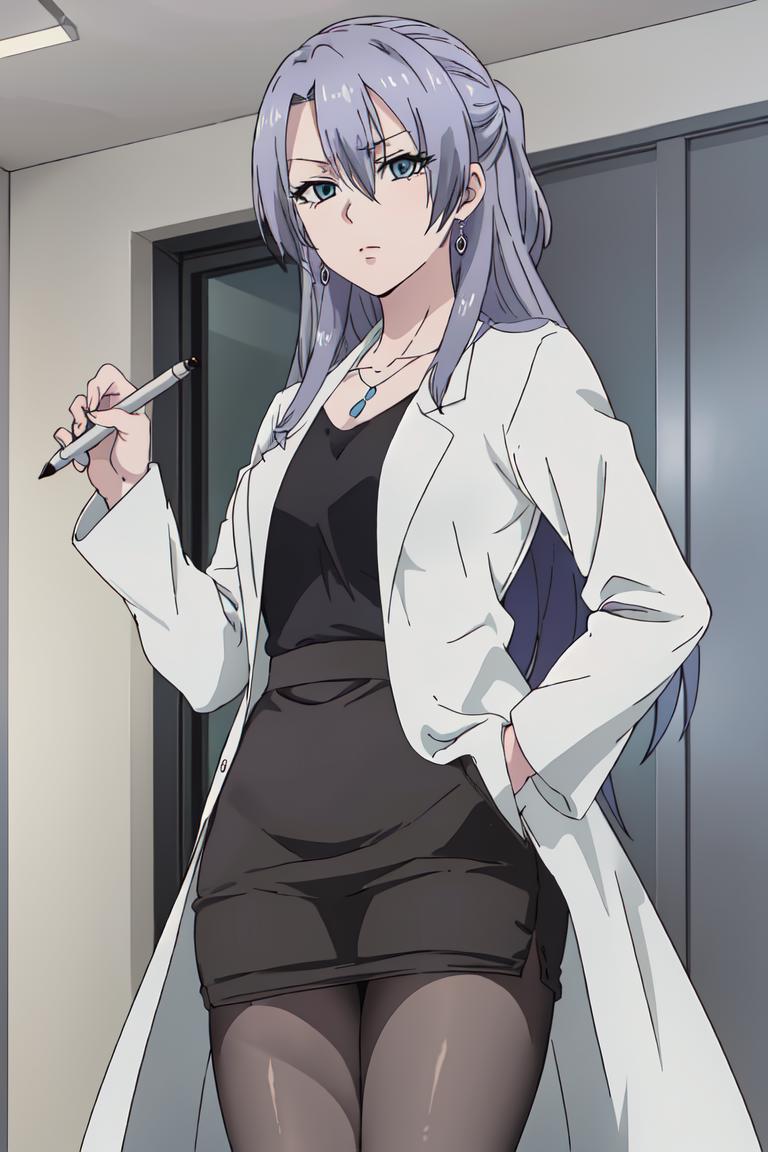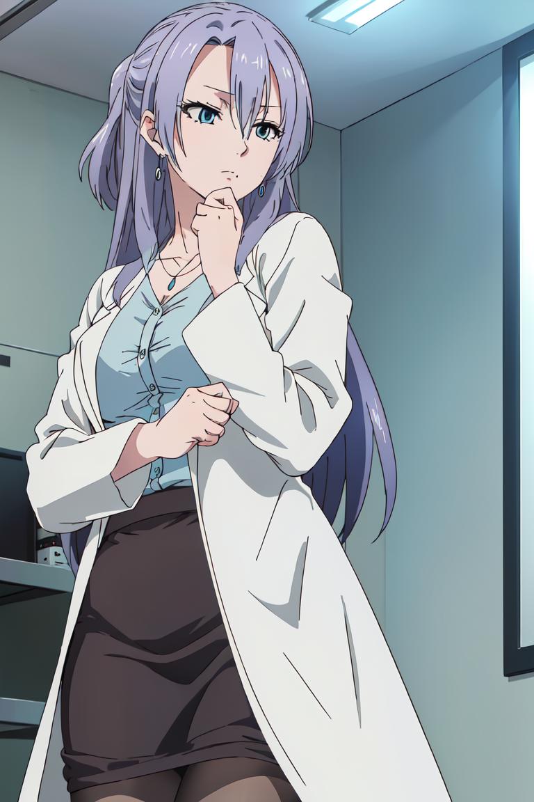 ayame, purple hair, jewelry, blue eyes, long hair, earrings, labcoat, necklace,