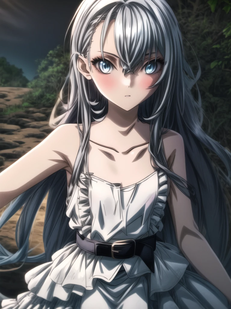 girl,long hair,solo,hair between eyes,looking at viewer,dress,grey eyes,bare shoulders,collarbone,very long hair,white dress,closed mouth,sleeveless,grey hair,belt,sleeveless dress,white hair,blue eyes,blush,frills,frilled dress,outdoors,Jungle Background,parted lips,small breasts,black belt,flat chest,eyelashes,anime coloring