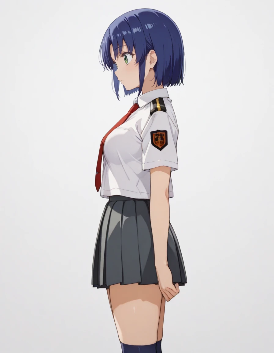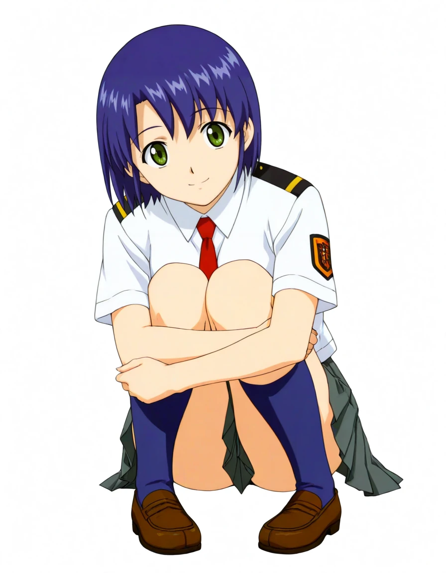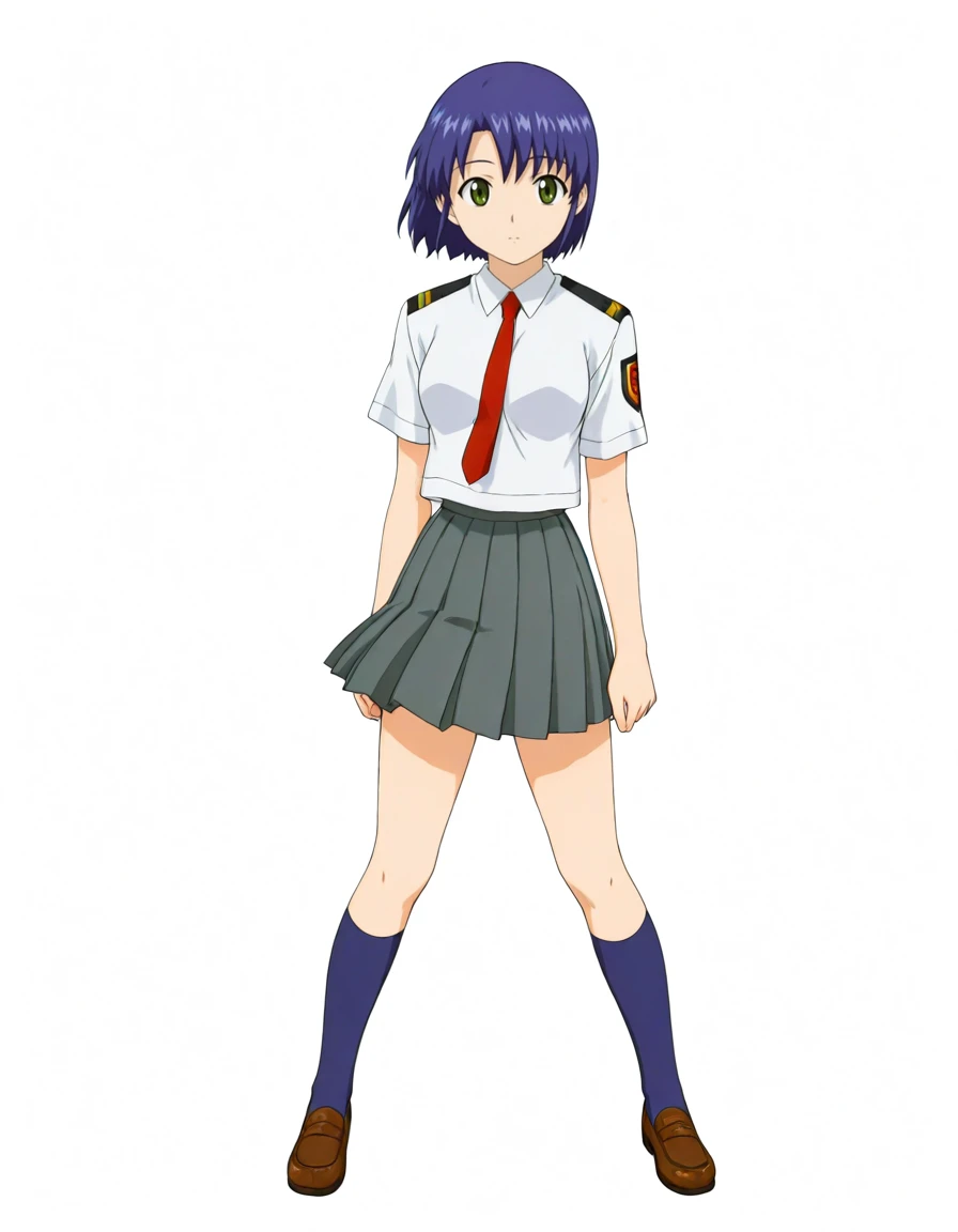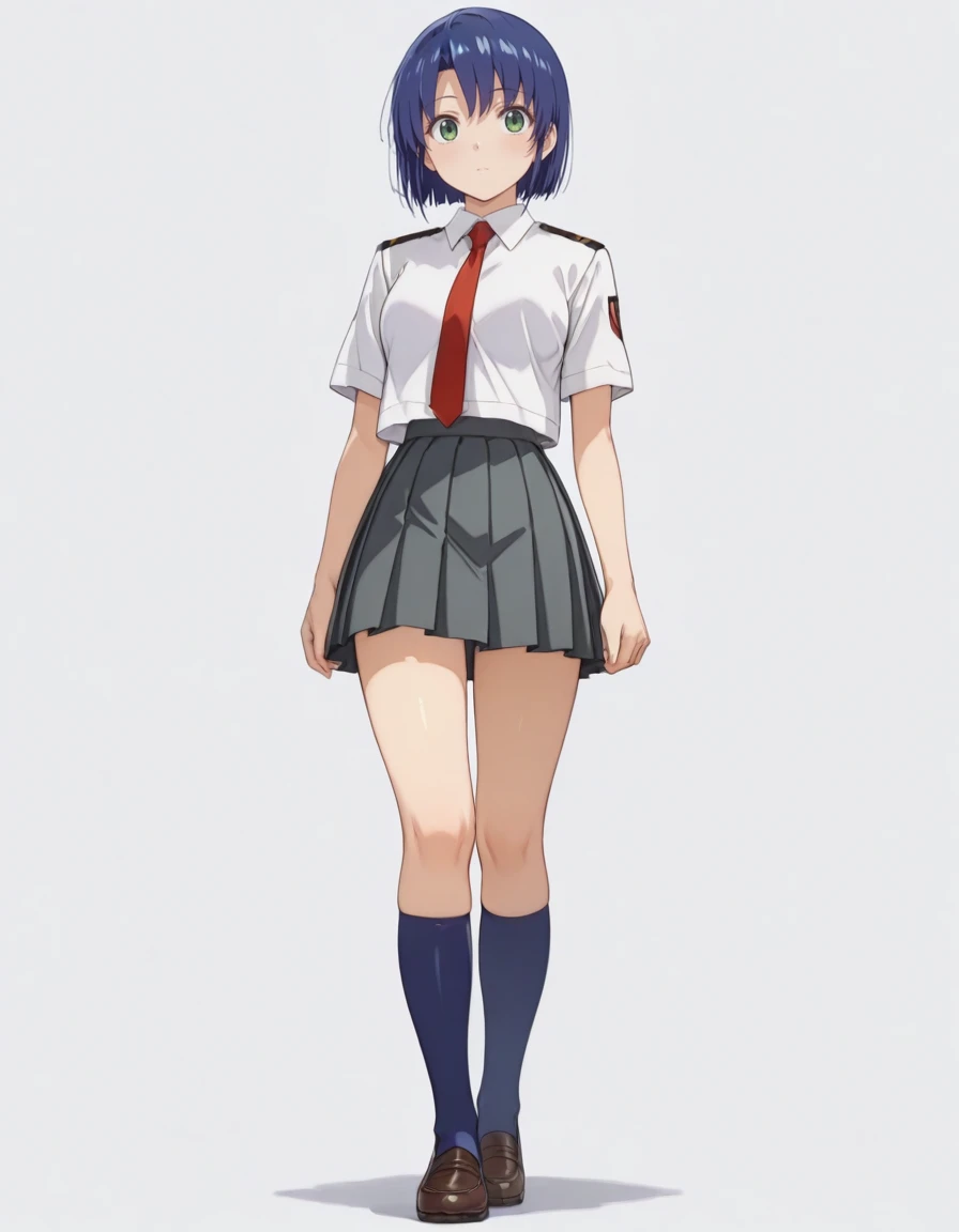 kikuhara karin, short hair, dark-blue hair, green eyes, school uniform, white shirt, short sleeves, red necktie, pleated skirt, dark gray skirt, kneehighs, dark blue socks, loafers, emblem on left sleeve, epaulettes,