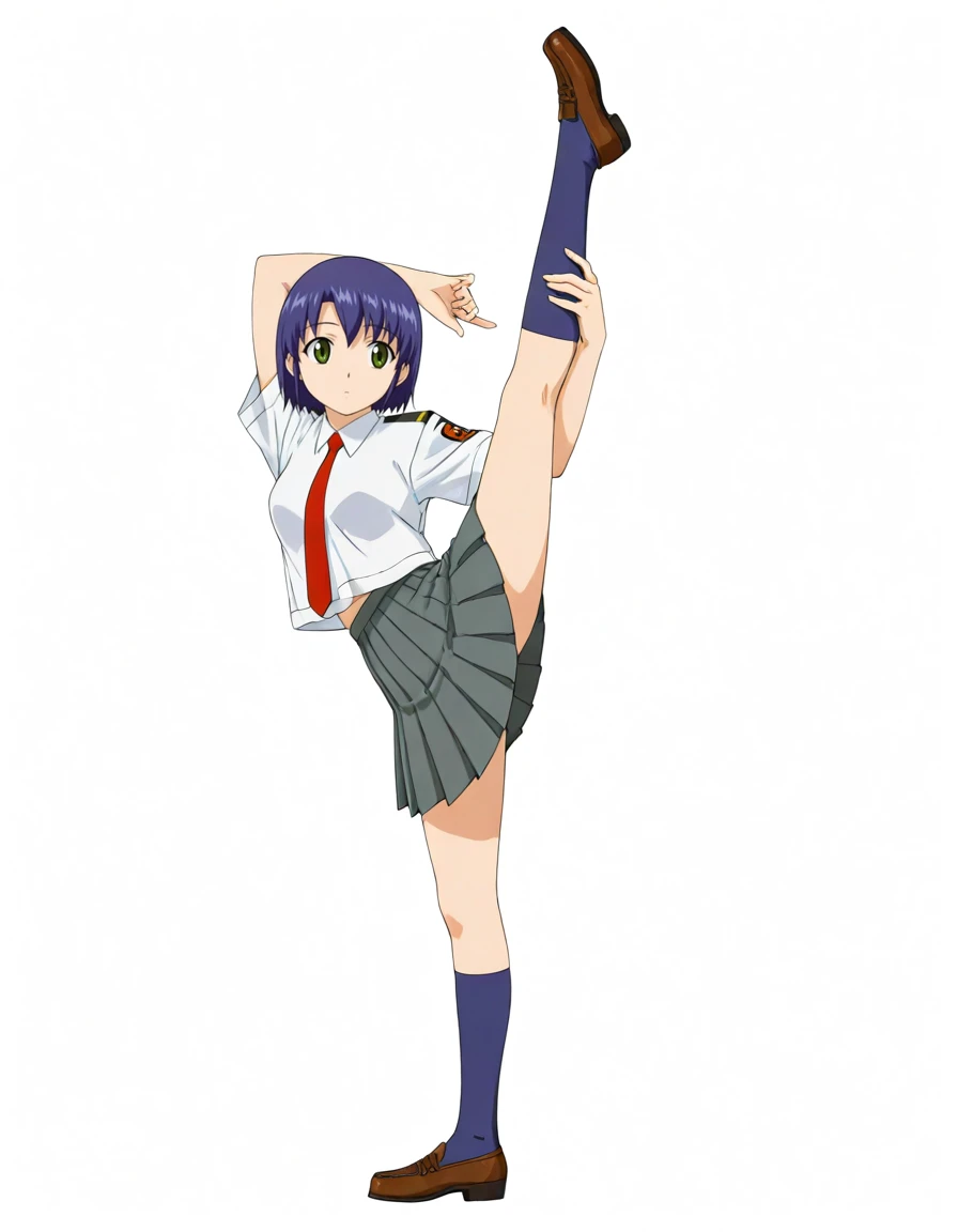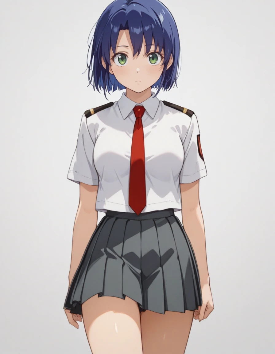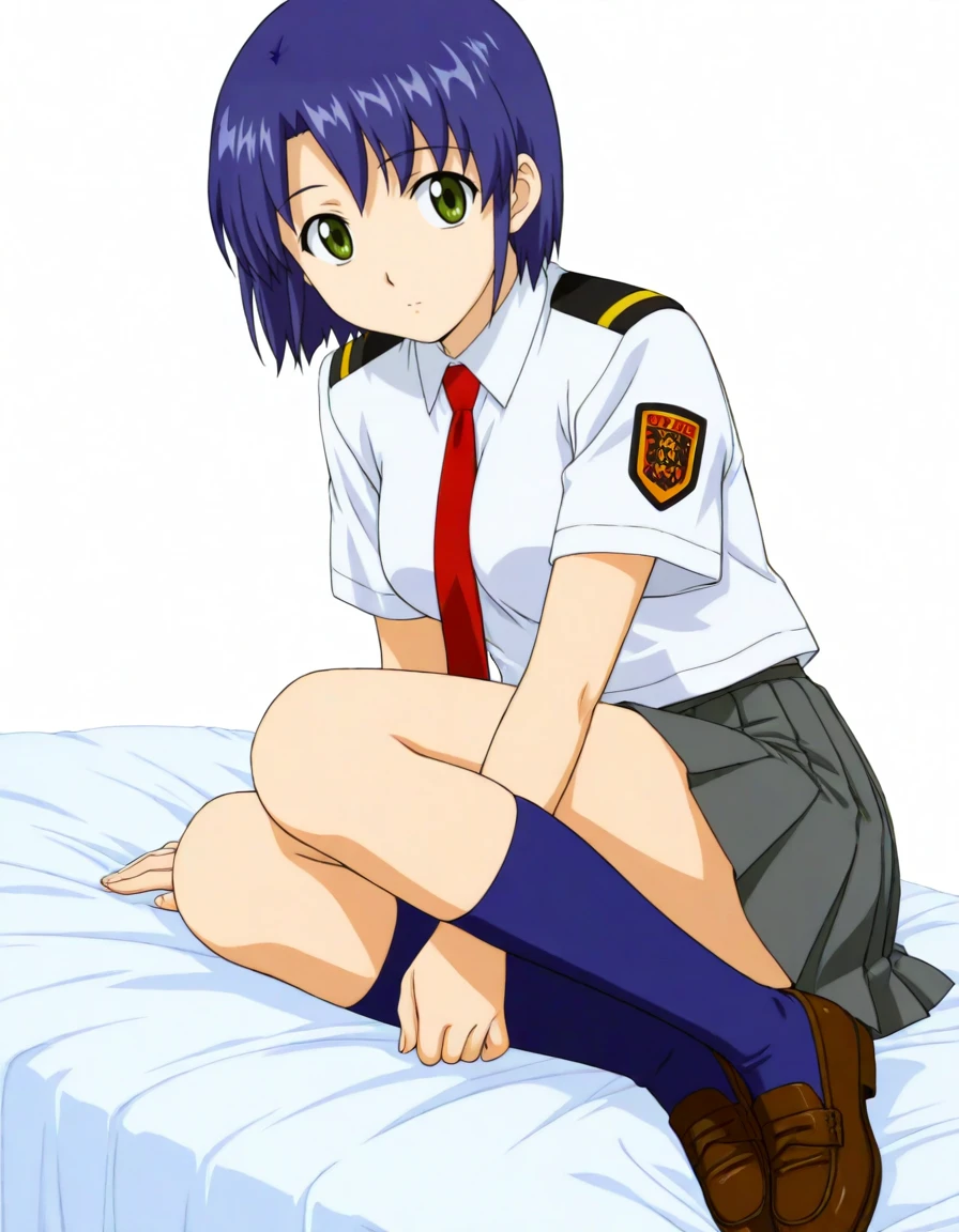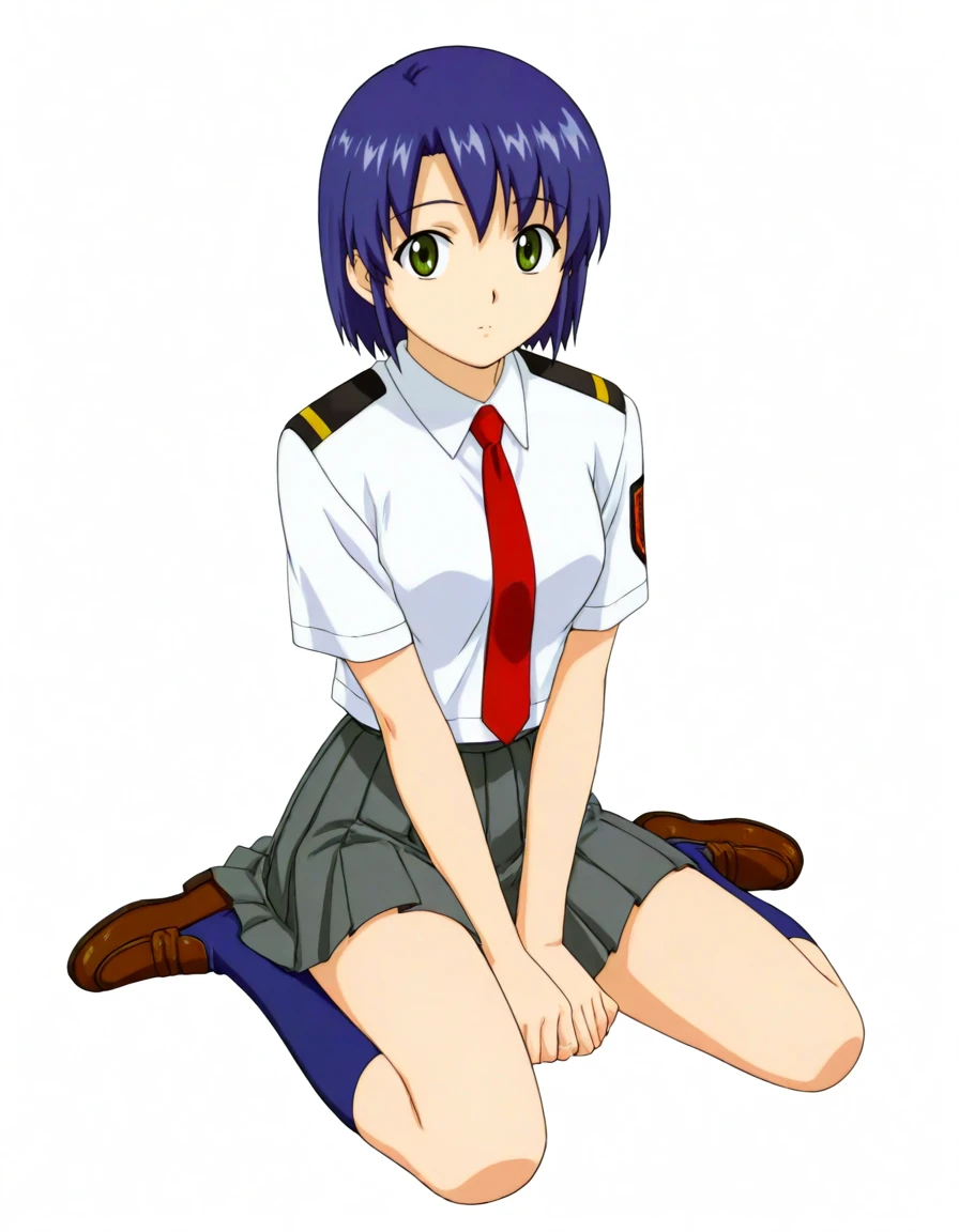 kikuhara karin, short hair, dark-blue hair, green eyes, school uniform, white shirt, short sleeves, red necktie, pleated skirt, dark gray skirt, kneehighs, dark blue socks, loafers, emblem on left sleeve, epaulettes,