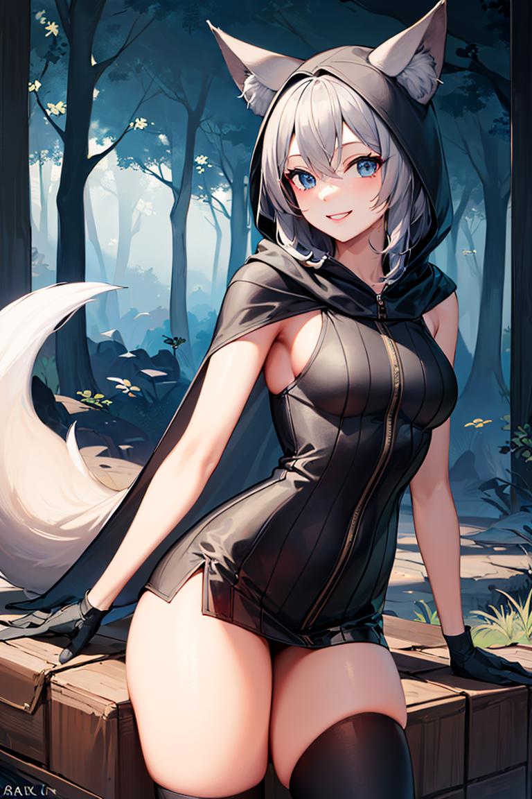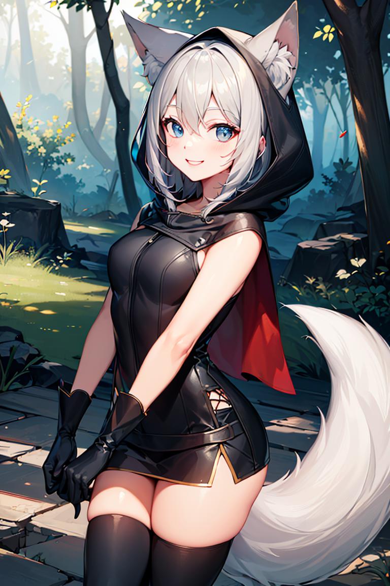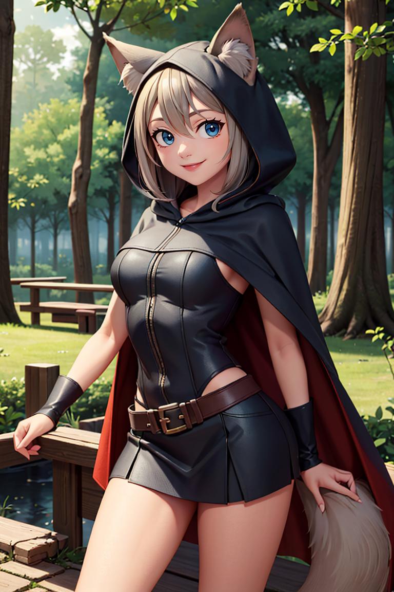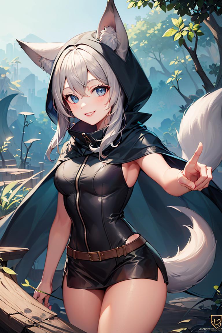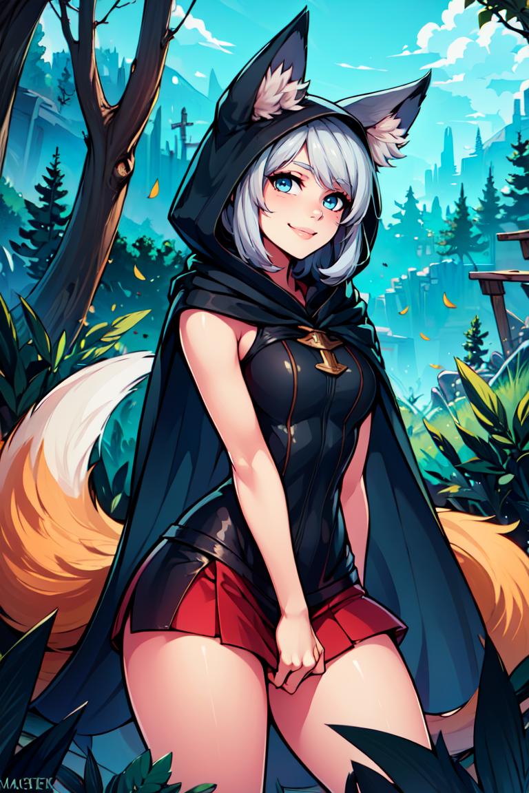 Extra prompts: cape, fox tail, hood up, mini skirt,