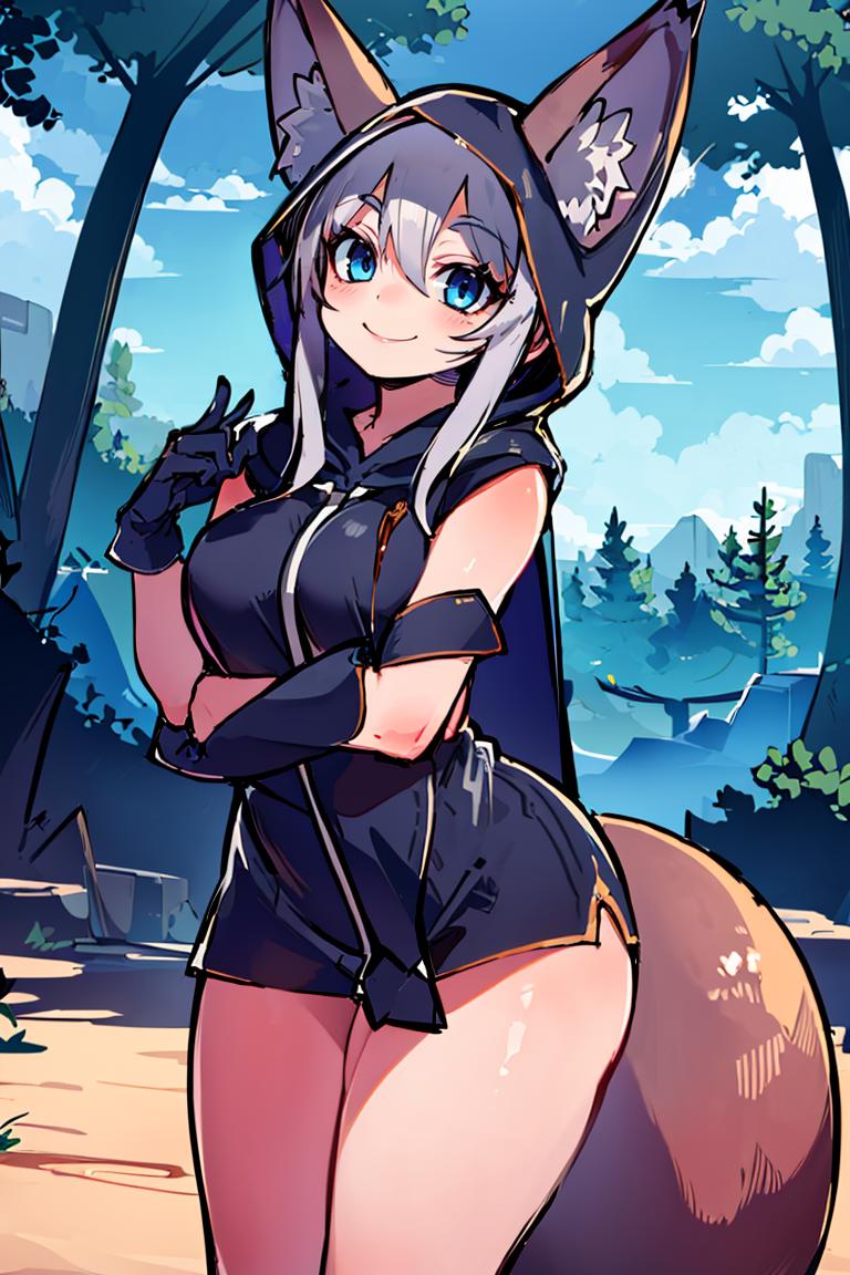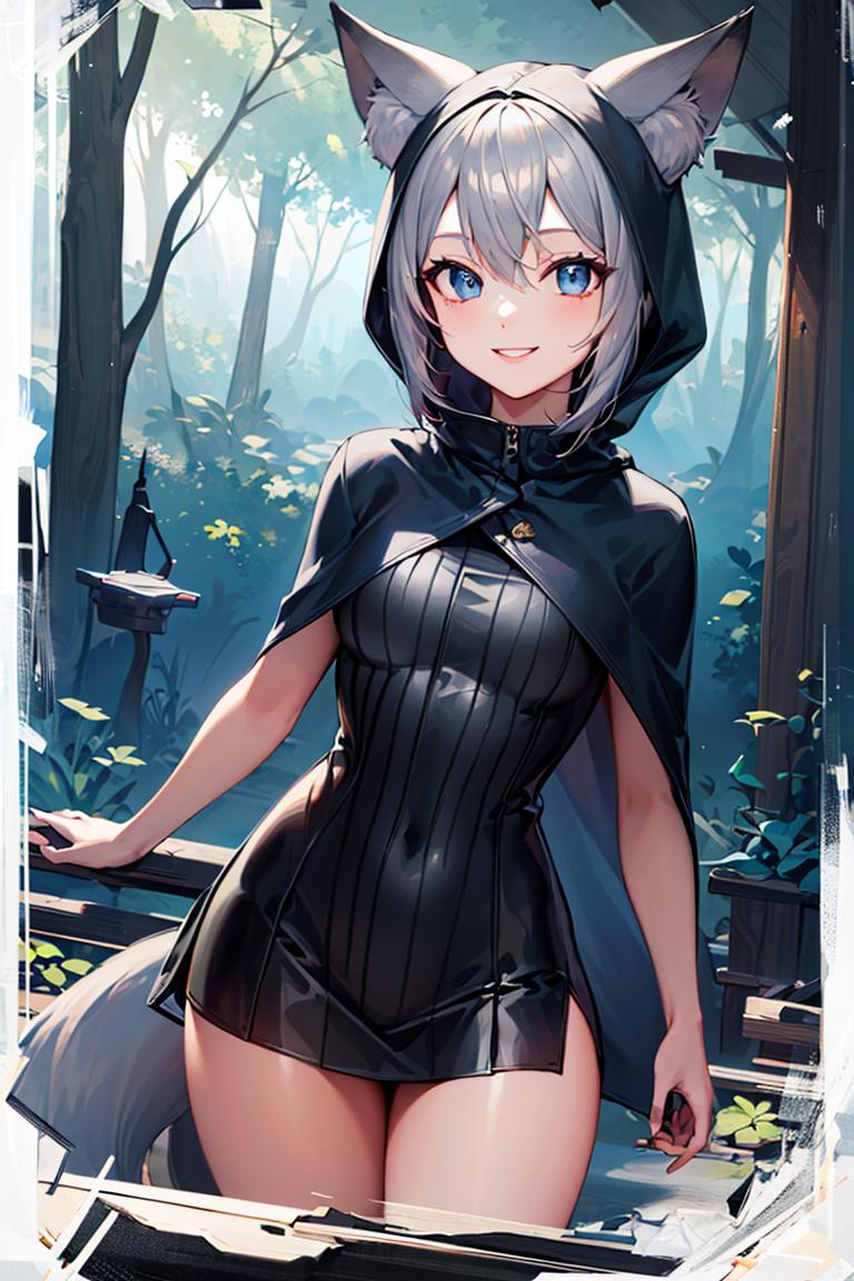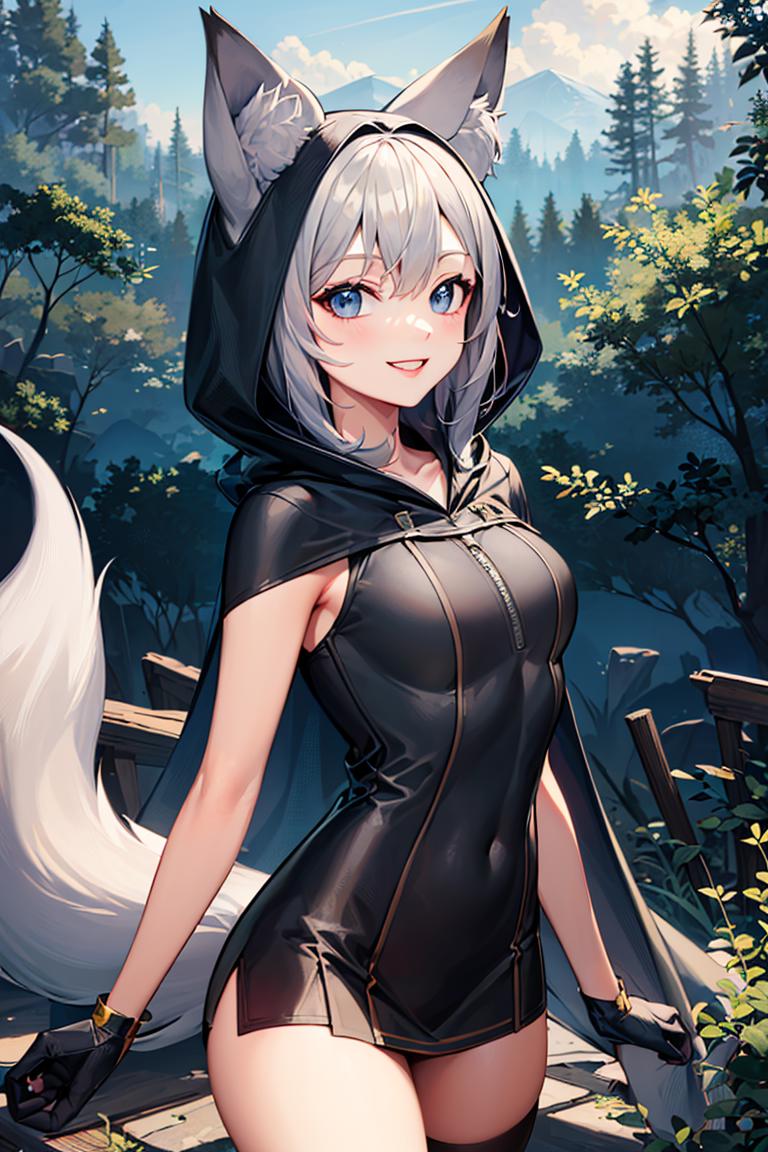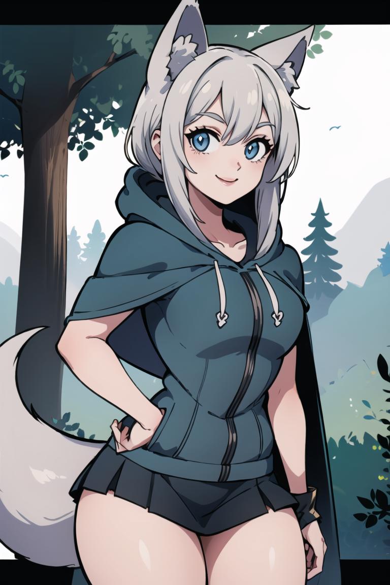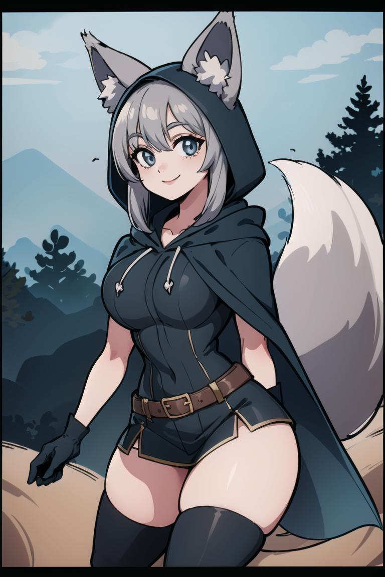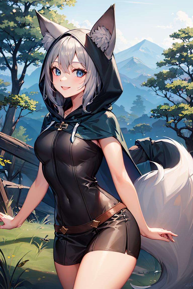 Extra prompts: cape, fox tail, hood up, mini skirt,