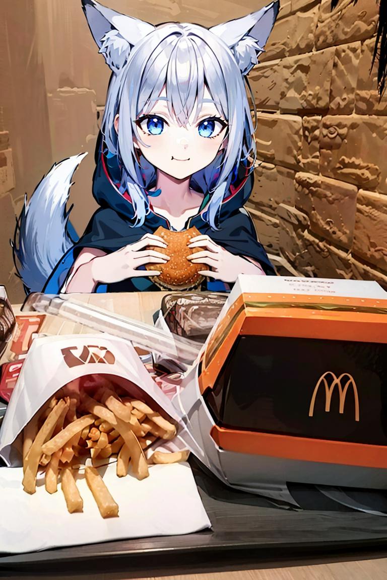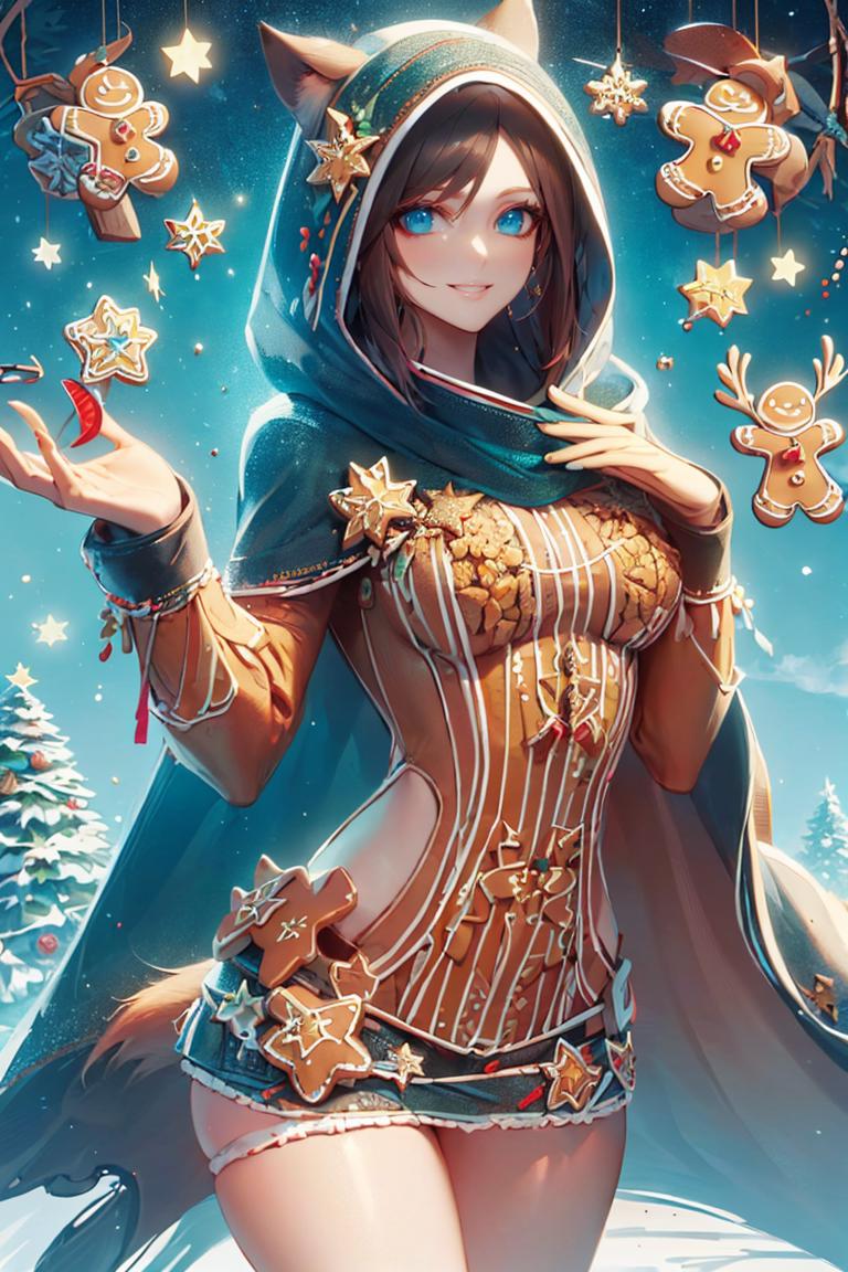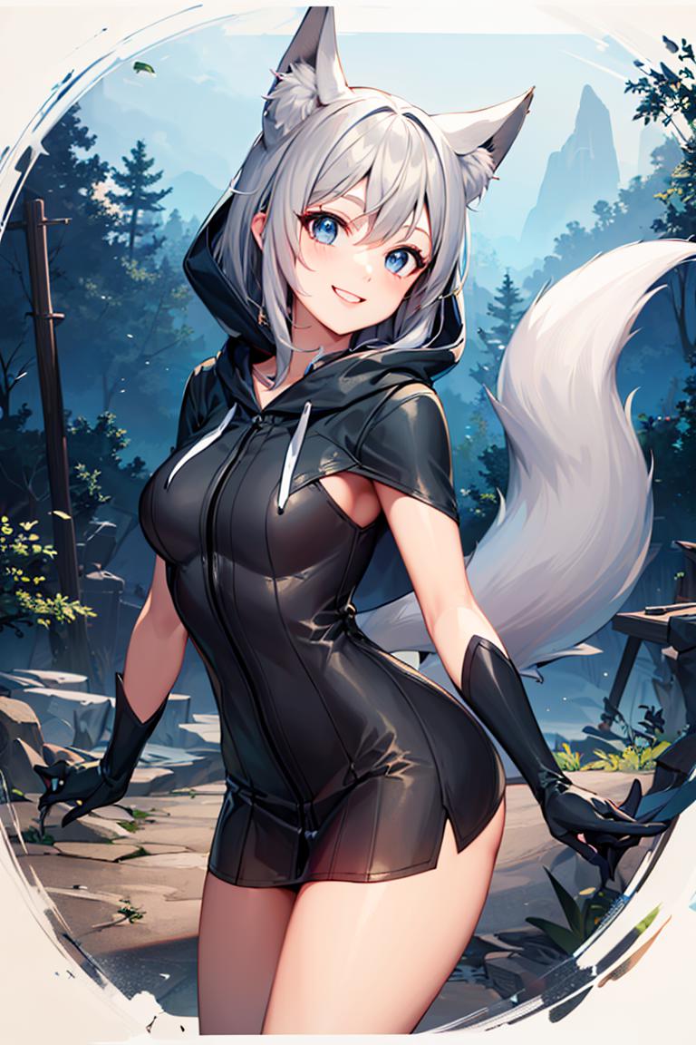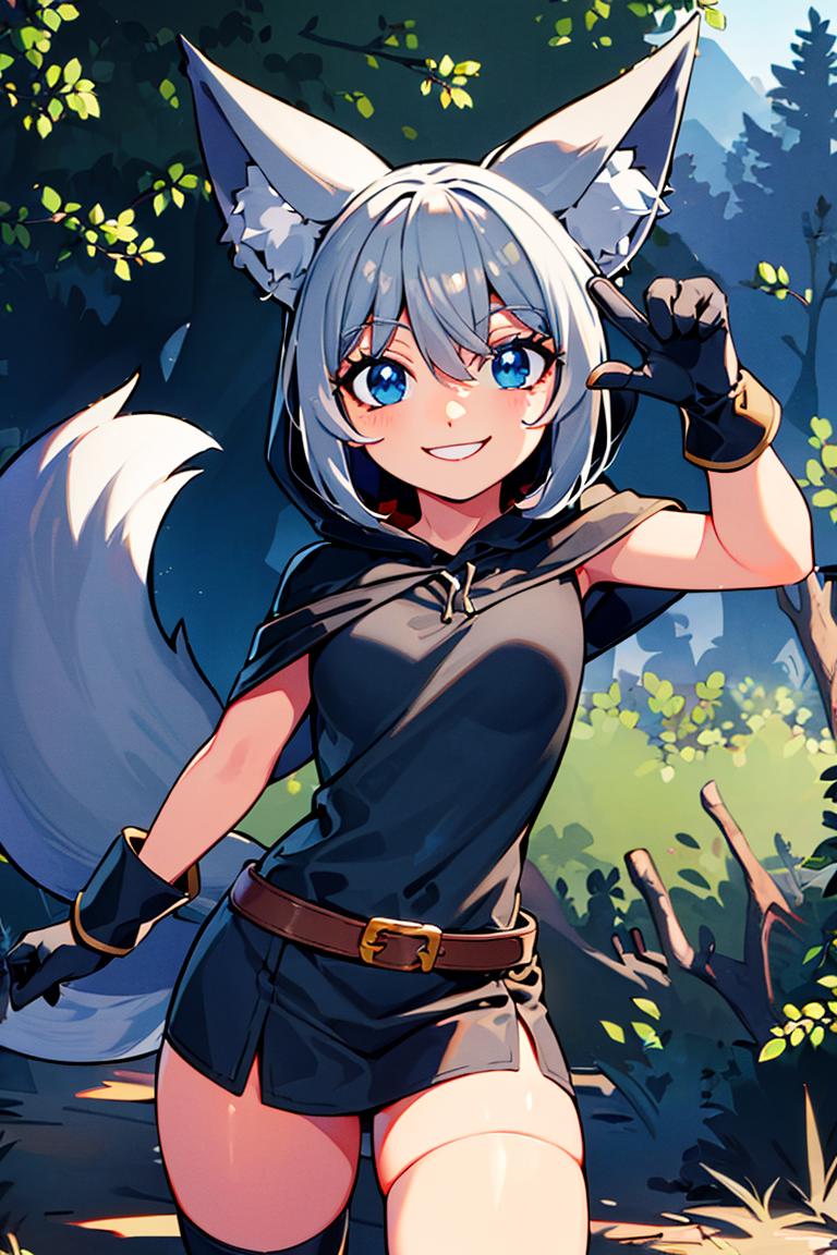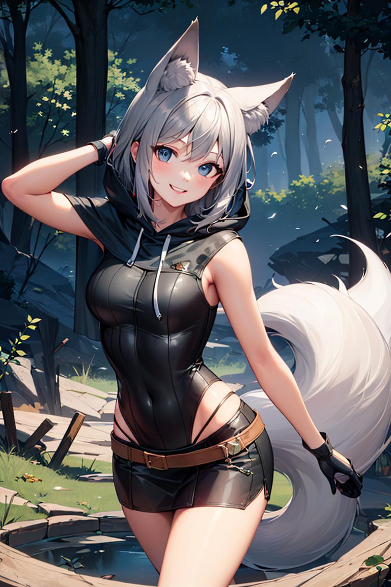 Extra prompts: cape, fox tail, hood up, mini skirt,