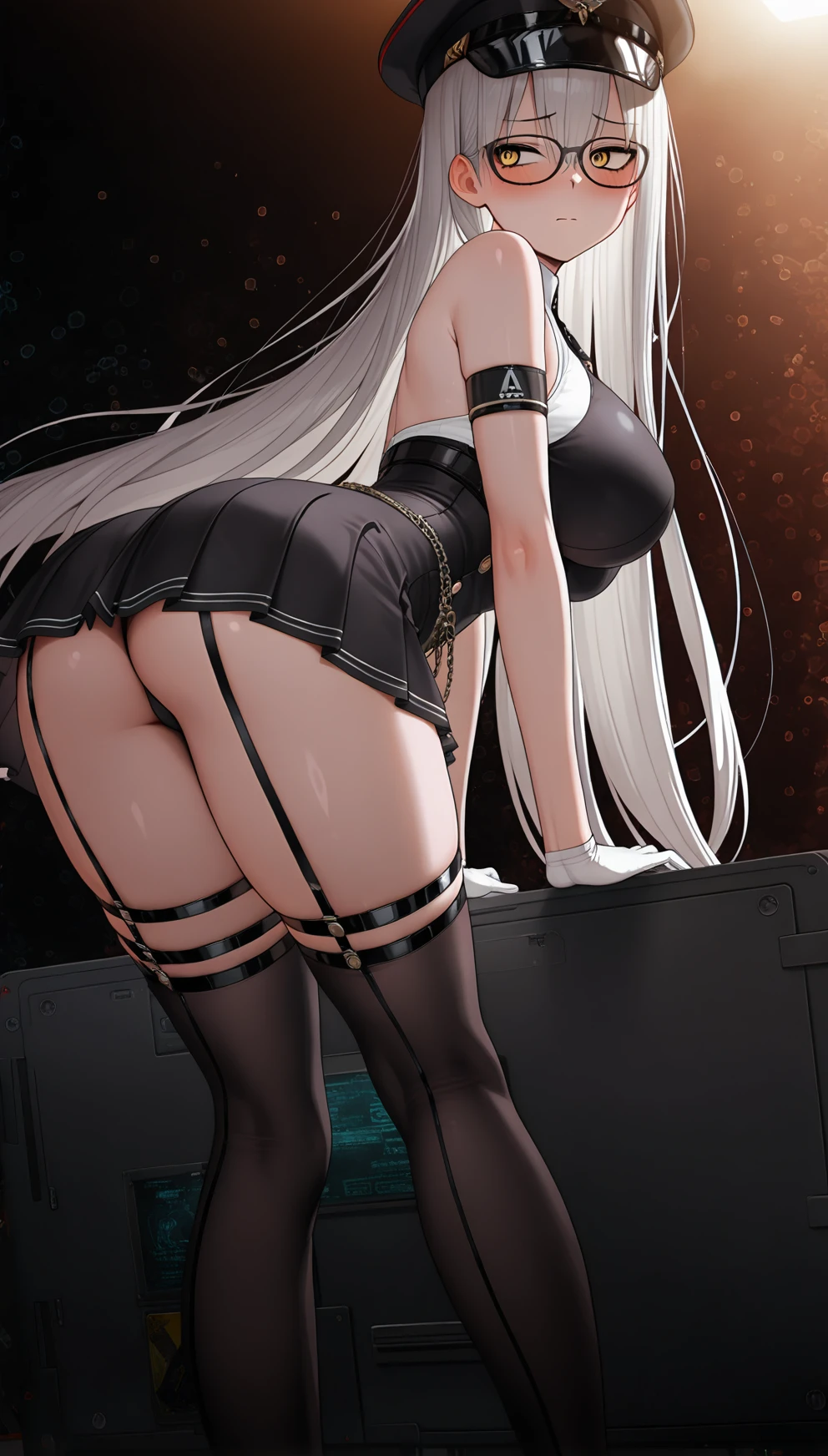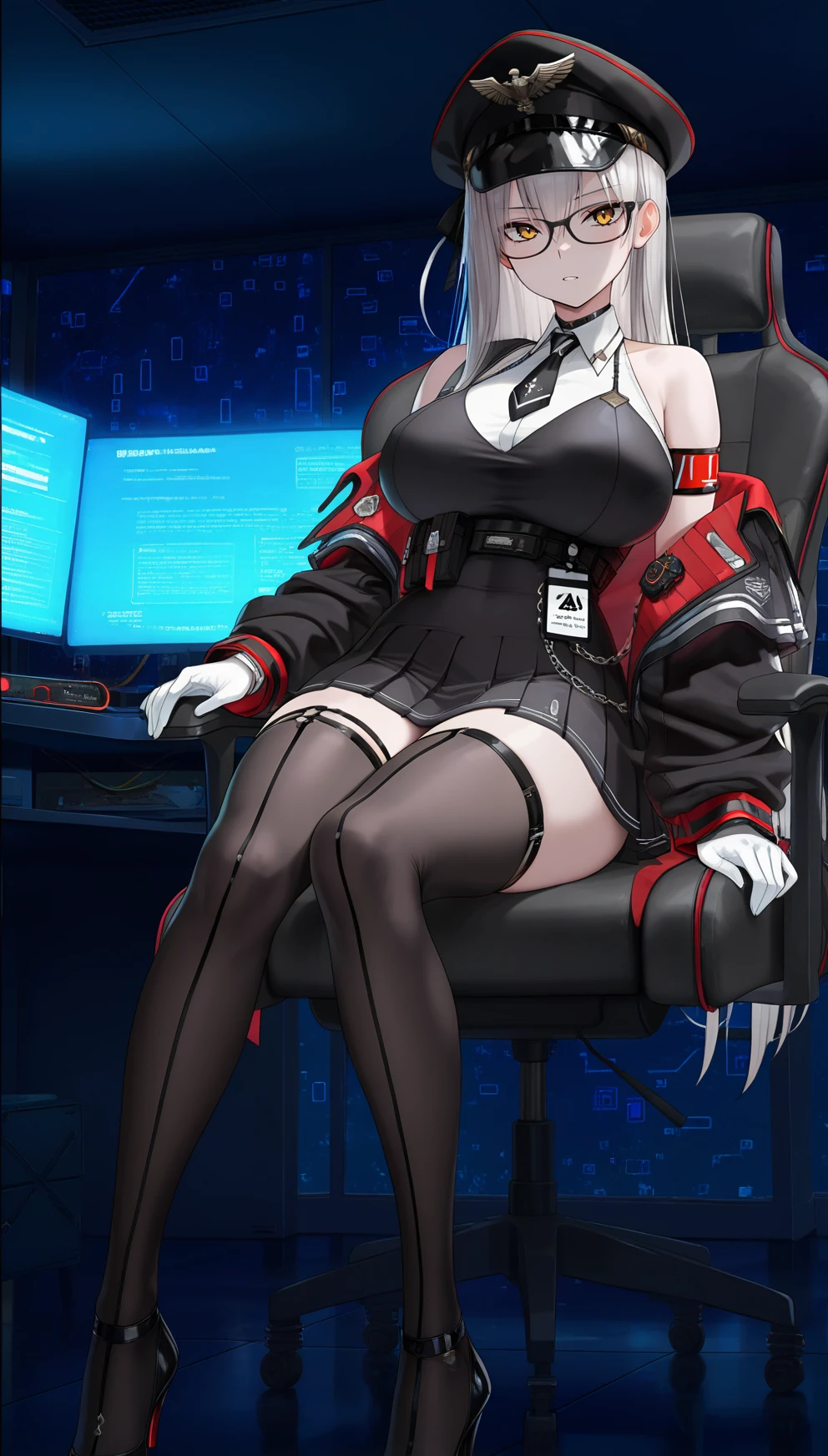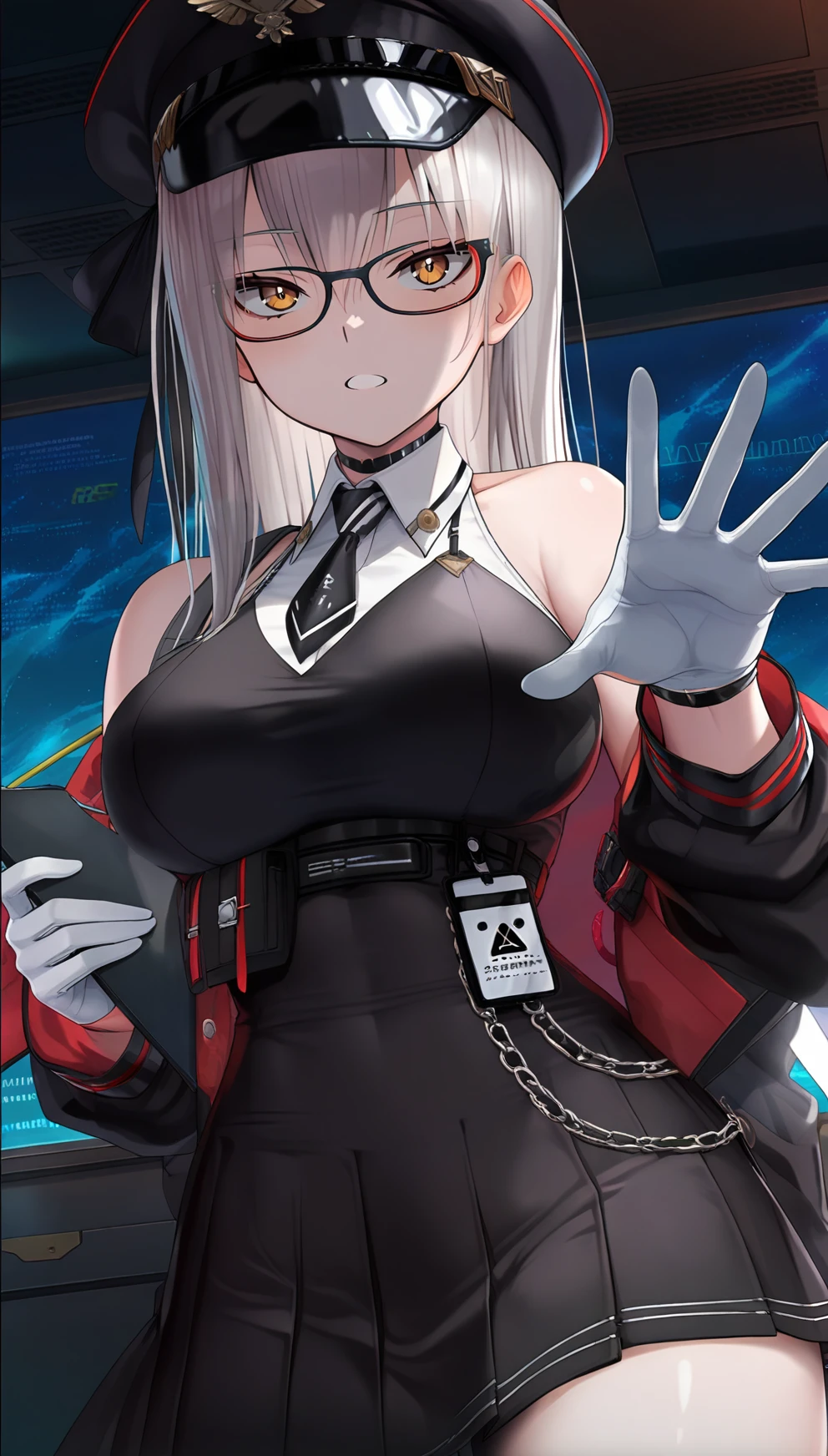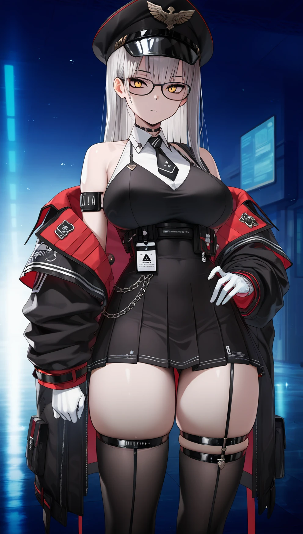 long hair, breasts, bangs, large breasts, white hair, blunt bangs, yellow eyes, glasses, peaked cap, thighhighs, bare shoulders, jacket, thighs,, white gloves, off shoulder, , thigh strap, armband, high-waist skirt, underbust,, open jacket, black necktie, necktie,