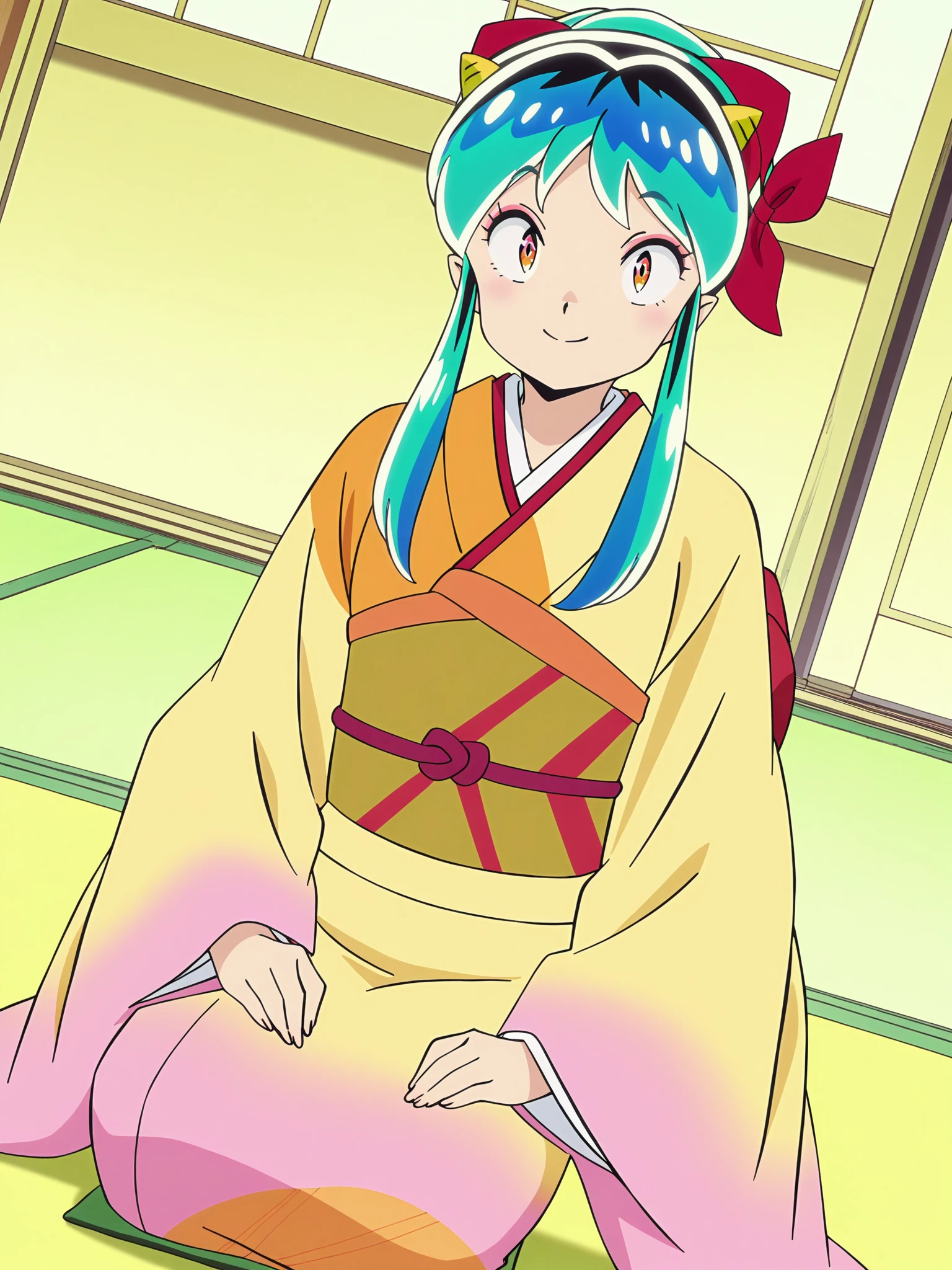 1girl, solo, lum, long hair, green hair, aqua hair, multicolor hair, orange eyes, eyeshadow, oni, horns