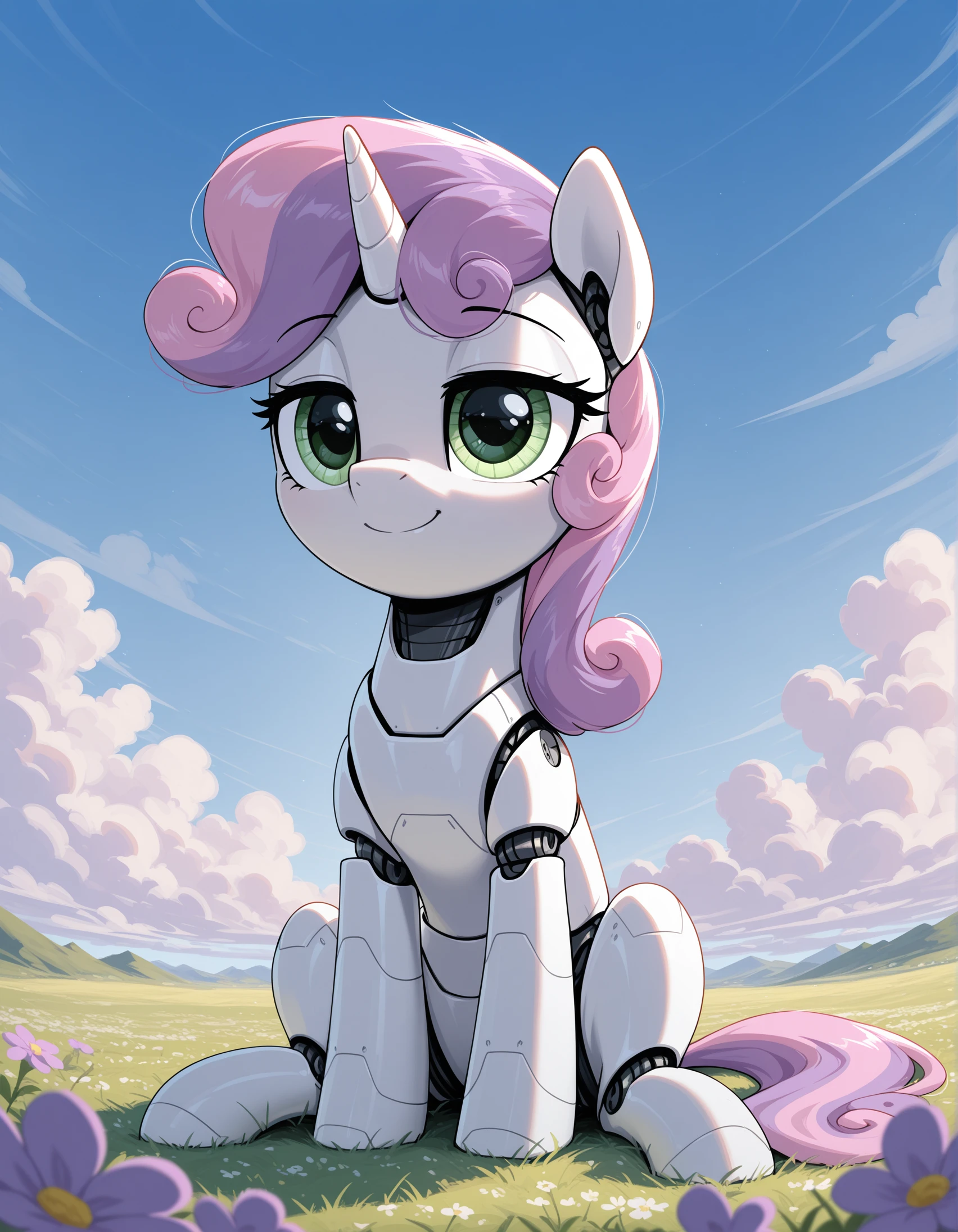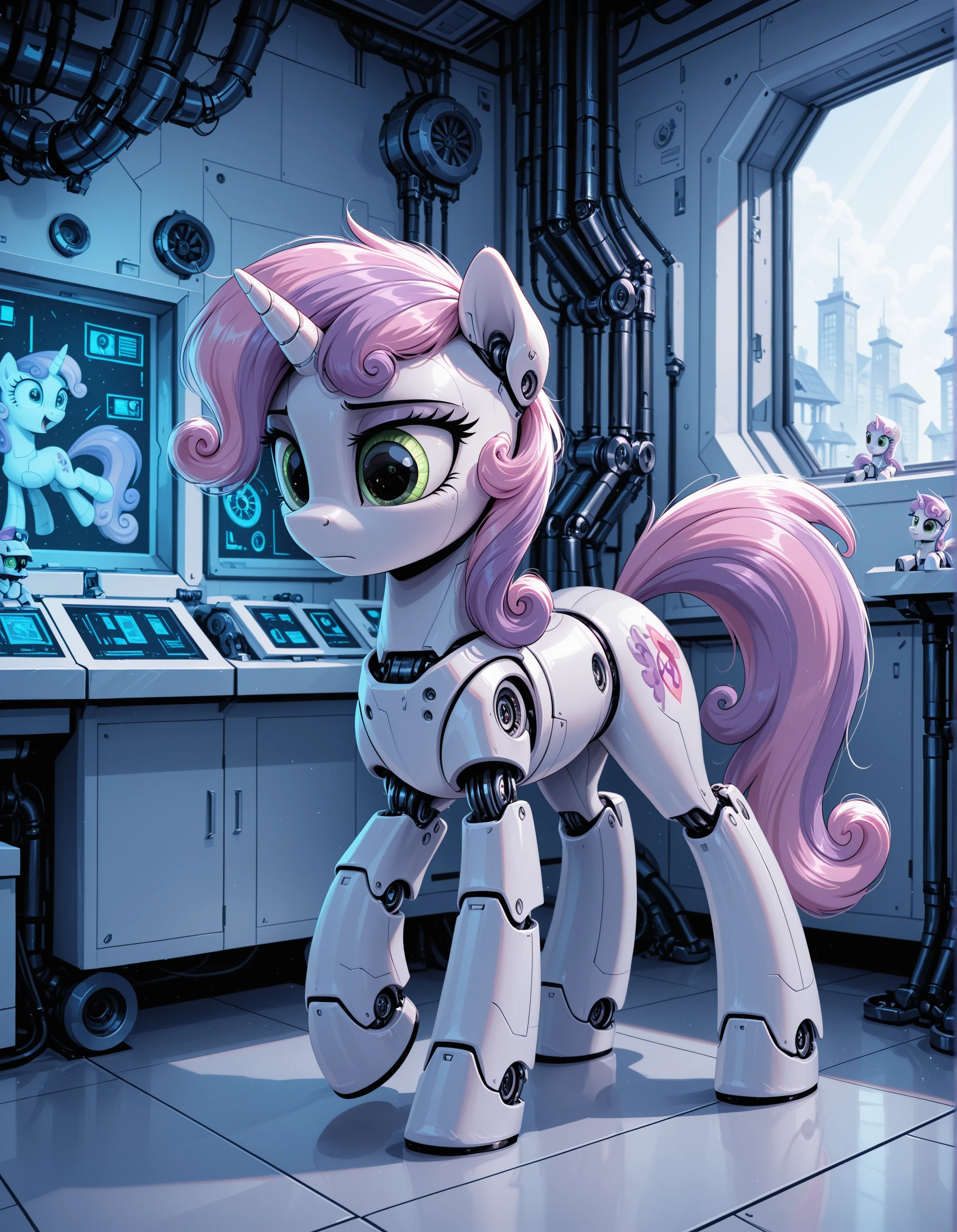 Sweetie Bot pony, robot, unicorn, white body, green eyes, robotic body, mechanical joints