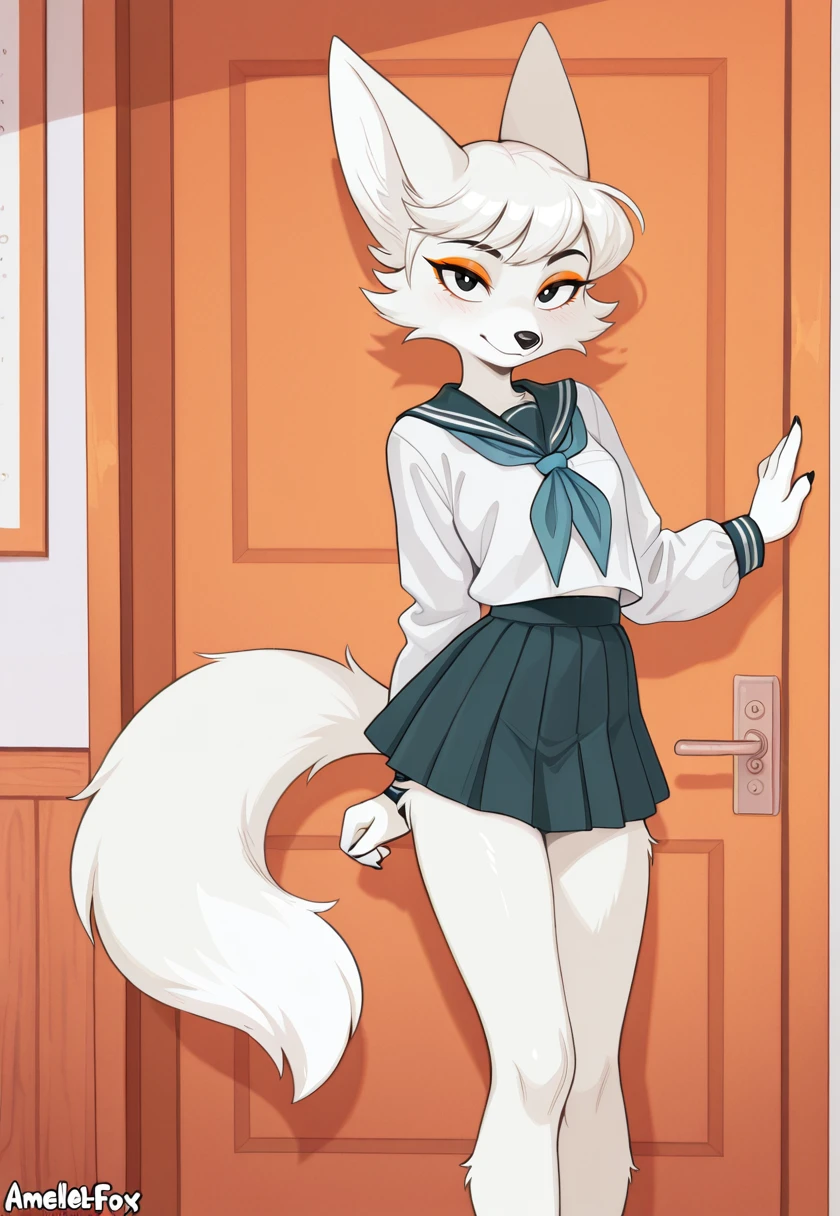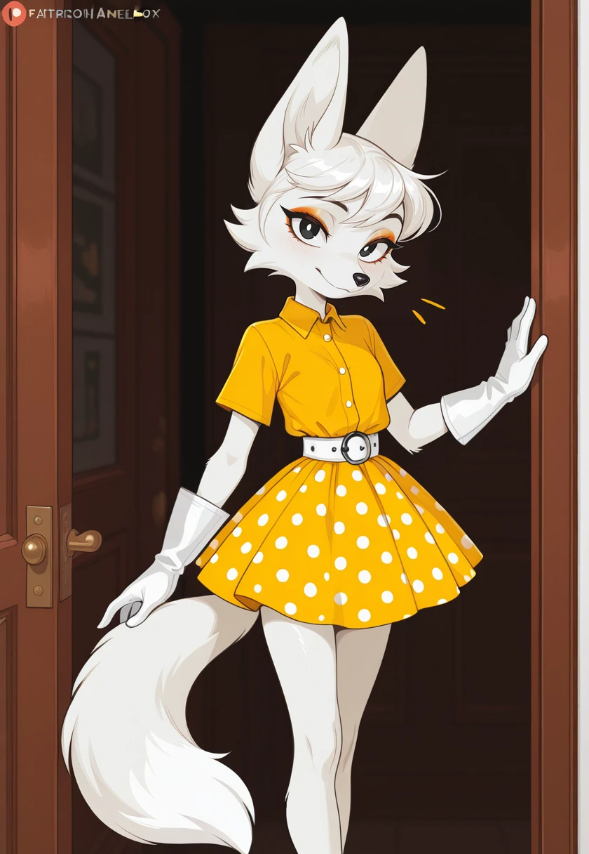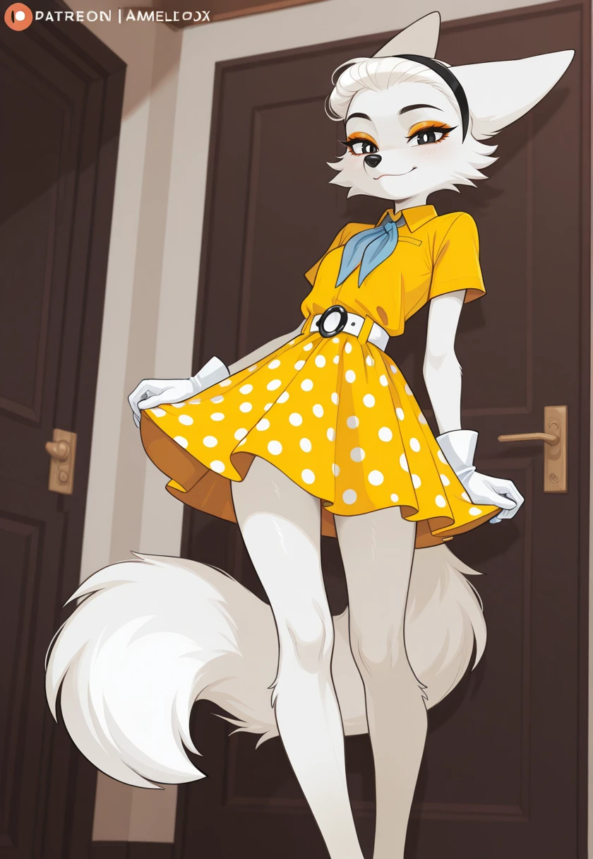 Amelie, anthro fox, furry female, white fur, white gloves, black nose, yellow shirt, black eyes, yellow skirt with polka dot, white waist belt, black bezel, short sleeves, orange makeup