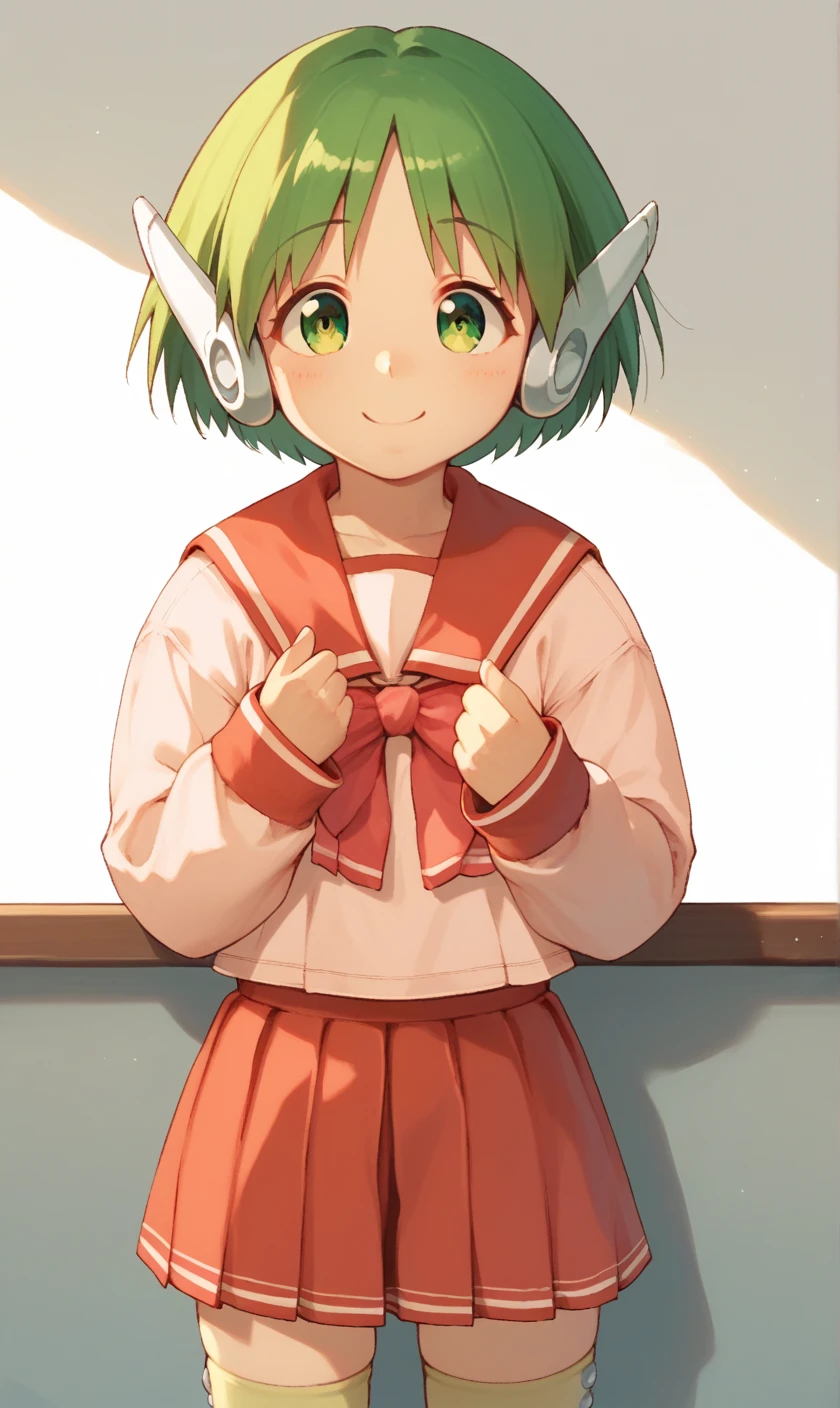 multi \(to heart\), 1girl, solo, green hair, robot ears, serafuku, red skirt, thighhighs, red sailor collar, long sleeves, red bowtie