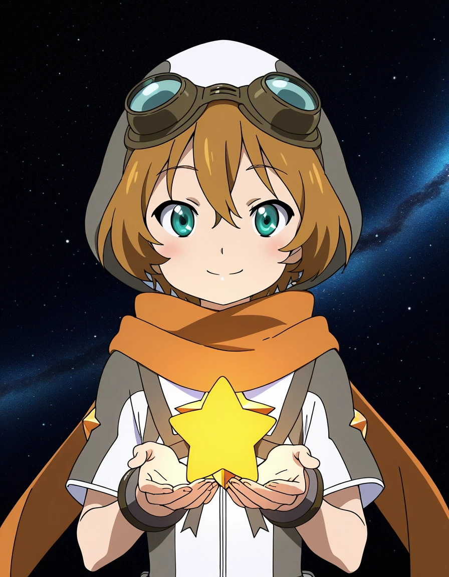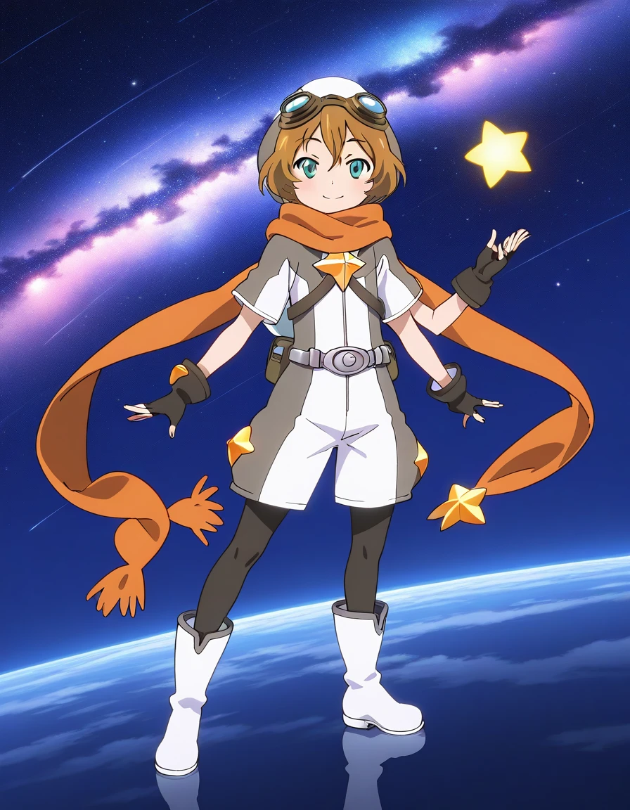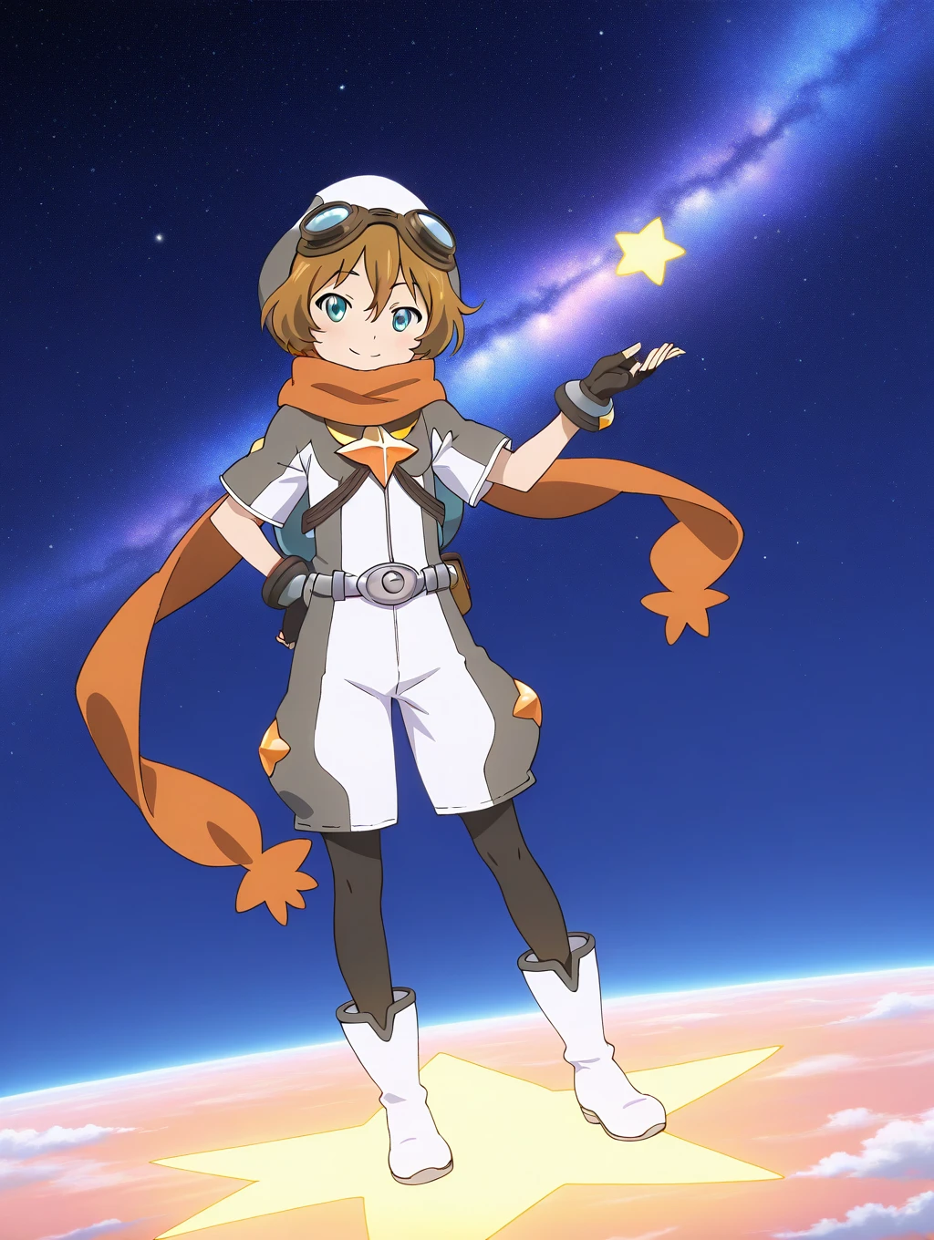 Elnath(Pleiades), 1boy, solo, scarf, goggles, brown hair, goggles on head, short hair, blue eyes, star (symbol), hat, anime coloring, male child,