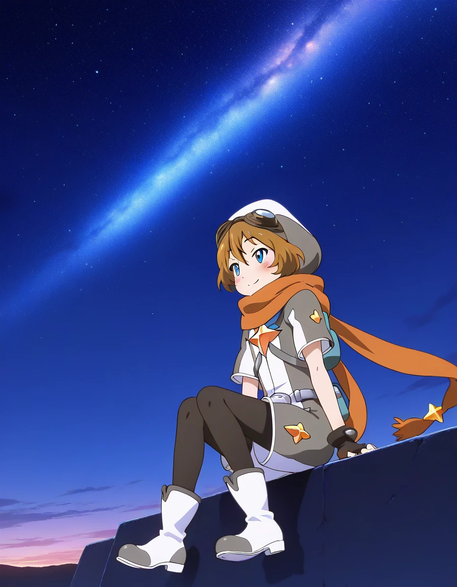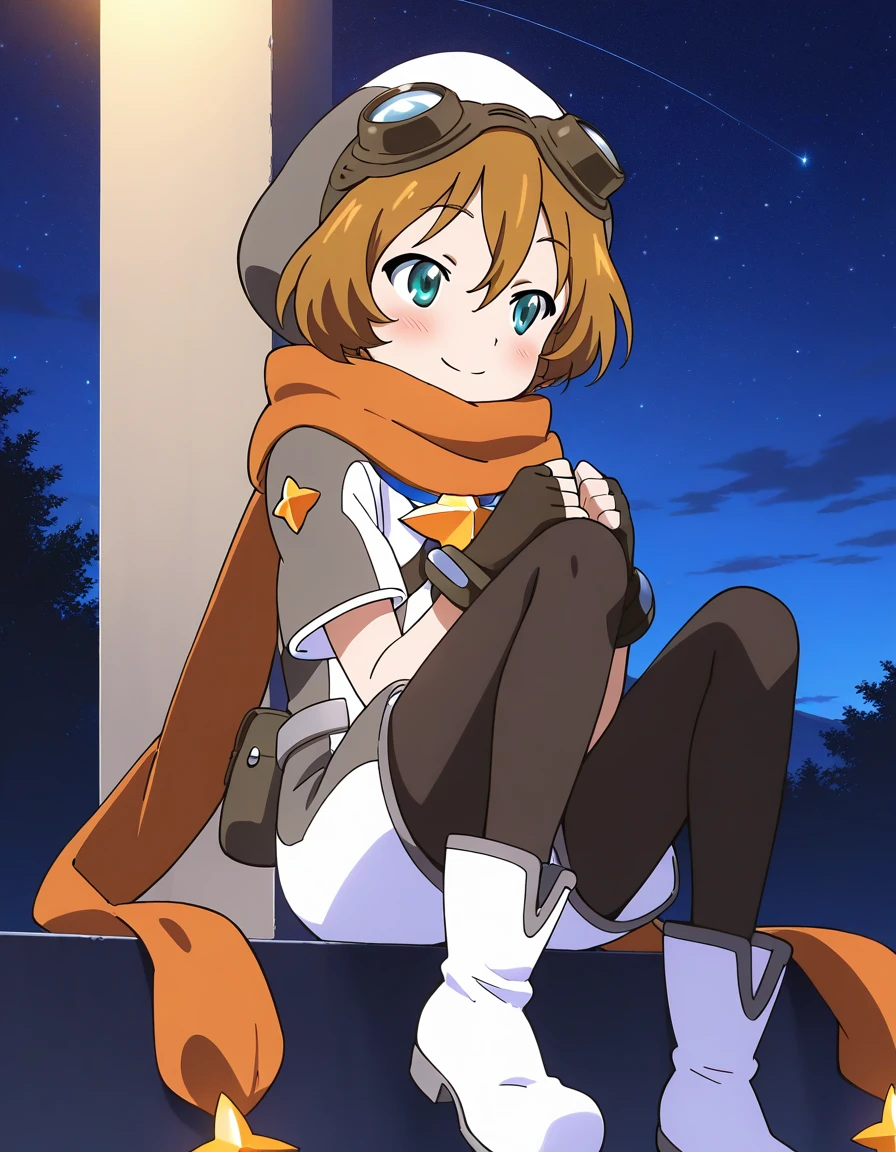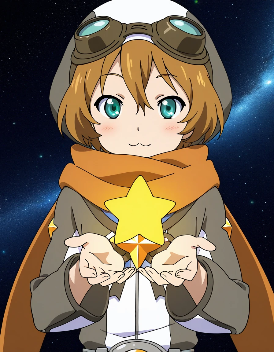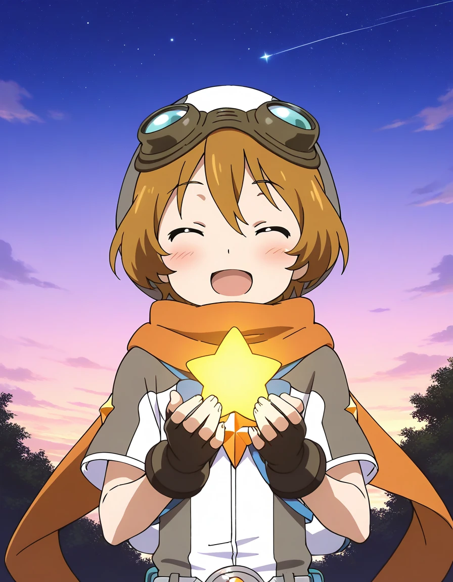 Elnath(Pleiades), 1boy, solo, scarf, goggles, brown hair, goggles on head, short hair, blue eyes, star (symbol), hat, anime coloring, male child,