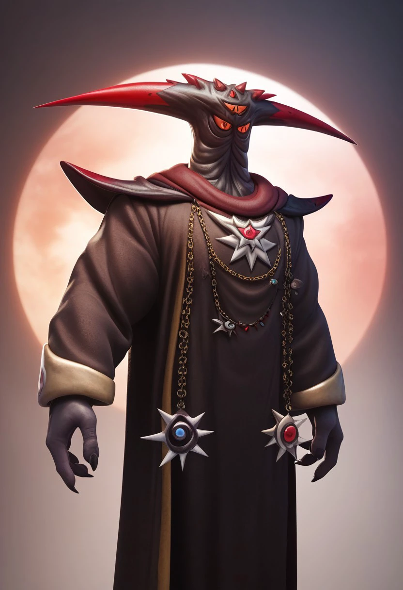 Black Doom, jet black legless body with three red eyes, two wide horns with red tips, three-fingered claws, dark brown robe, symbol, jewelry