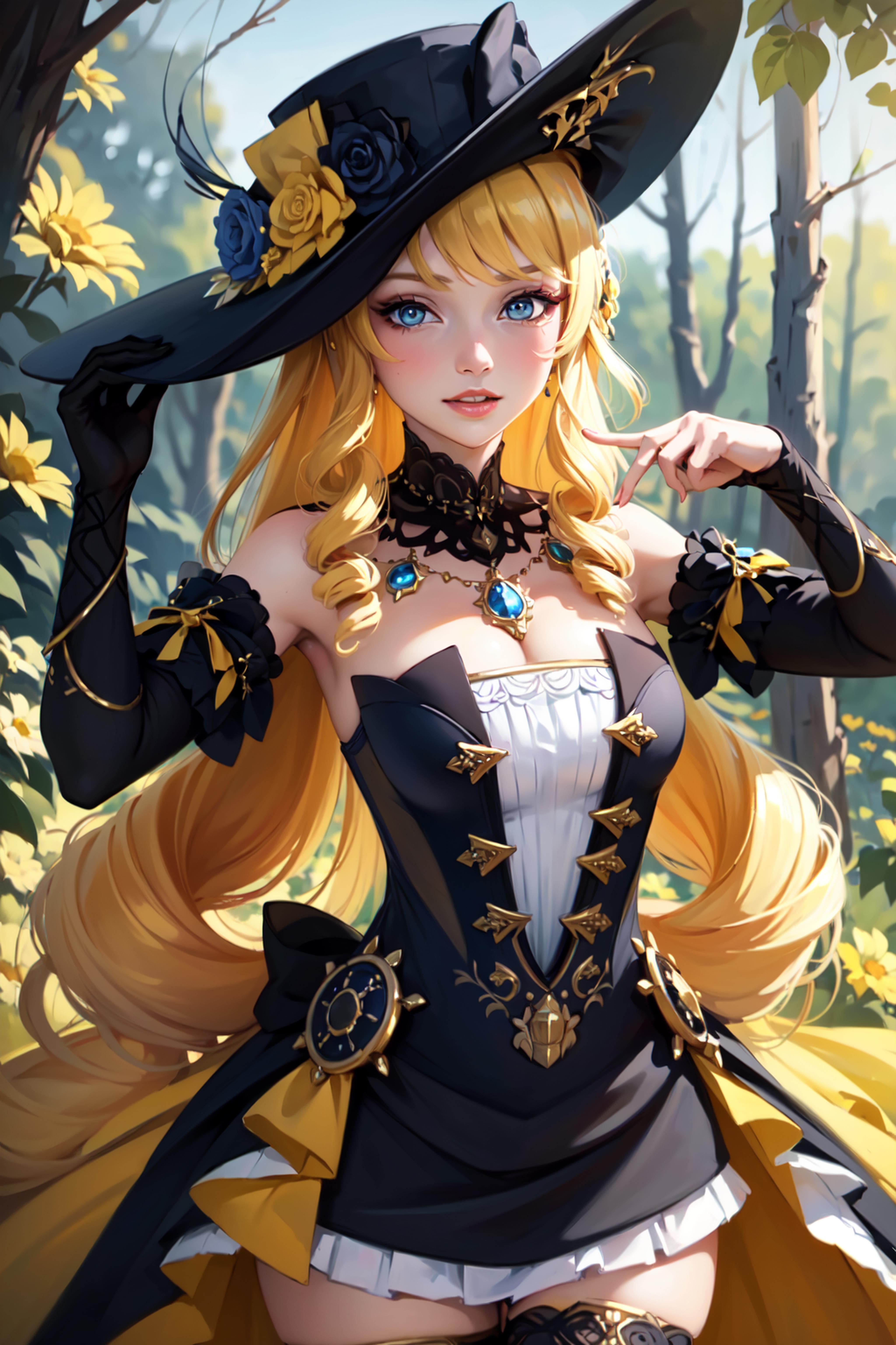Navia, Yellow frills, Long hair, Black dress, Light blue eyes, Yellow hair, Yellow arm ribbons, Yellow long layer, (Black stockings:1.1), wide Hat with flowers