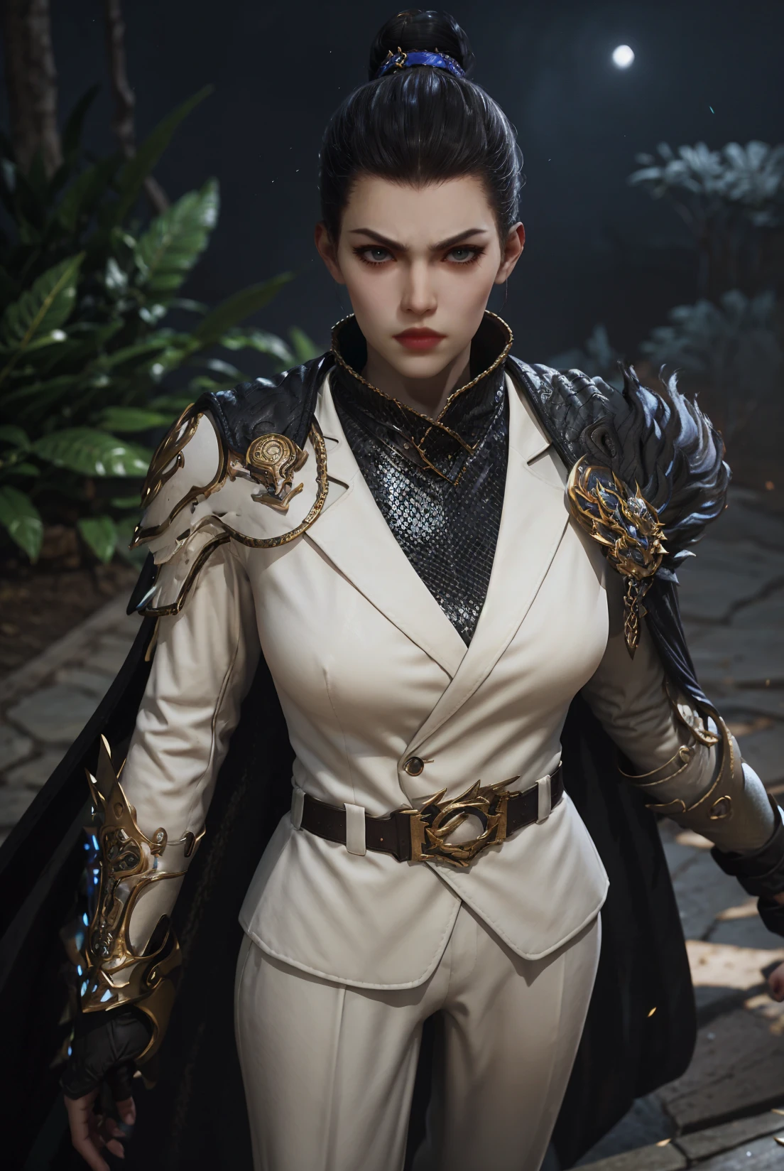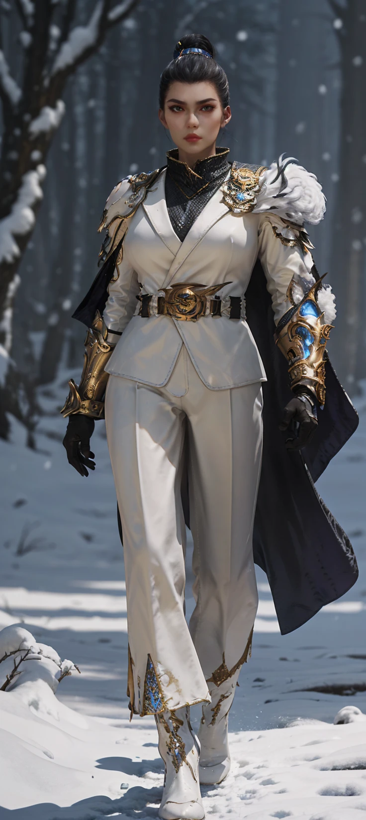 Clothing prompt: hair ornament, jewelry, suit, long sleeves, cape, chainmail, (armor:1.2), (arm armor:1.2), shoulder armor, gloves, plume, belt, pants, nylon socks, high heels.