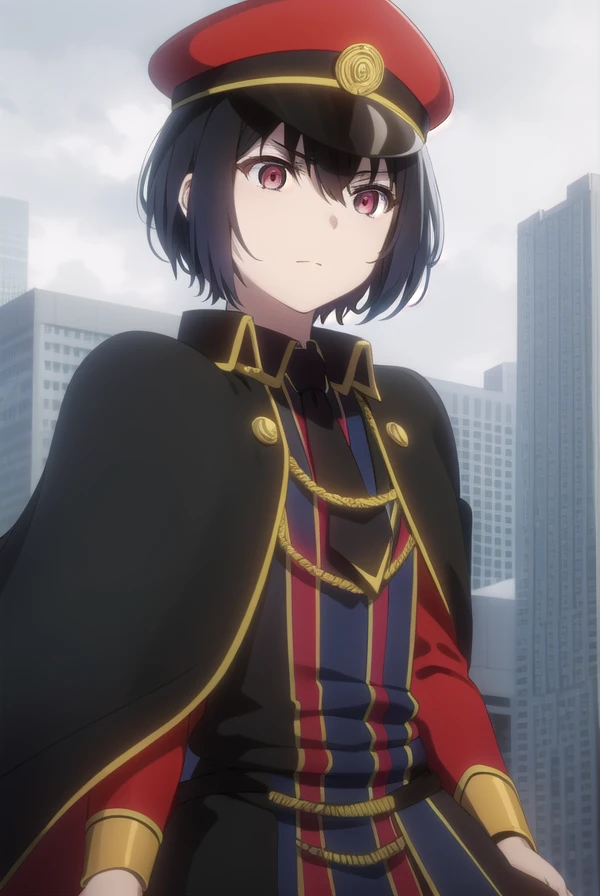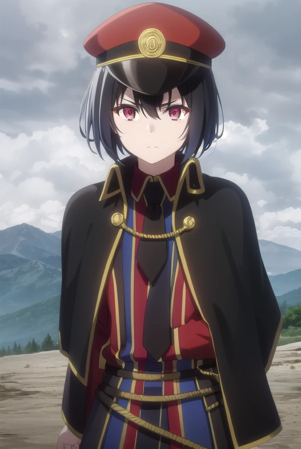 hat, pantyhose, necktie, cape, uniform, black pantyhose, military, military uniform, peaked cap, black necktie, military hat, black cape,