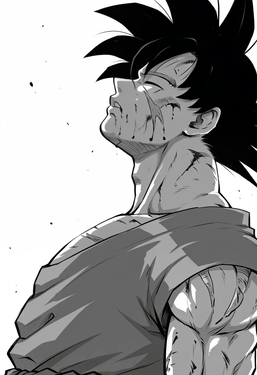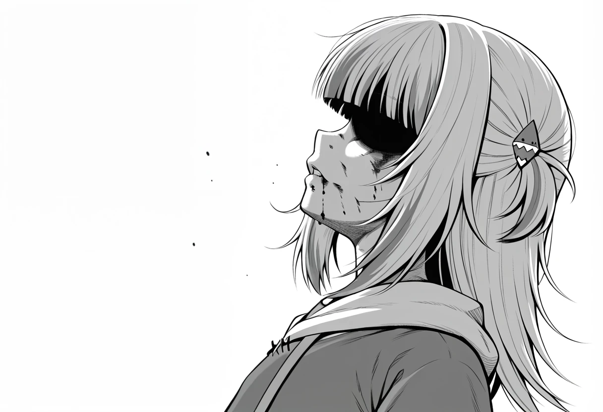kanekistatus, greyscale, injury, blood, blood on face, blood on arm, cuts, bruise, covered eyes, no eyes, leaning back, looking up, from side, profile, upper body, white background,