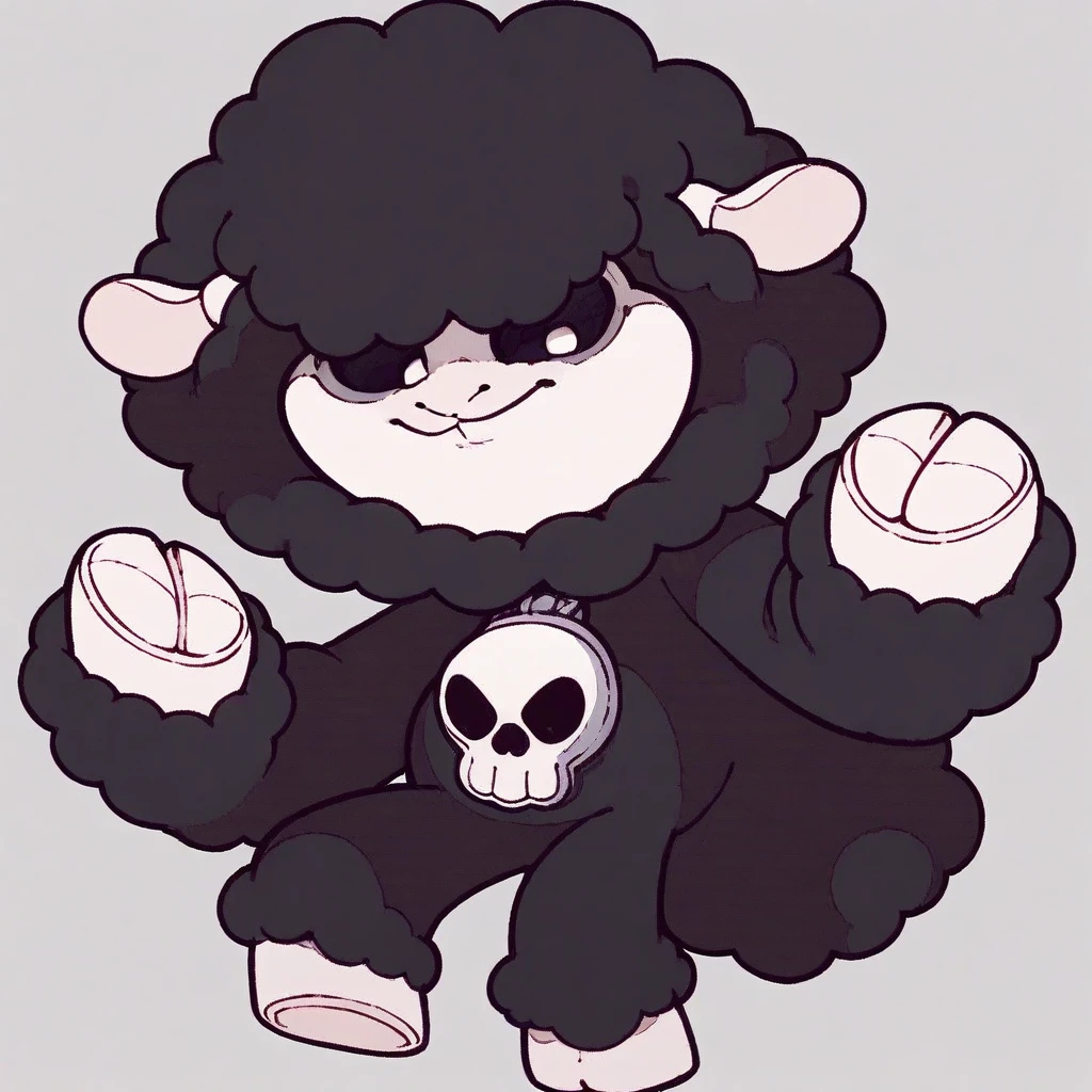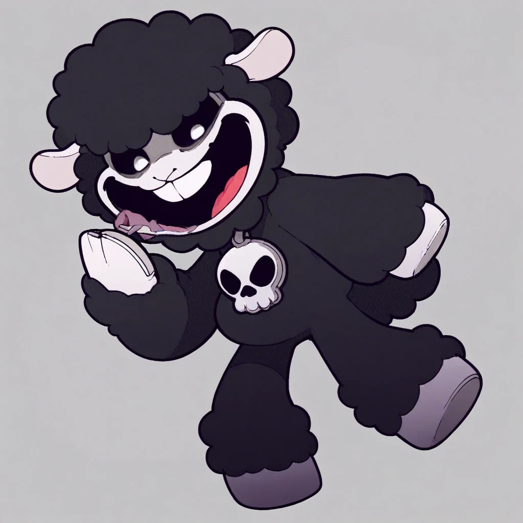 black fur, sheep, anthro, furry, black sclera, white pupils, cartoony, white feet, white hooves, fluffy wooly body