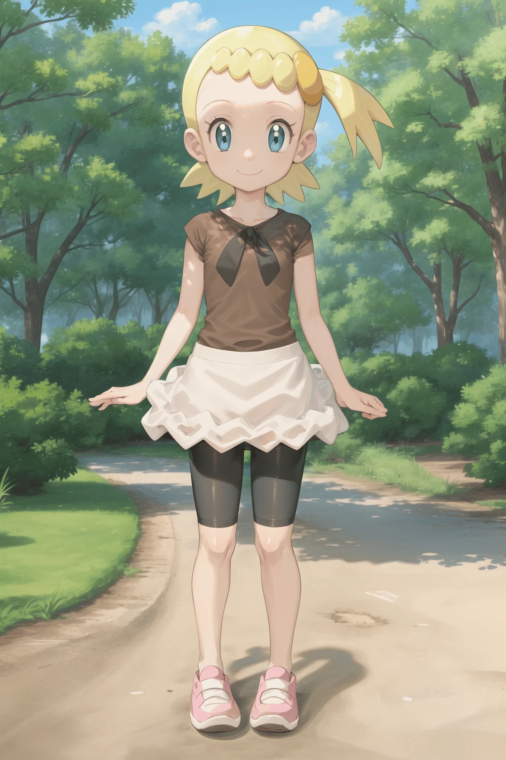 bonnie_pokemon, blonde hair, short hair, hair ornament, side ponytail, blue eyes, eyelashes, brown shirt, skirt, bike shorts, shoes, pink footwear