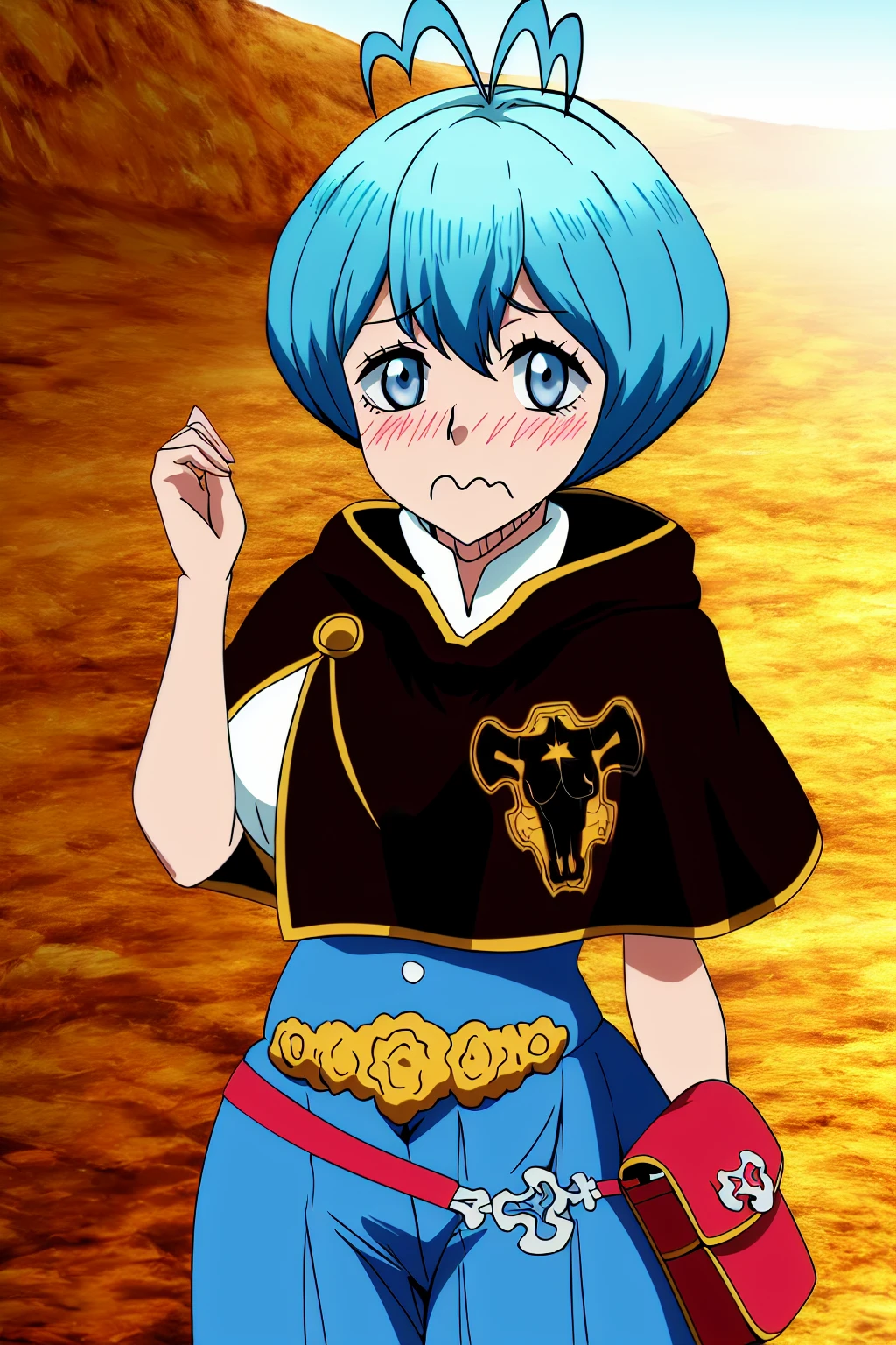 grey_bc, sleeveless shirt, blackbull-cape, emblem, antenna_hair, high-waisted pants, three-way belt, squared pouch