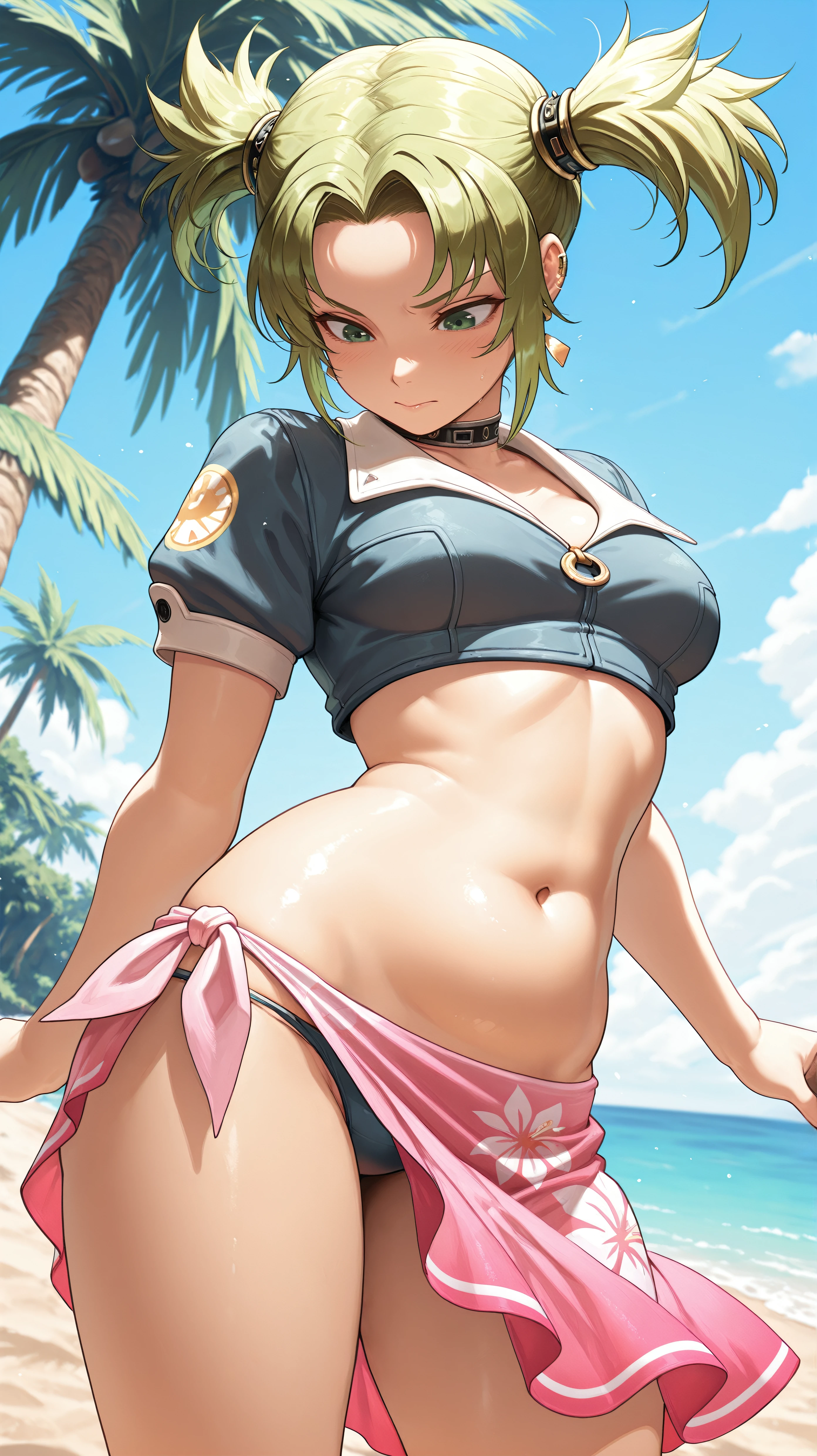 vibrant green hair, twintails, parted hair, green eyes, choker, collar, hair rings, earrings, sailor collar, long sleeves, white sleeves, wide sleeves, blue shirt, black skirt, one thigh strap, skull brooch,